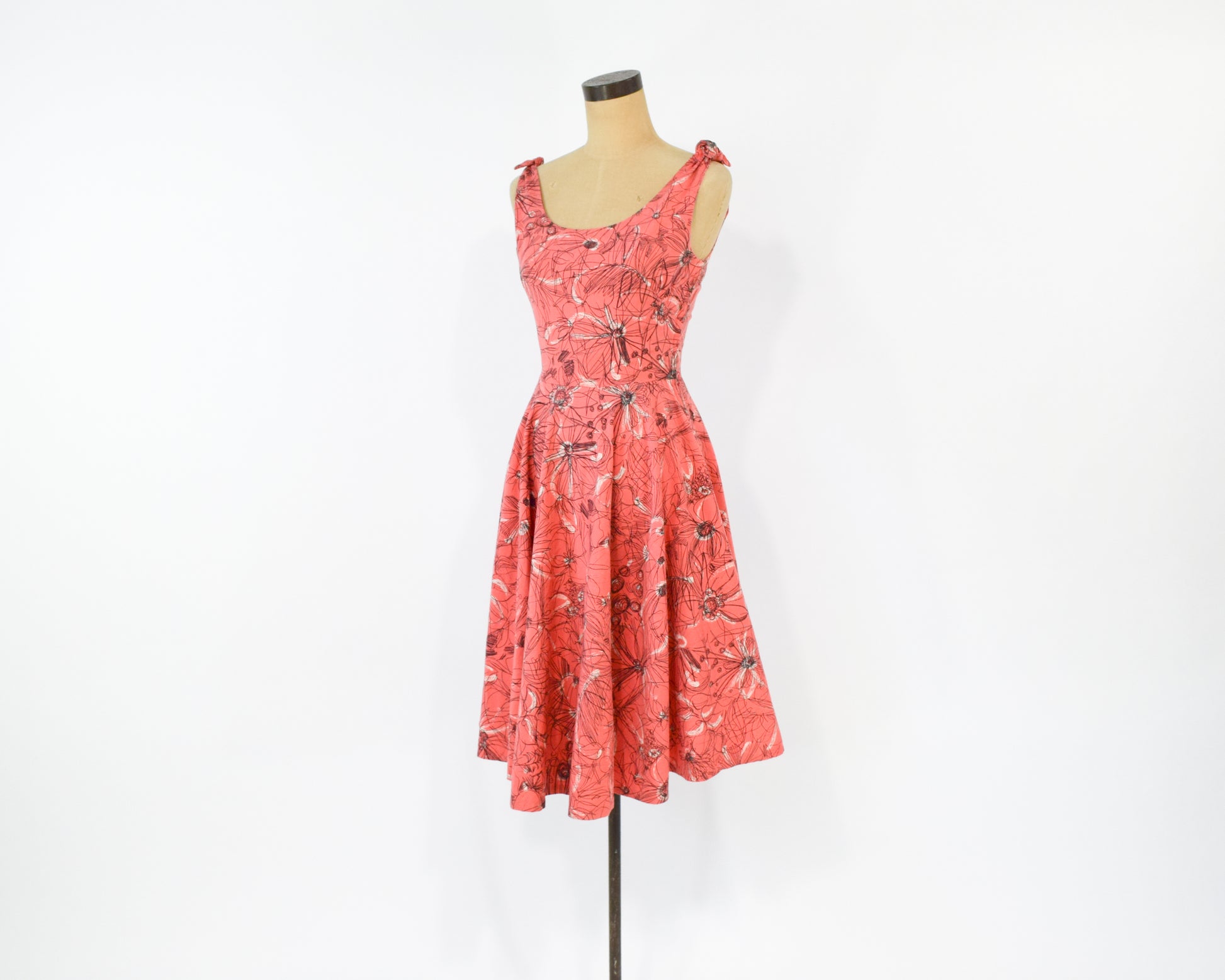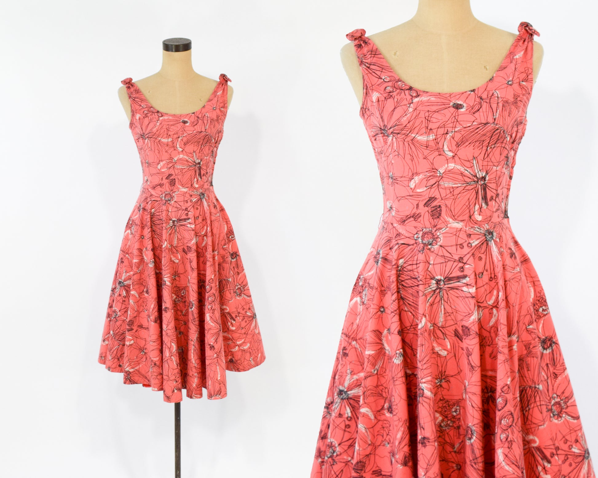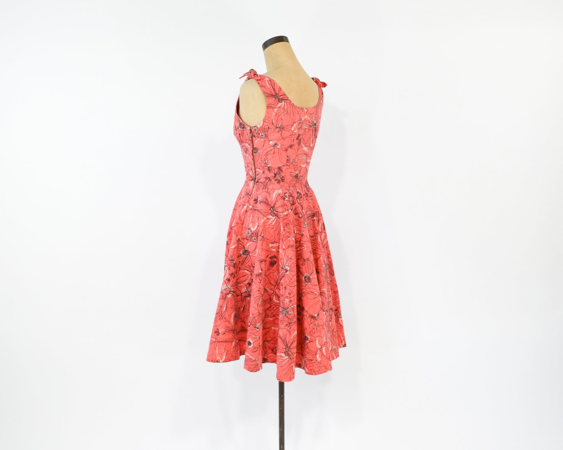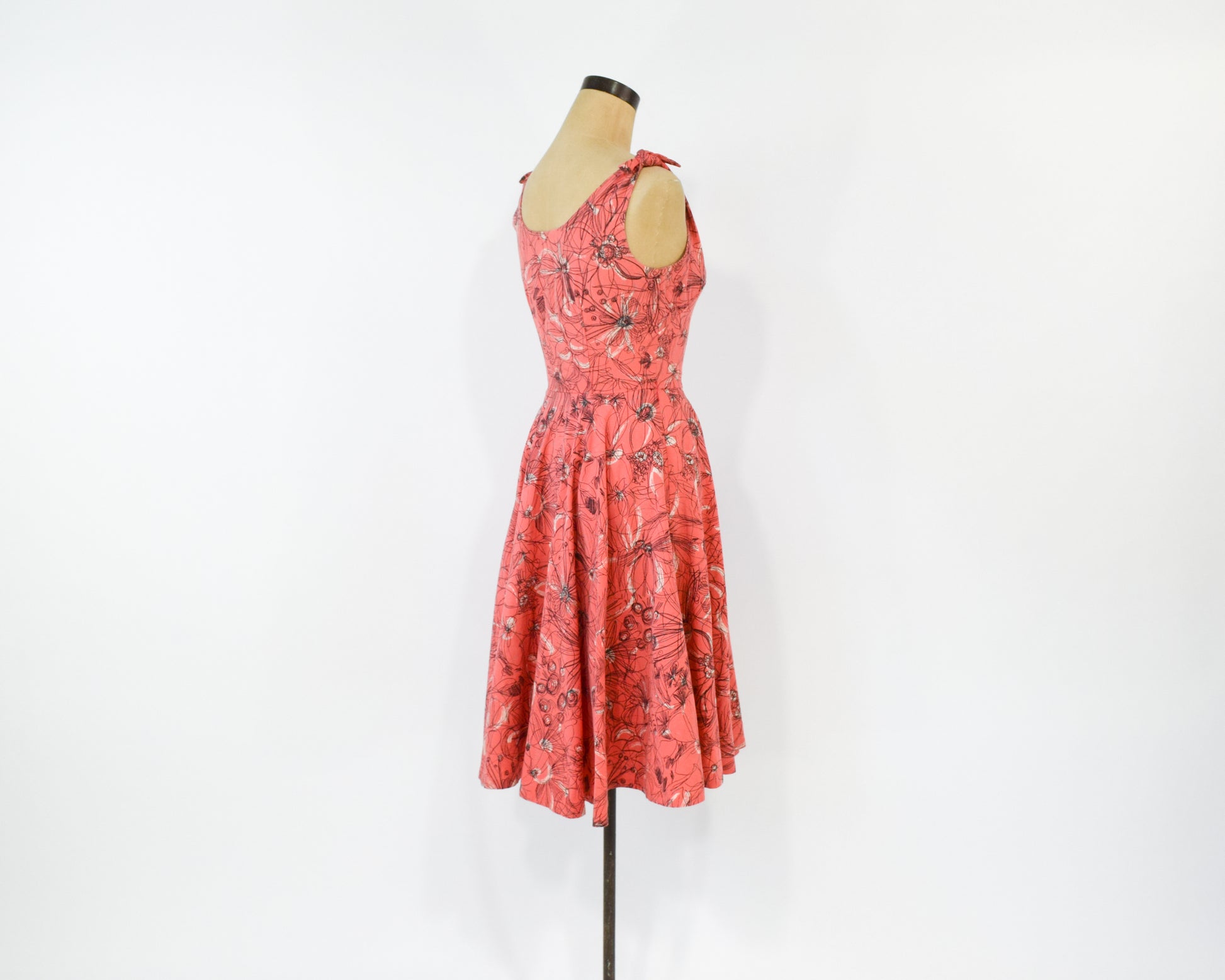 Brilliant geometric print cotton dress from the 1940s. Black and white on coral cotton with ties at the shoulders and a side metal zipper.