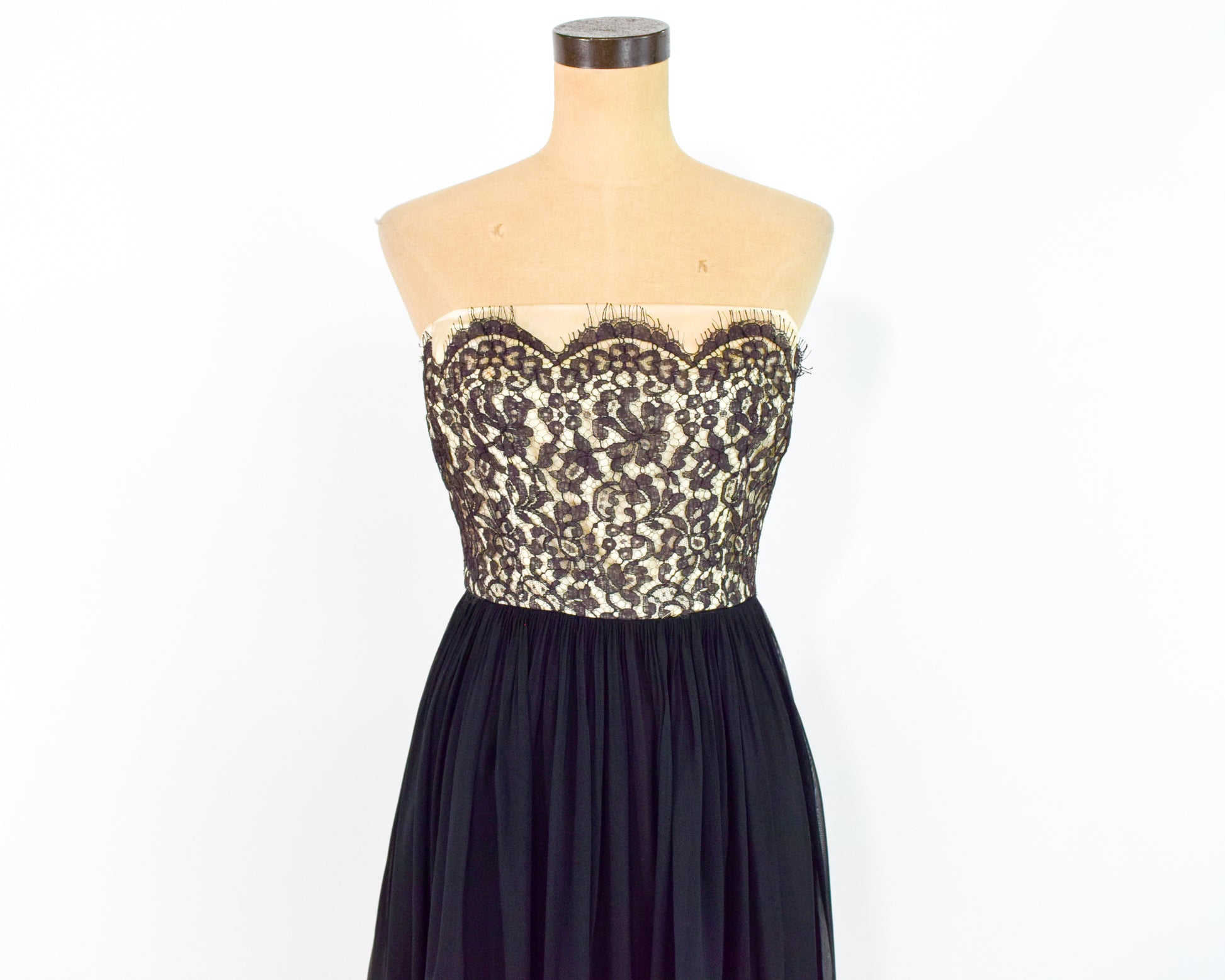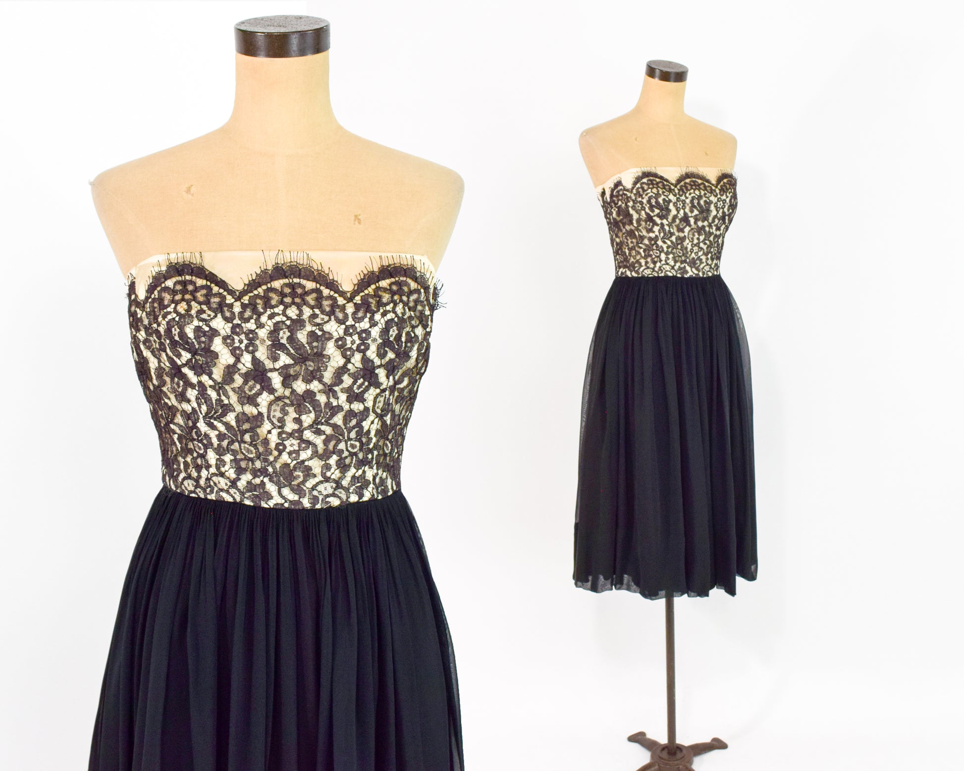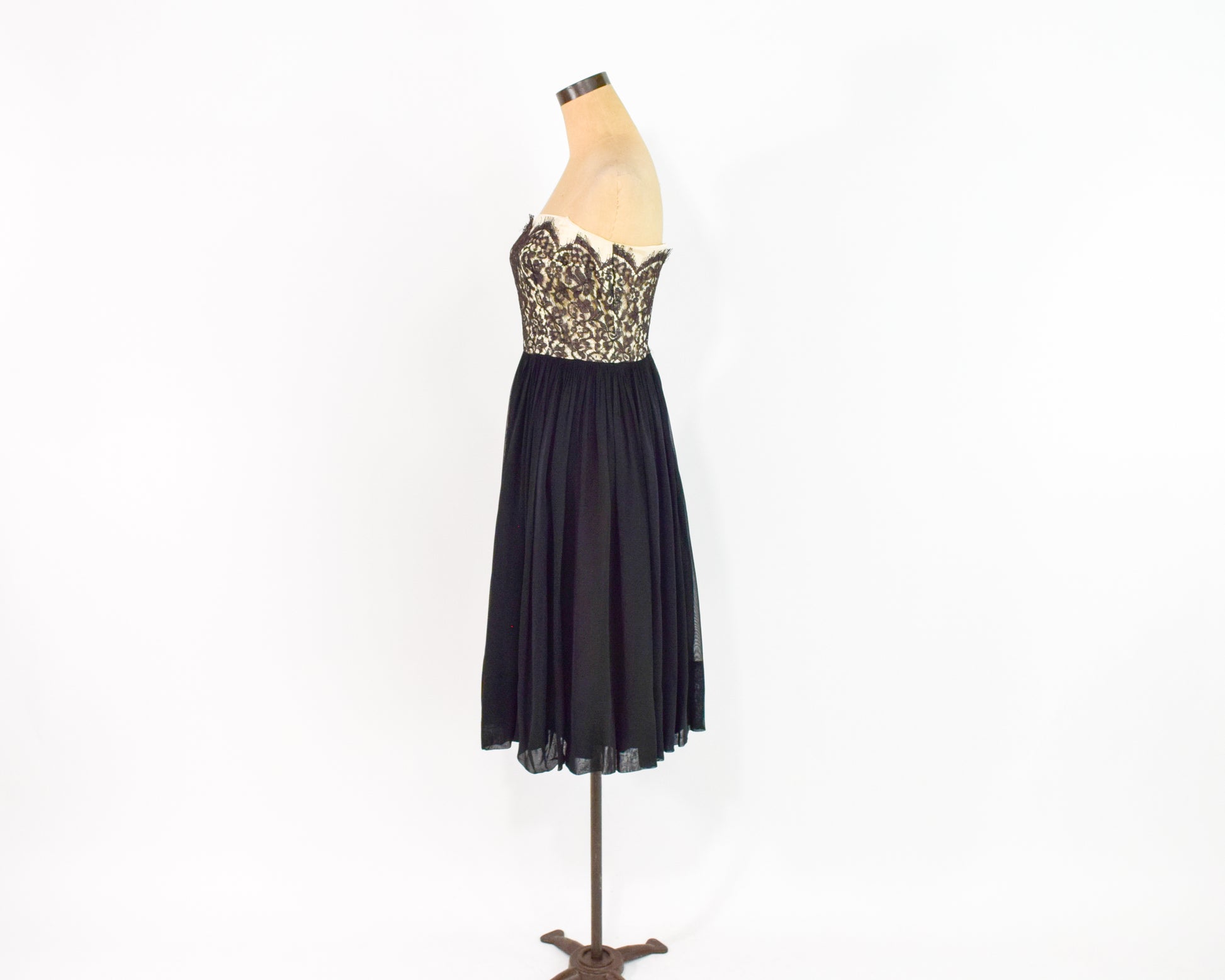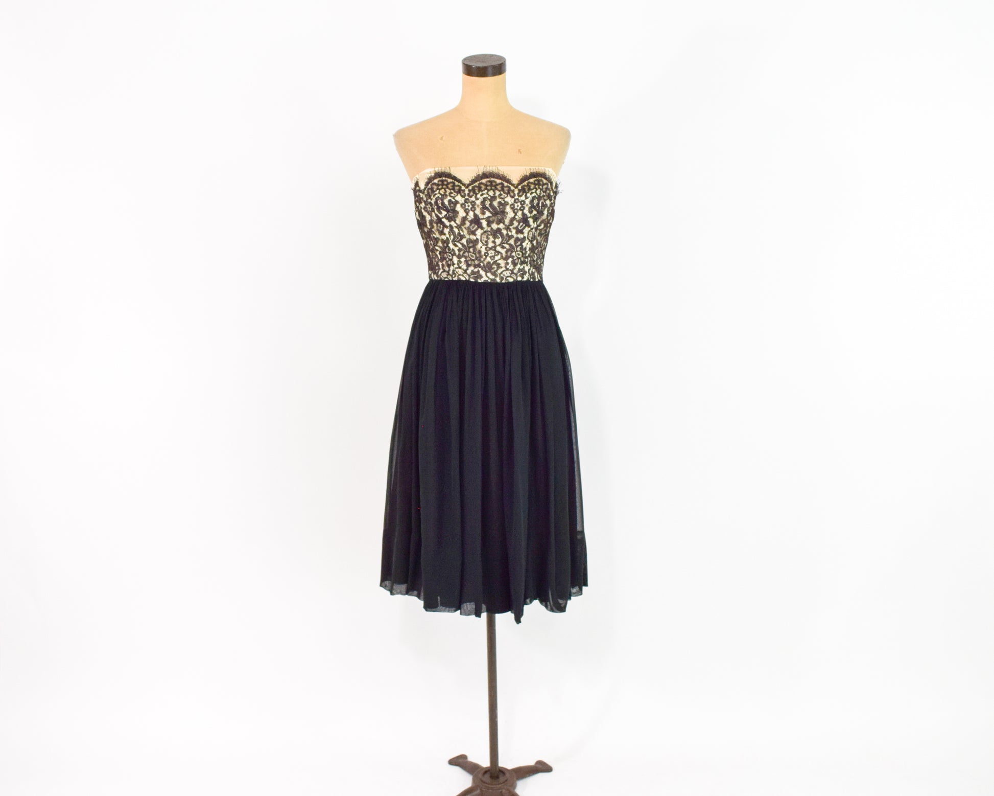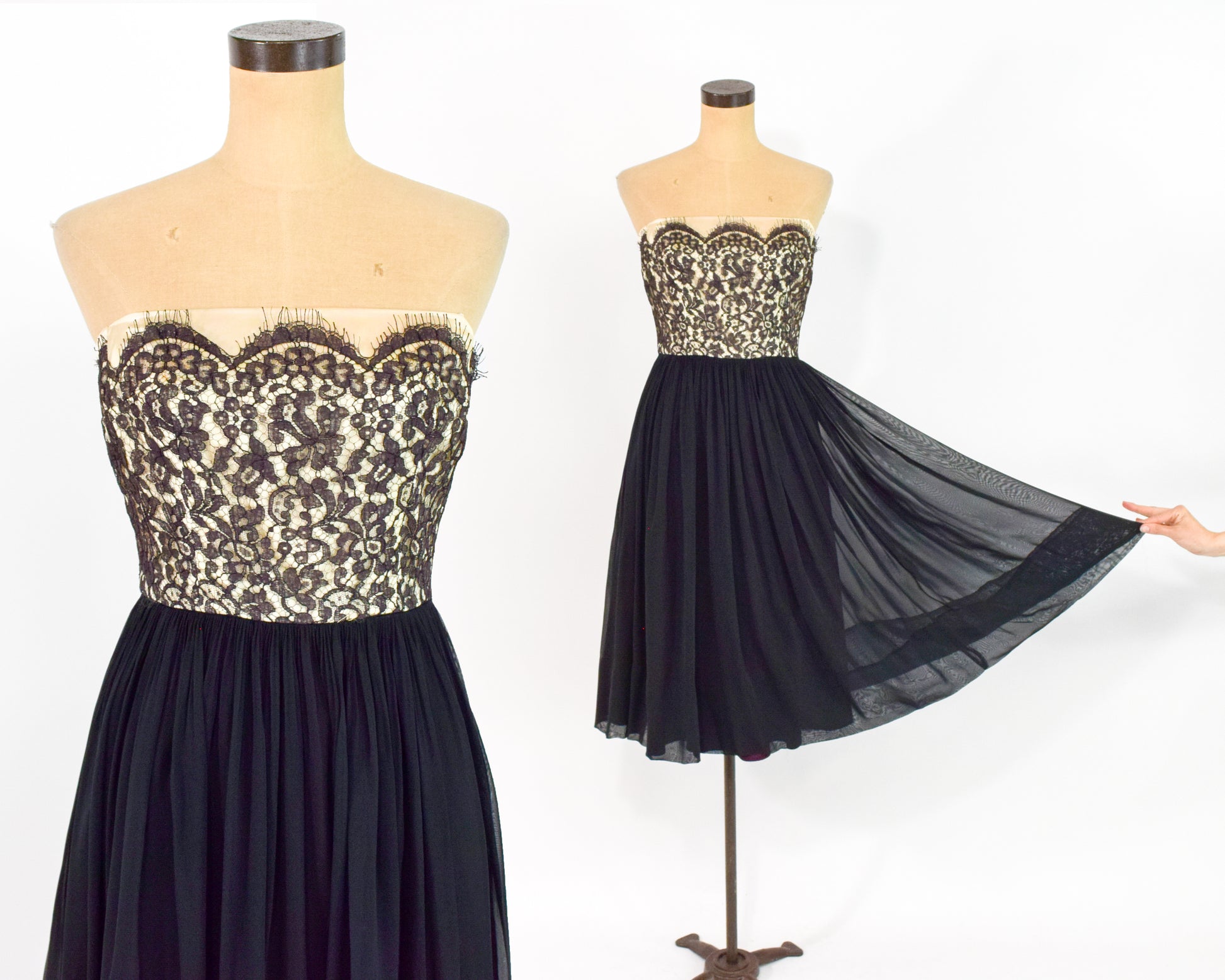 Beautiful 1950s black silk chiffon and lace party dress. The bodice is black lace over a nude base and the skirt with black silk chiffon. The thin spaghetti straps are optional and made of cotton. Lined in taffeta with a metal zipper in the back. Leslie Fay Original.