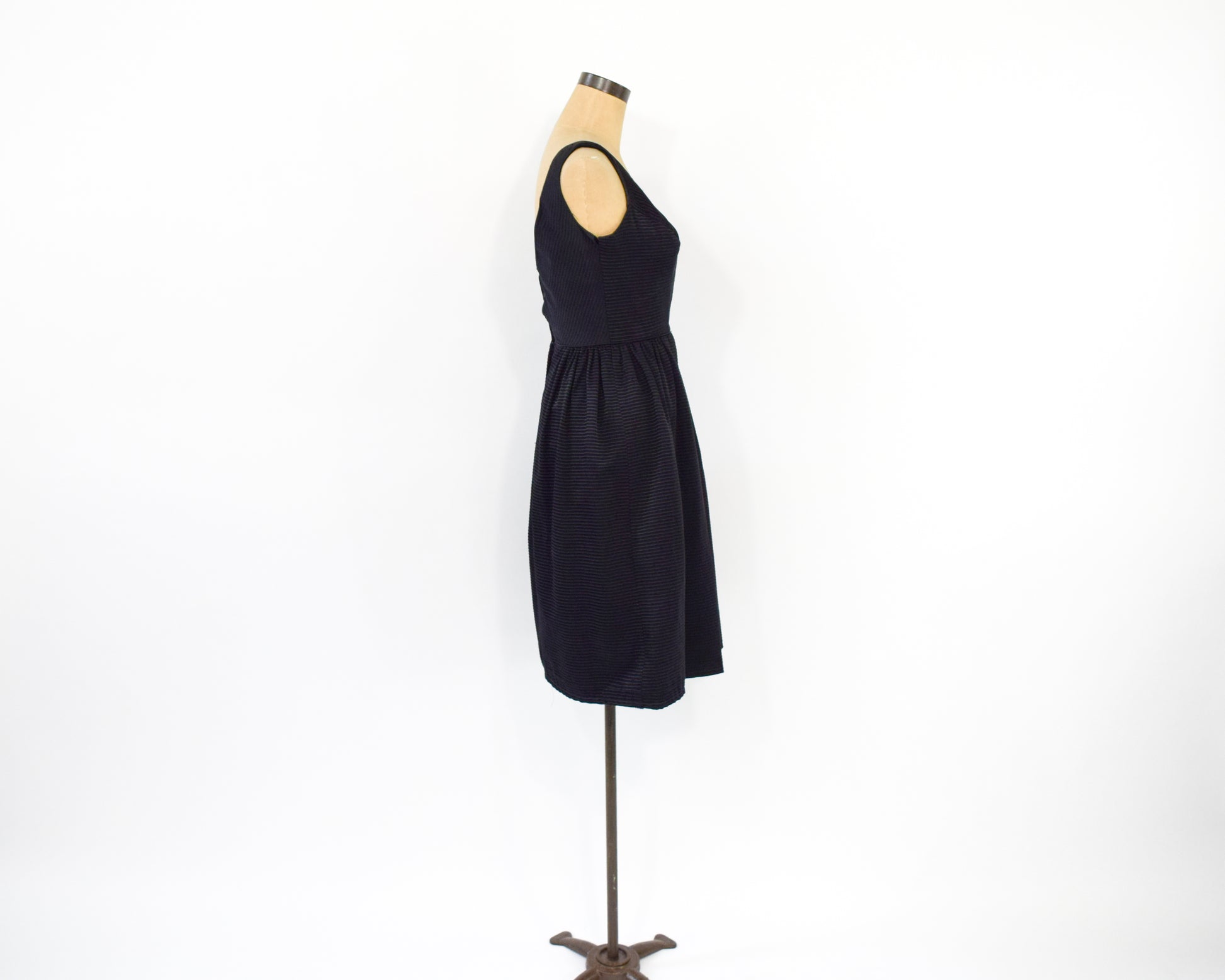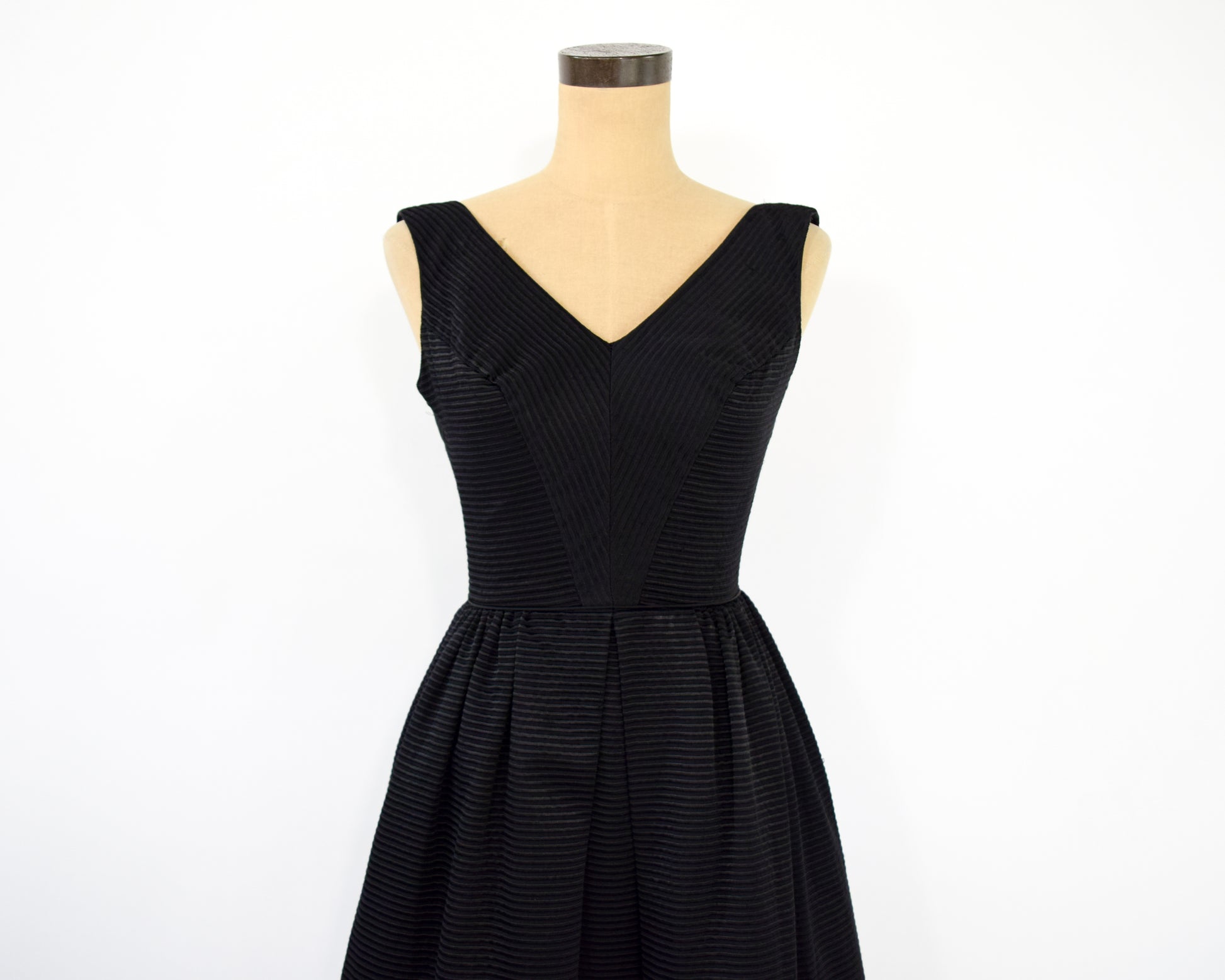 1950s black ribbed satin party dress. Beautifully woven fabric with a perfect chevron construction on the bodice and a fitted waist with self-piping. The top is lined in taffeta and there is a back metal zipper. Excellent Vintage Condition. XXS