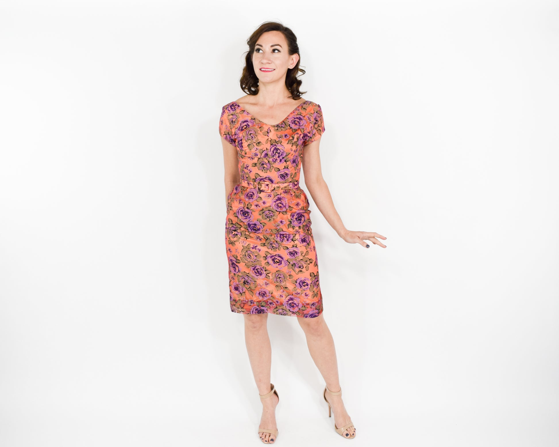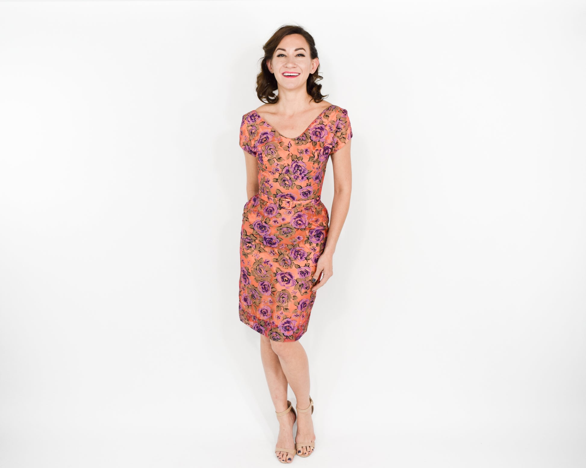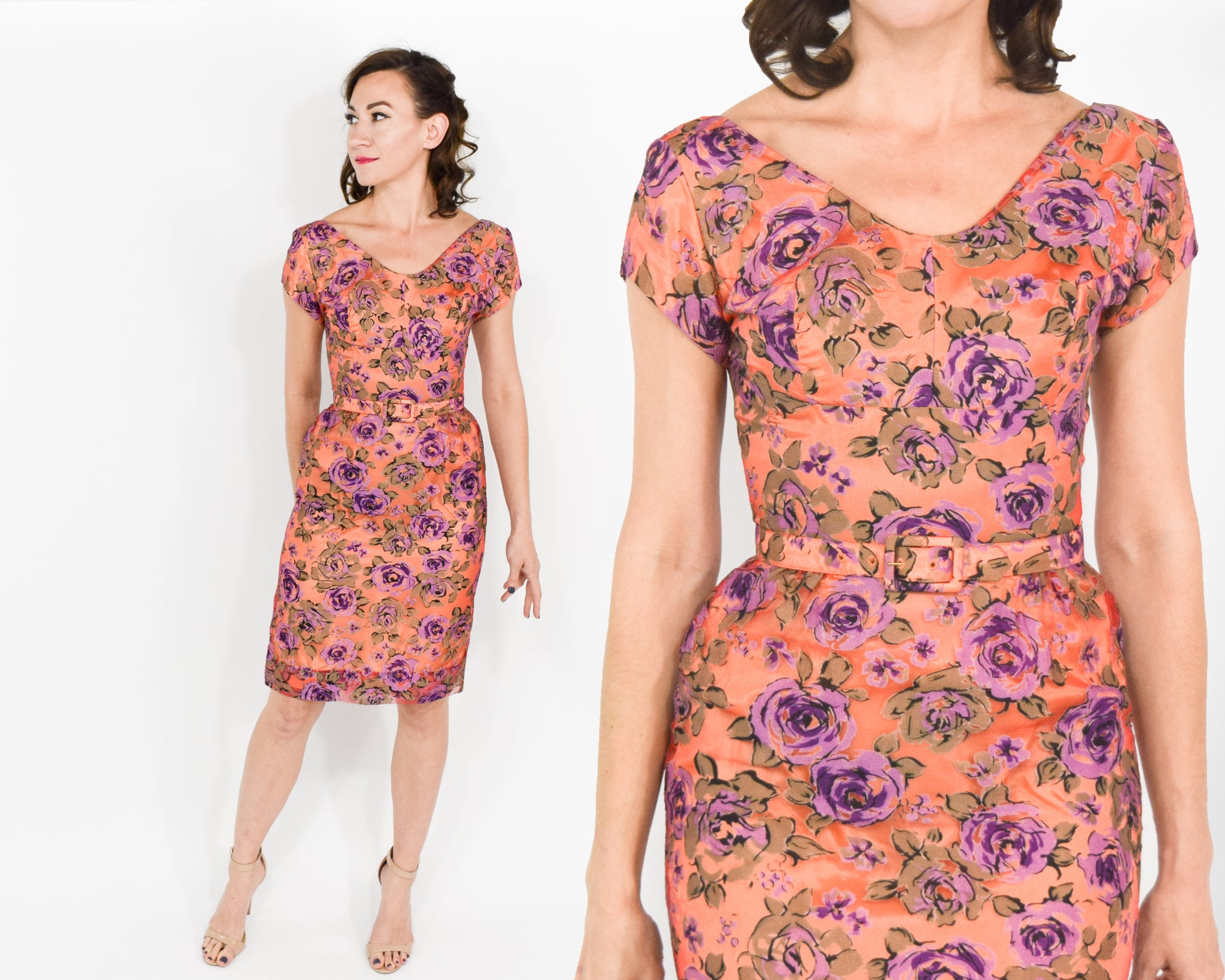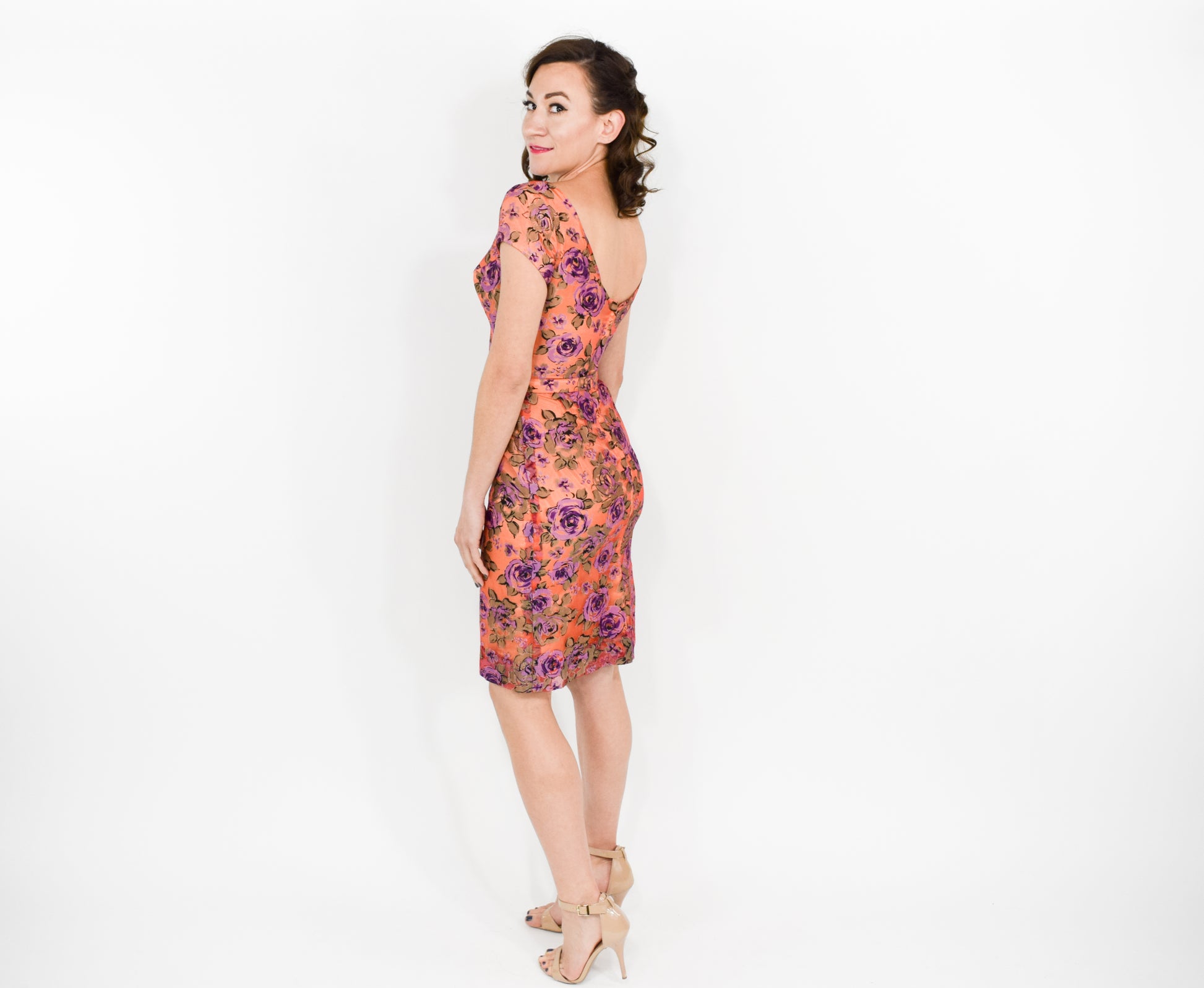 Lovely orange and purple rose pattern cocktail dress from the 1960s