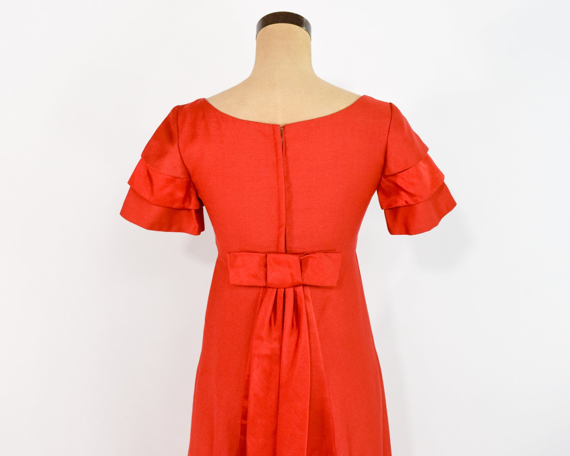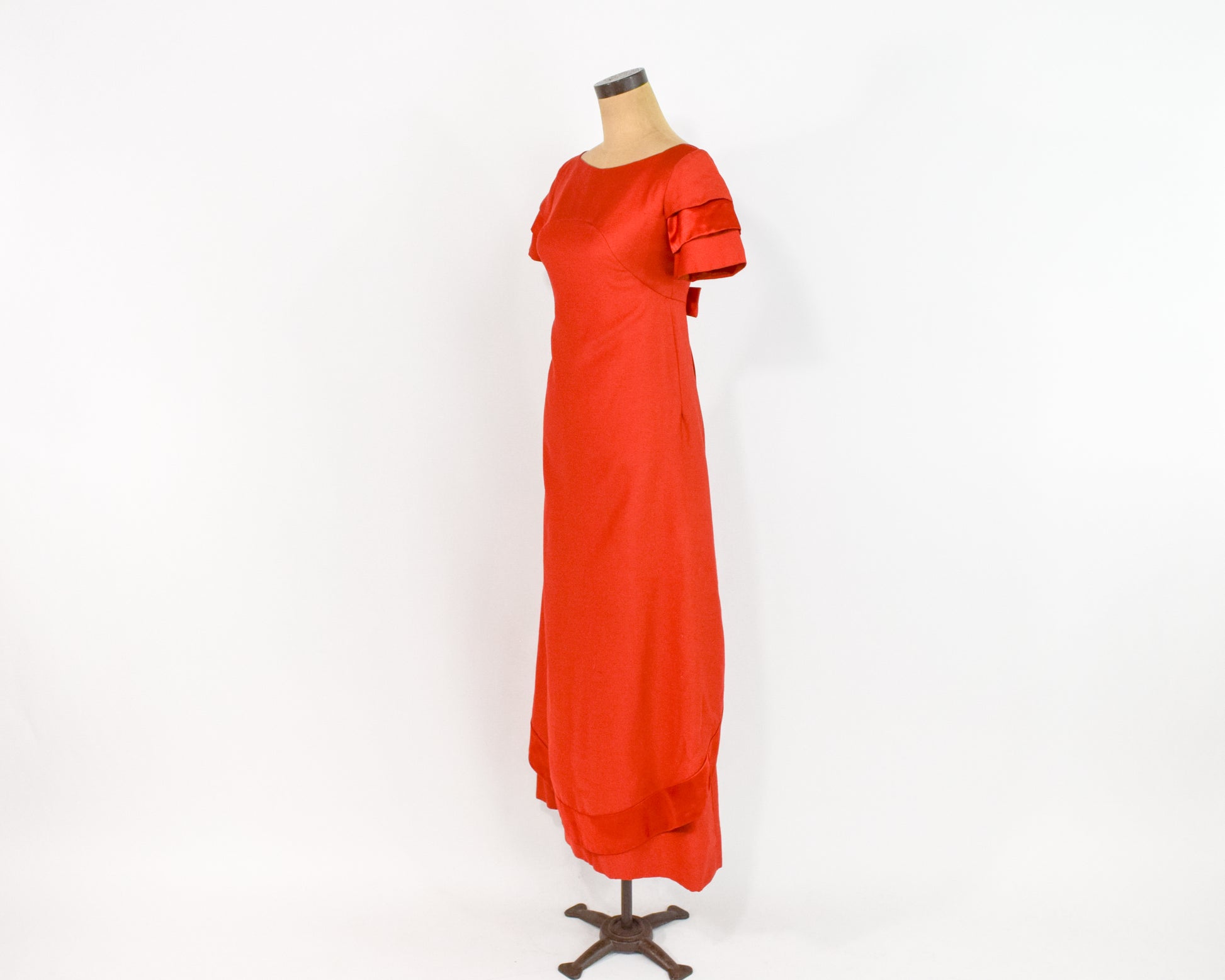 Beautiful silk blend evening dress by Emma Domb from the 1960s. The simple silhouette is balanced by the dramatic back and petal sleeves. Satin trim along the sleeves and petal skirt in the back. Lined in taffeta with a zipper in the back. Emma Domb California, Union Label. Excellent vintage condition. Size Small.