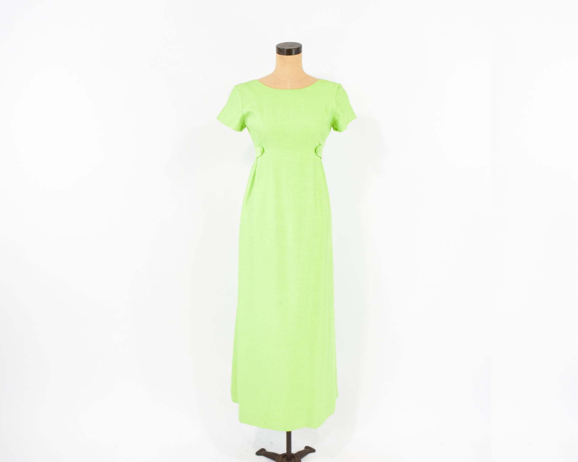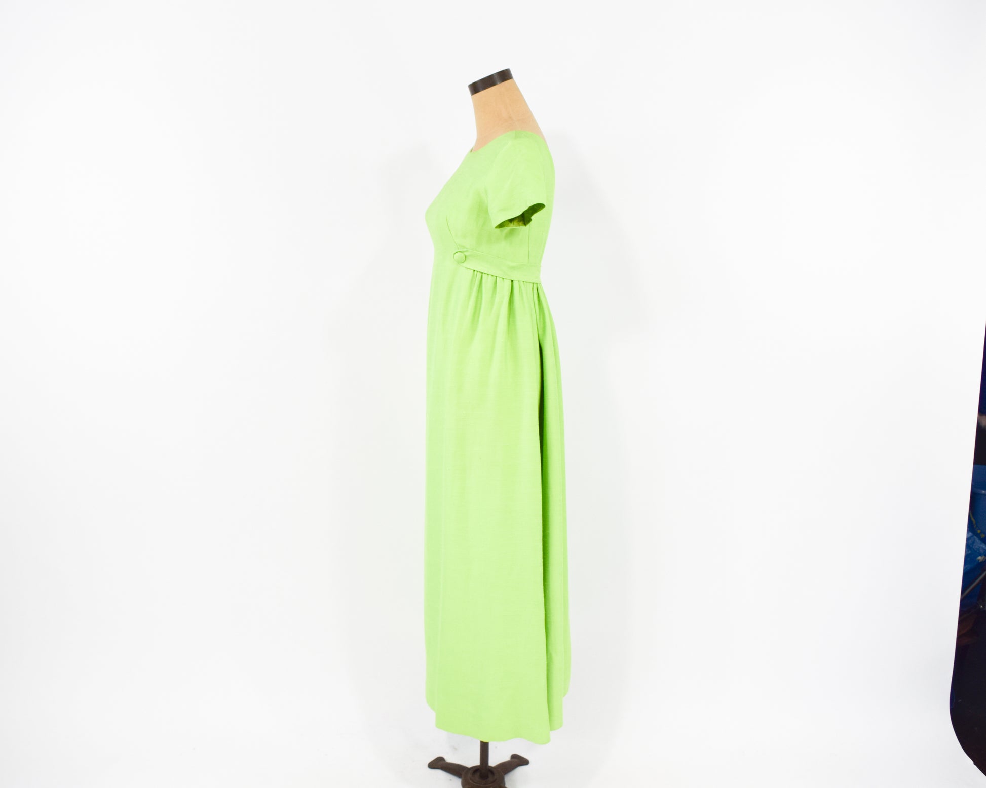 Beautiful lime green dress in raw silk by Emma Domb from the 1960s. The back is detailed with scalloping around the buttons. There are short sleeves, a high waist, a zipper in the back, taffeta lining, and button details. Size Small