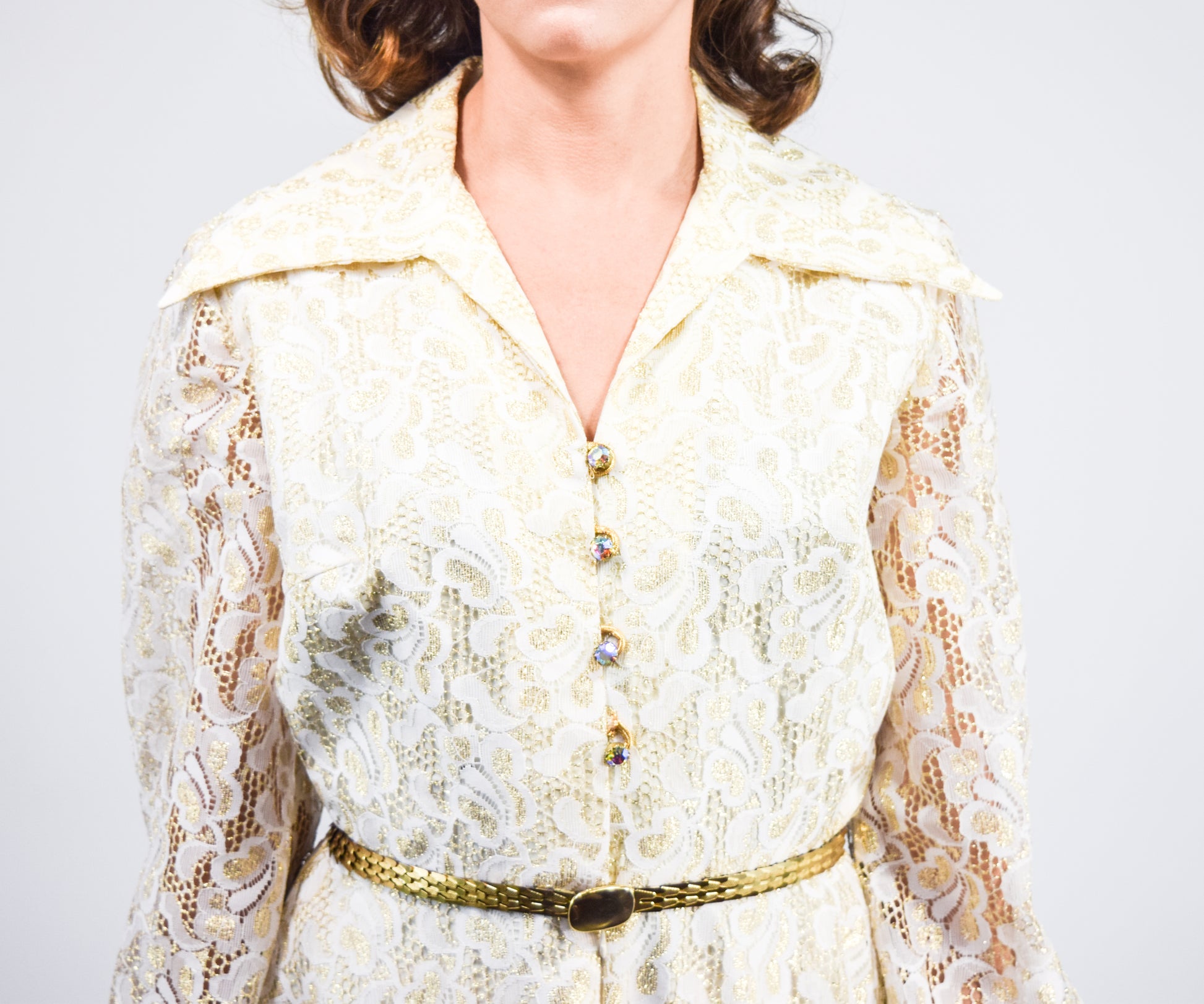 Luminous white gold lace hostess dress from the 1970s. Shirtwaist style dress with long sheer sleeves. Glittering rhinestone buttons up the front, also one at each cuff. There is a zipper in the front of the skirt up to the waist. The ivory taffeta lining is lightly spotted, but this cannot be seen from the exterior. Excellent vintage condition. Size Large.