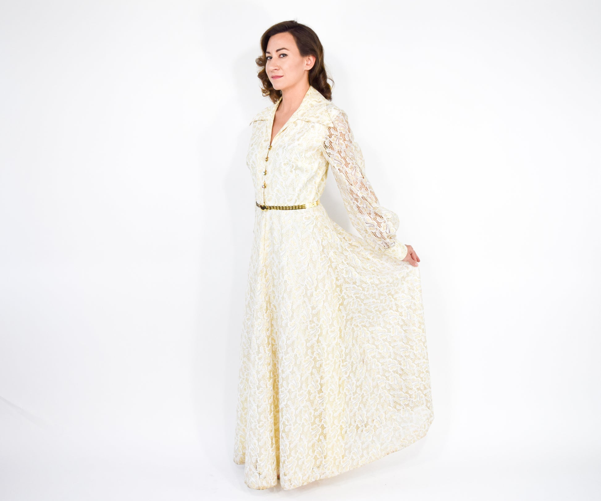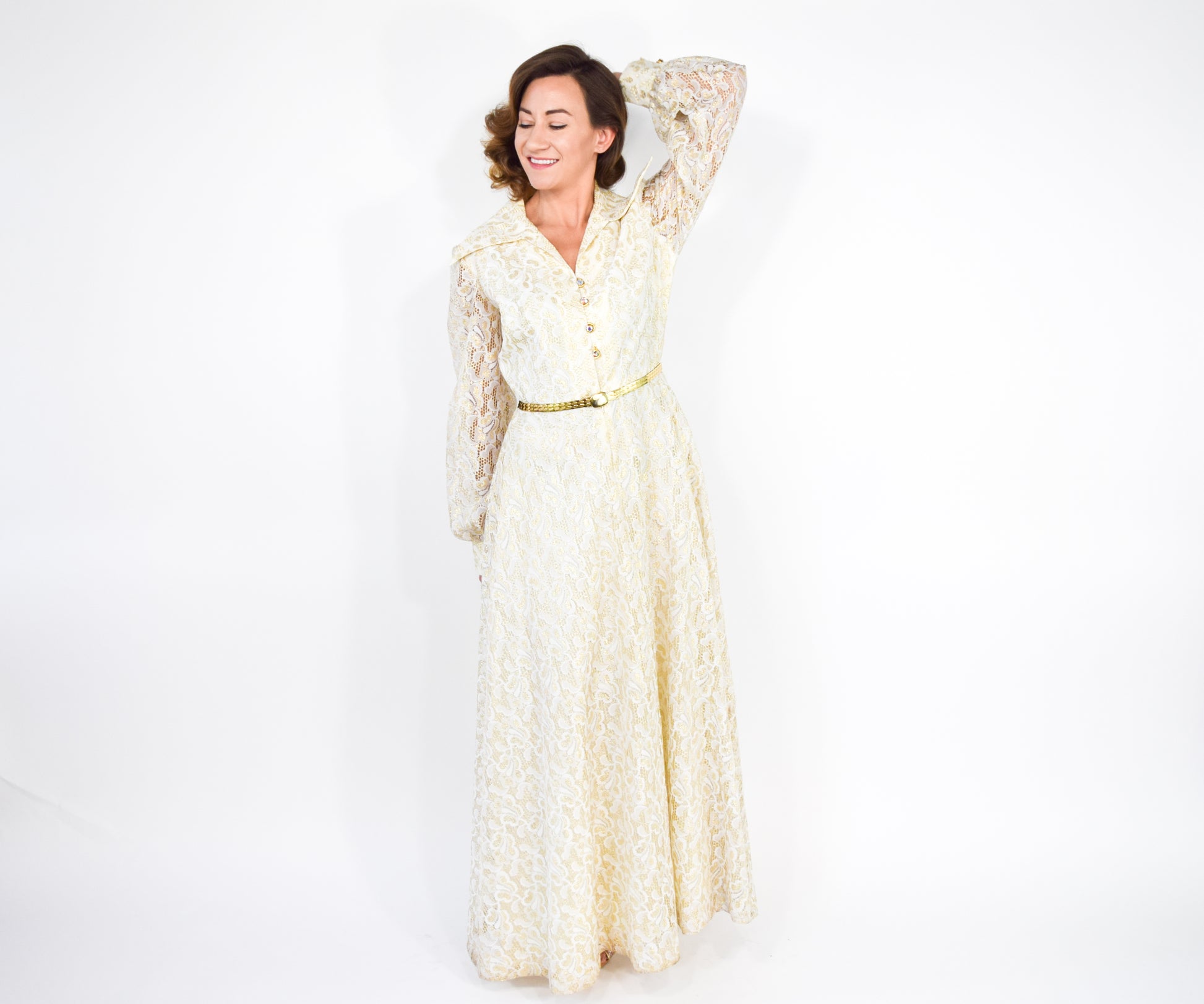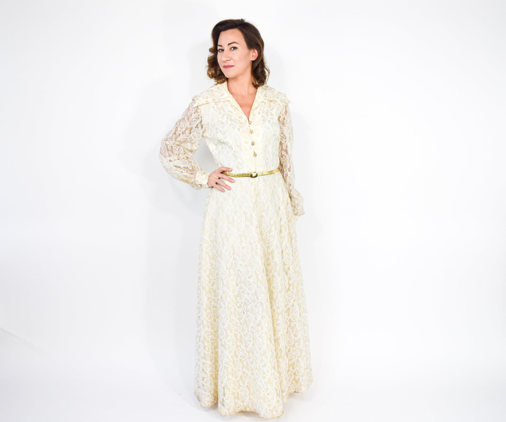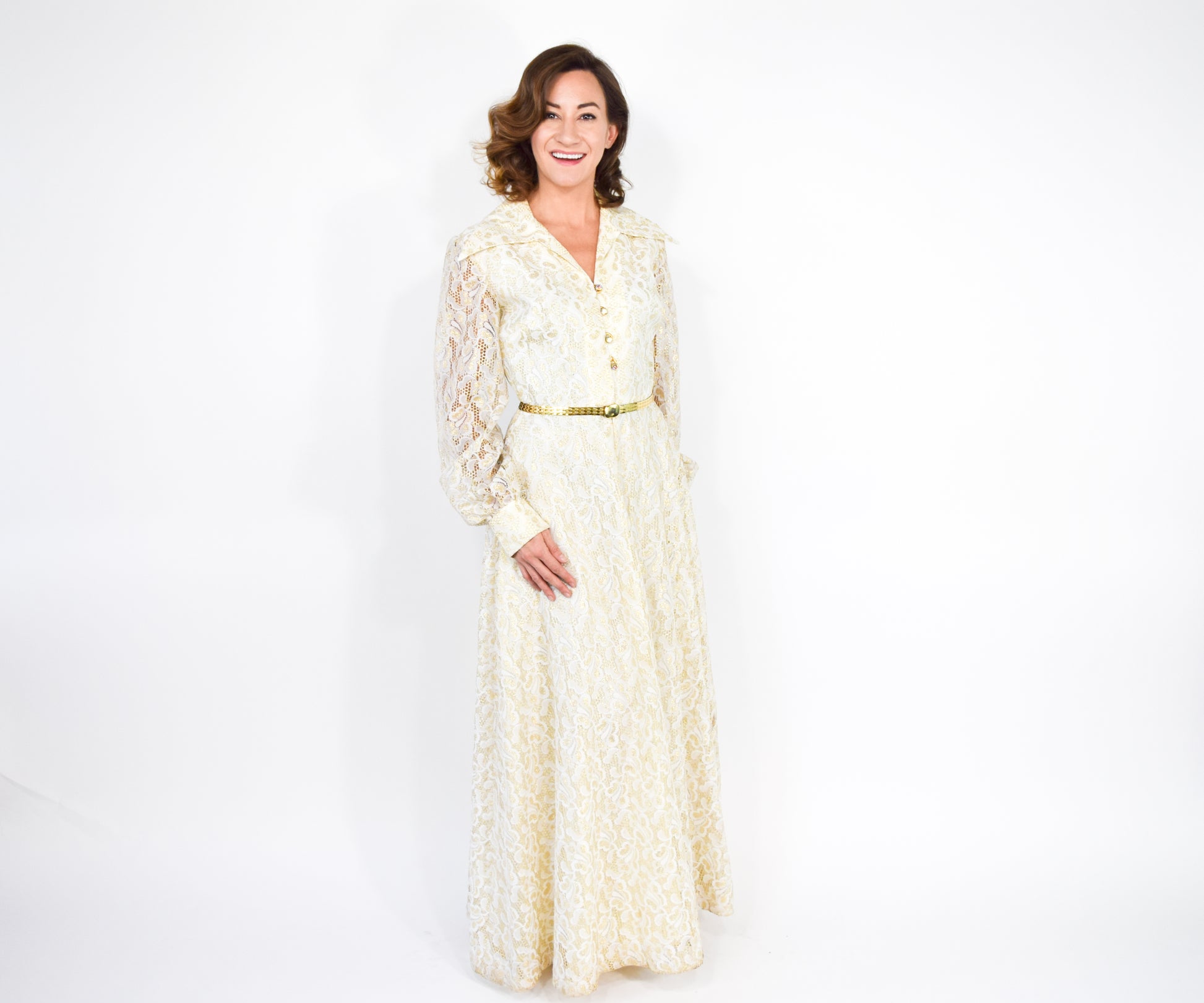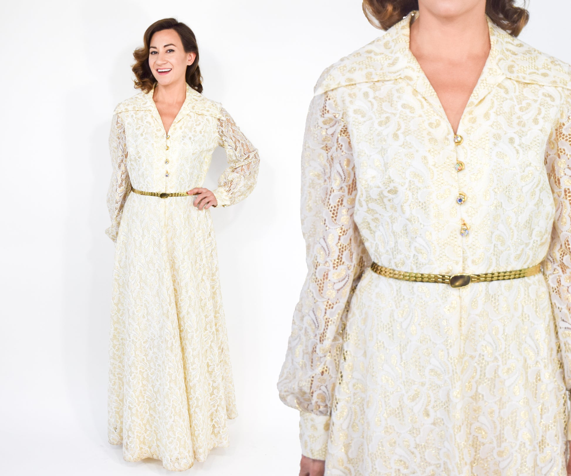 1970s Gold & White Lace Maxi Hostess Dress, Large