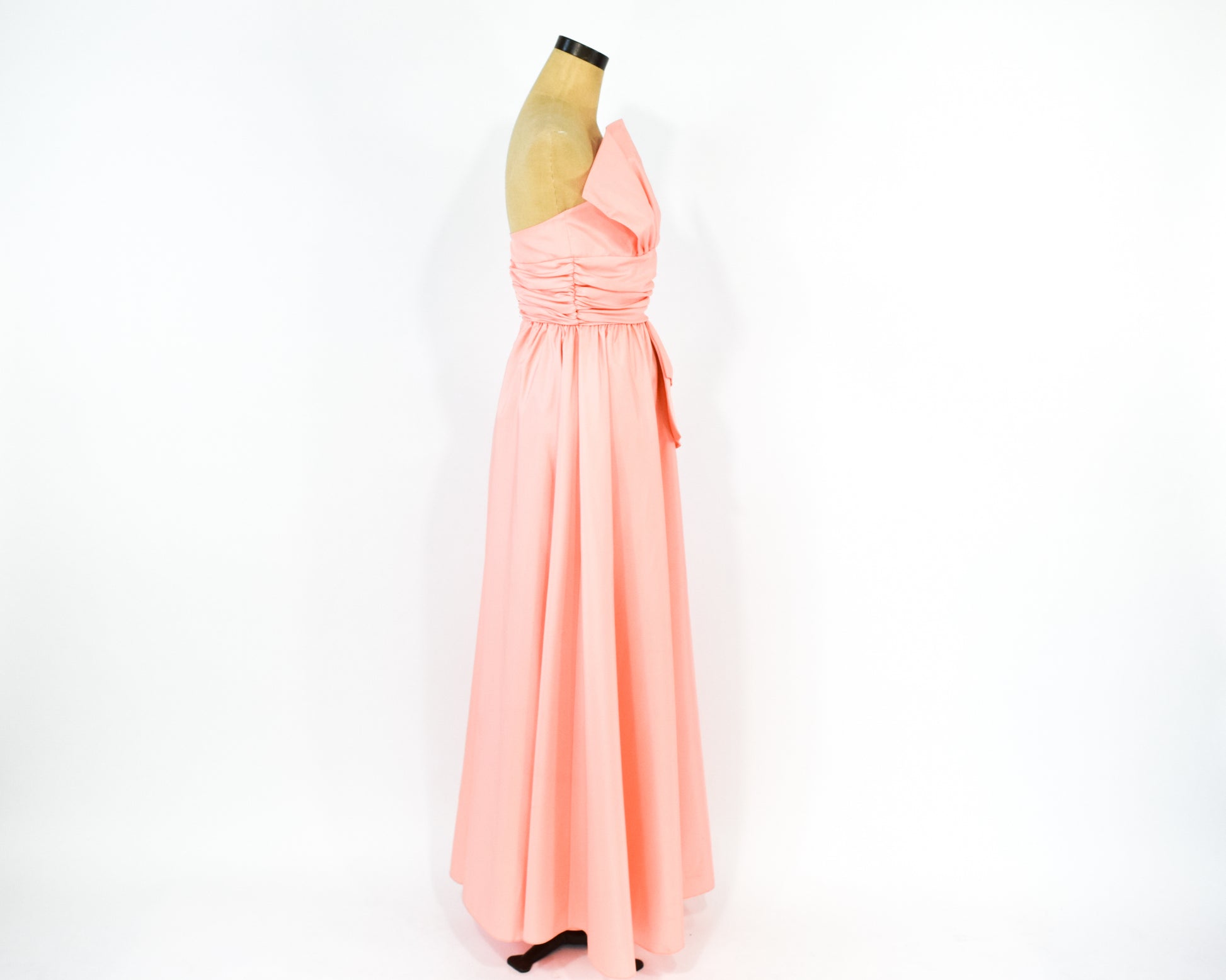 Pretty in Pink strapless evening prom dress from the 1970s, early 1980s. Fabulous ruching at the waist and asymmetric details along the bustline. Coral pink taffeta is self lined in the bodice and unlined in the skirt. Back zipper for closure. Size XXS.