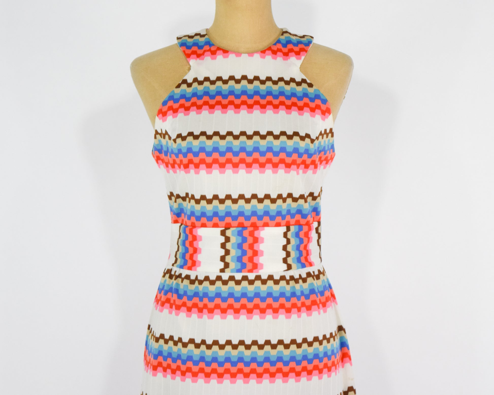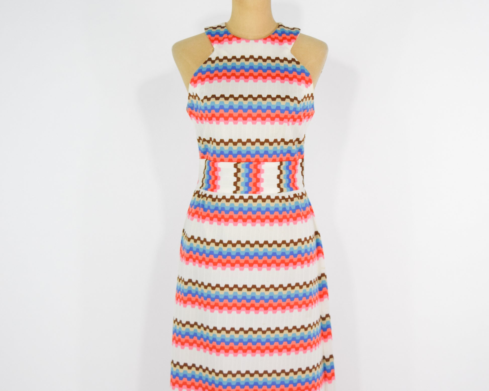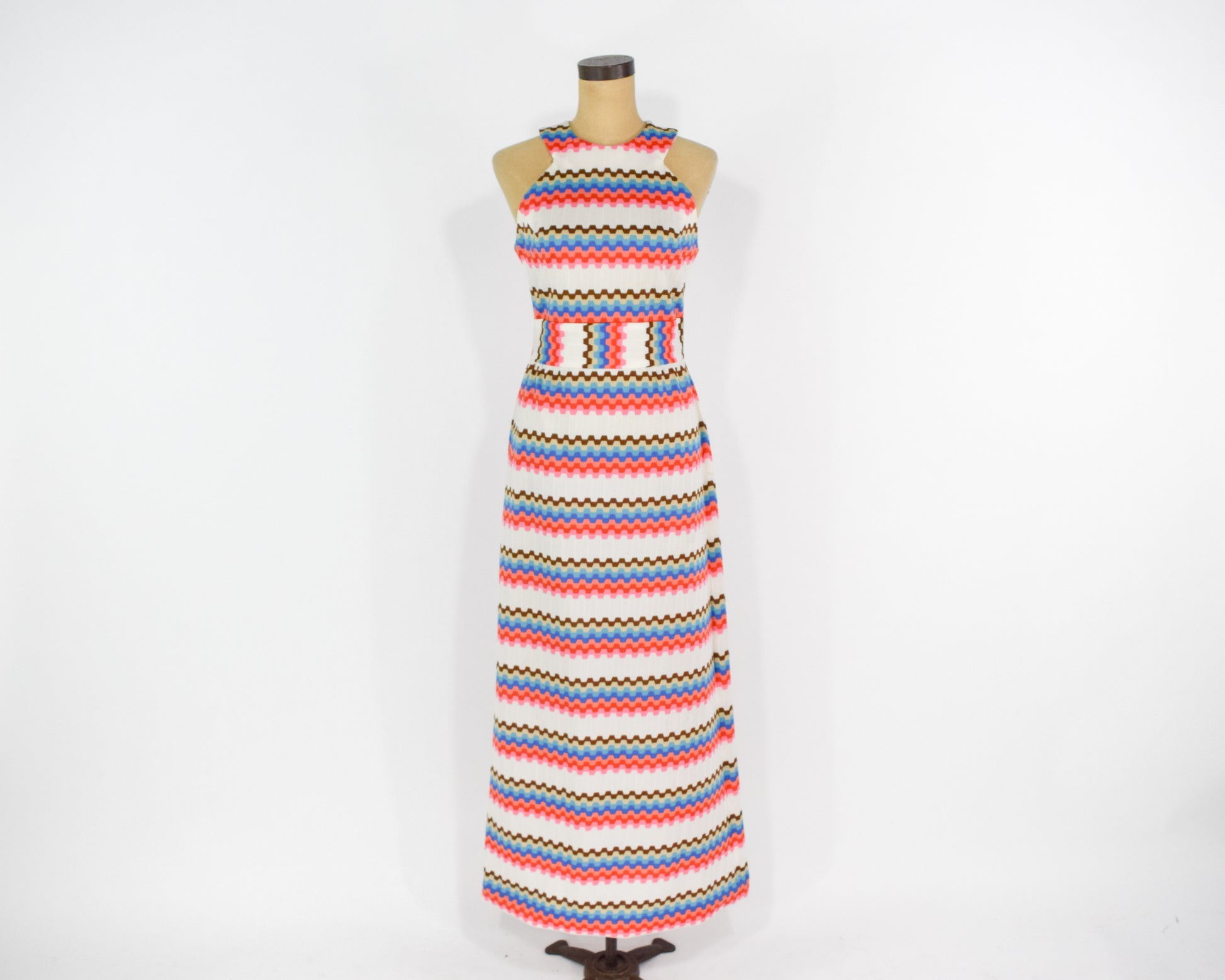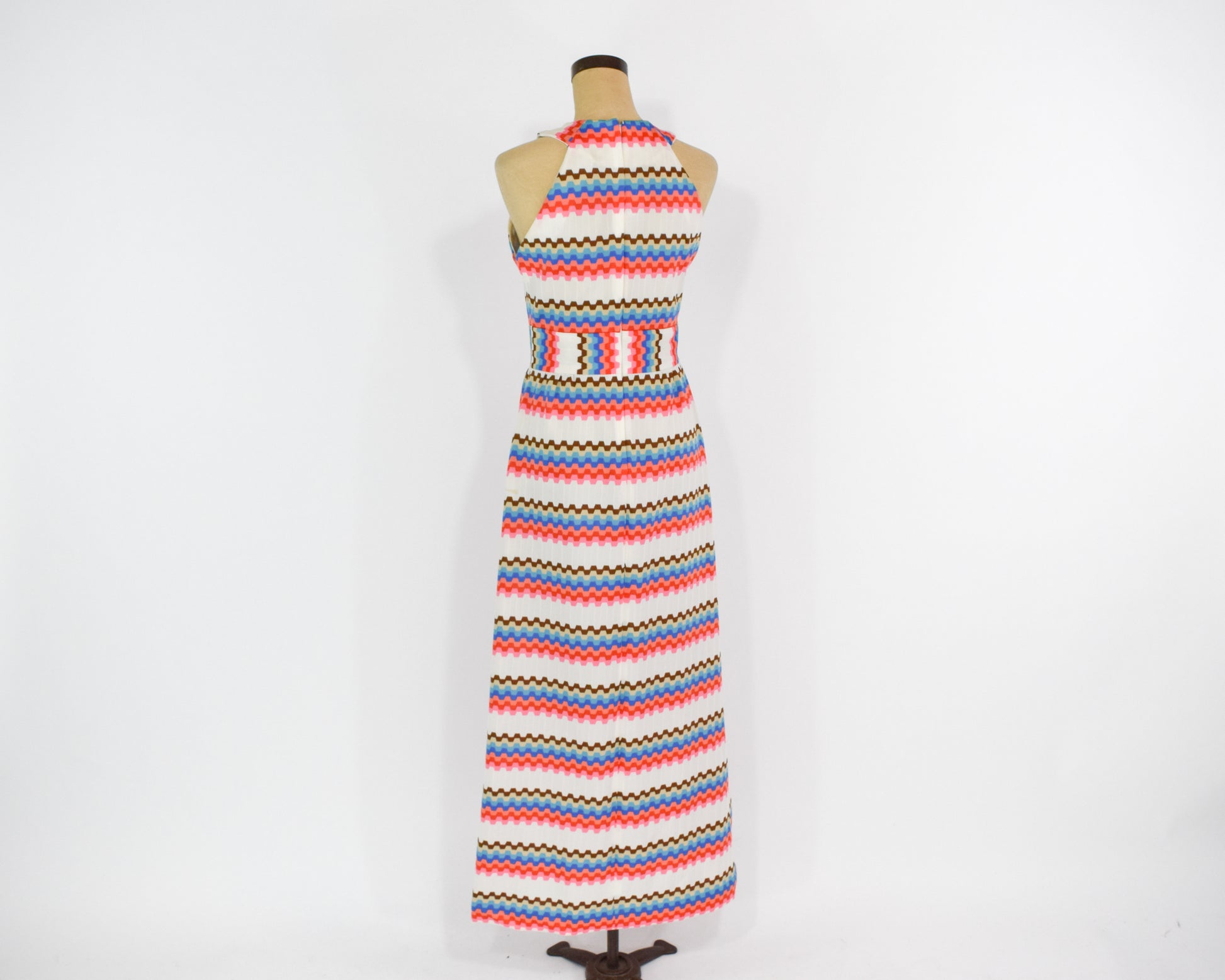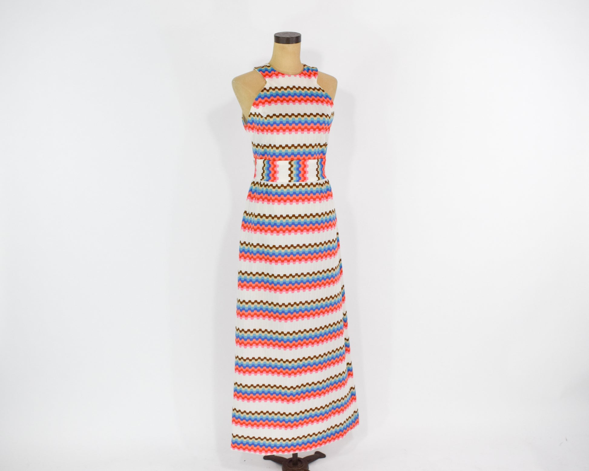 Wonderful white and pink colorful striped maxi dress from the 1970s. Unique geometric pattern stripes. Unlined polyester knit. Back zipper for closure. Excellent vintage condition. Size Medium.