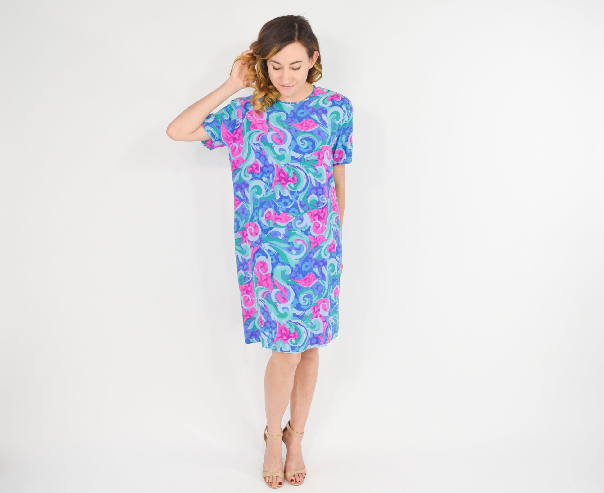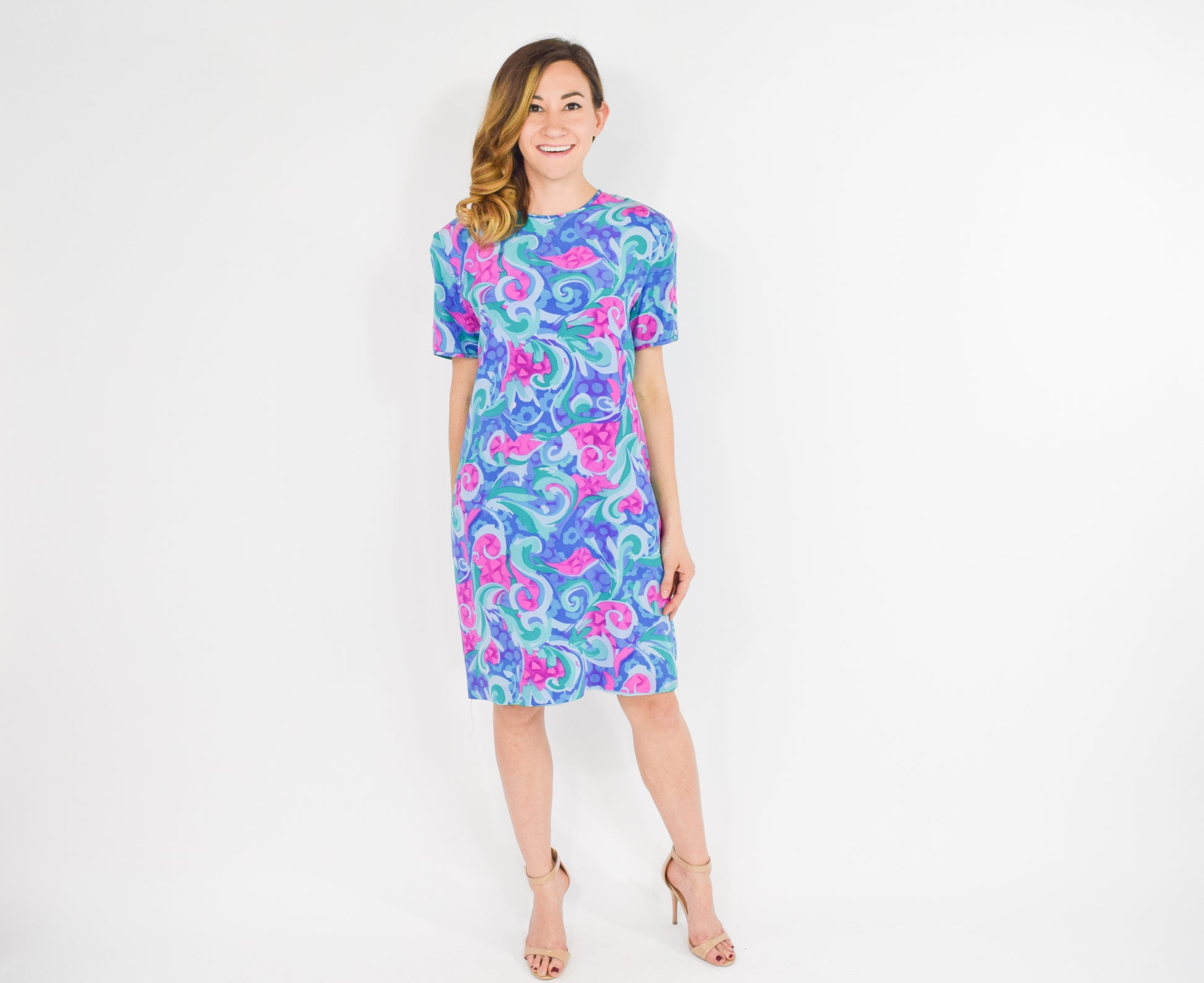 ~ Charming bright blue and pink floral print silk dress from the 1990s