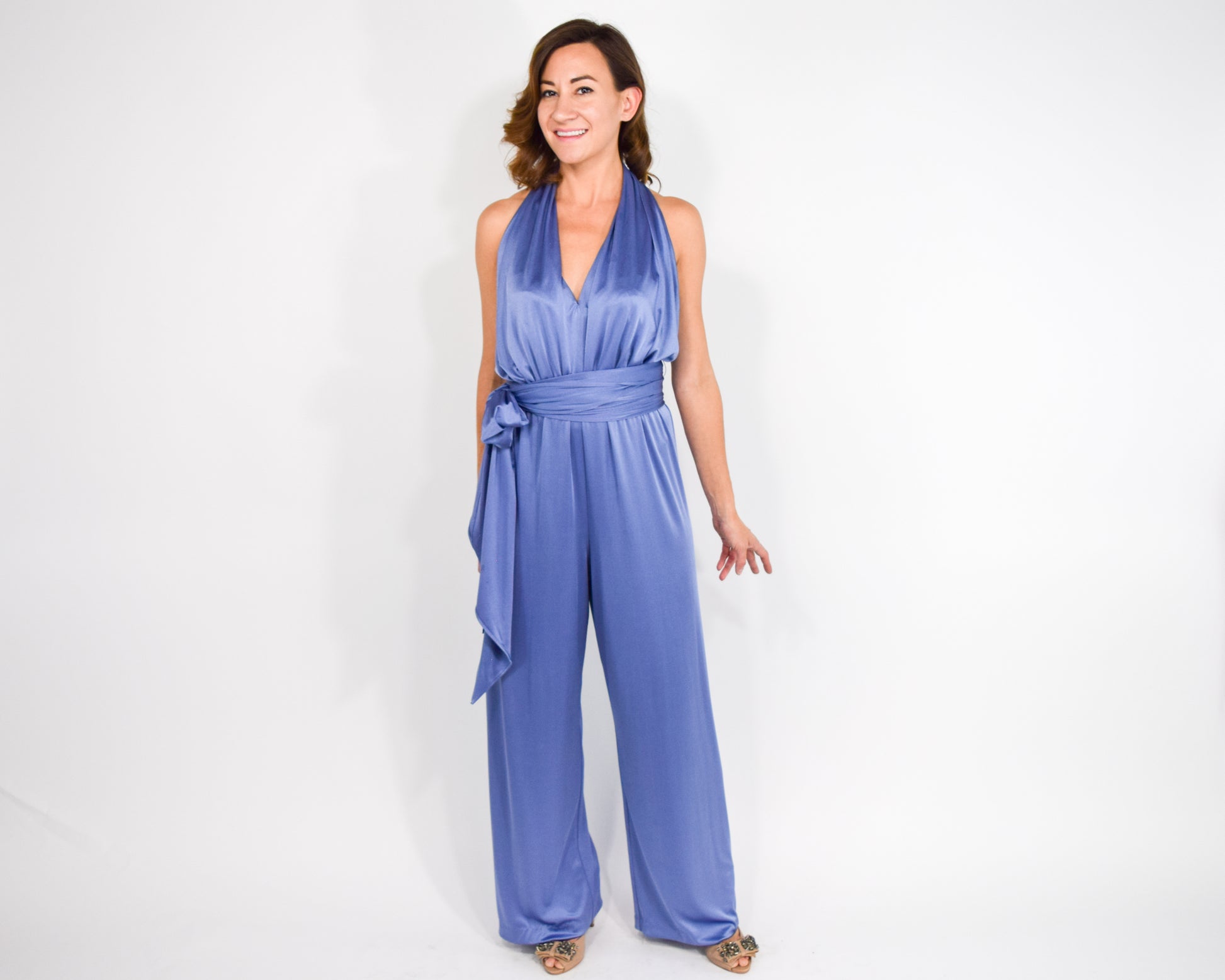 ~ Halter neckline with open back and flowing wide legs