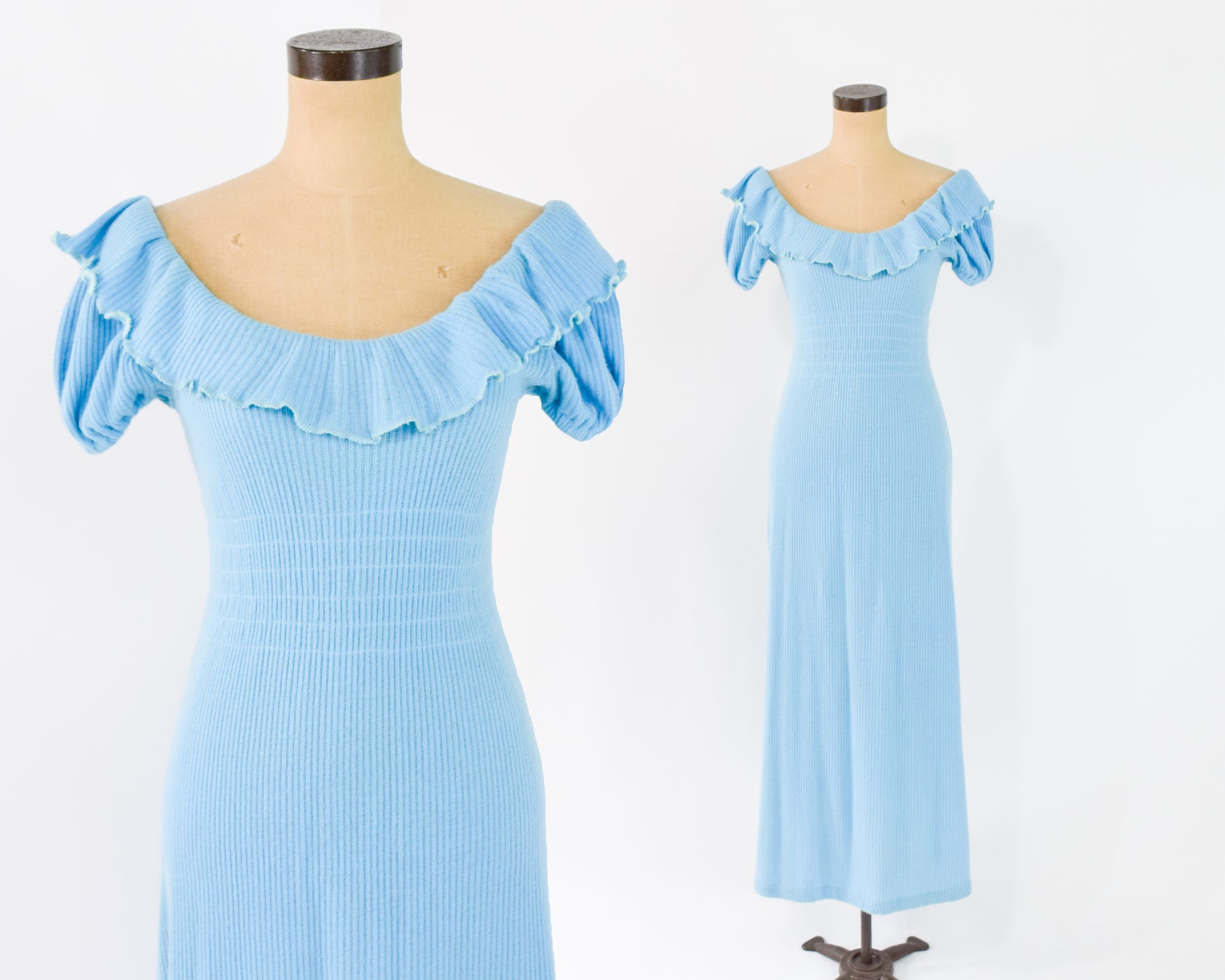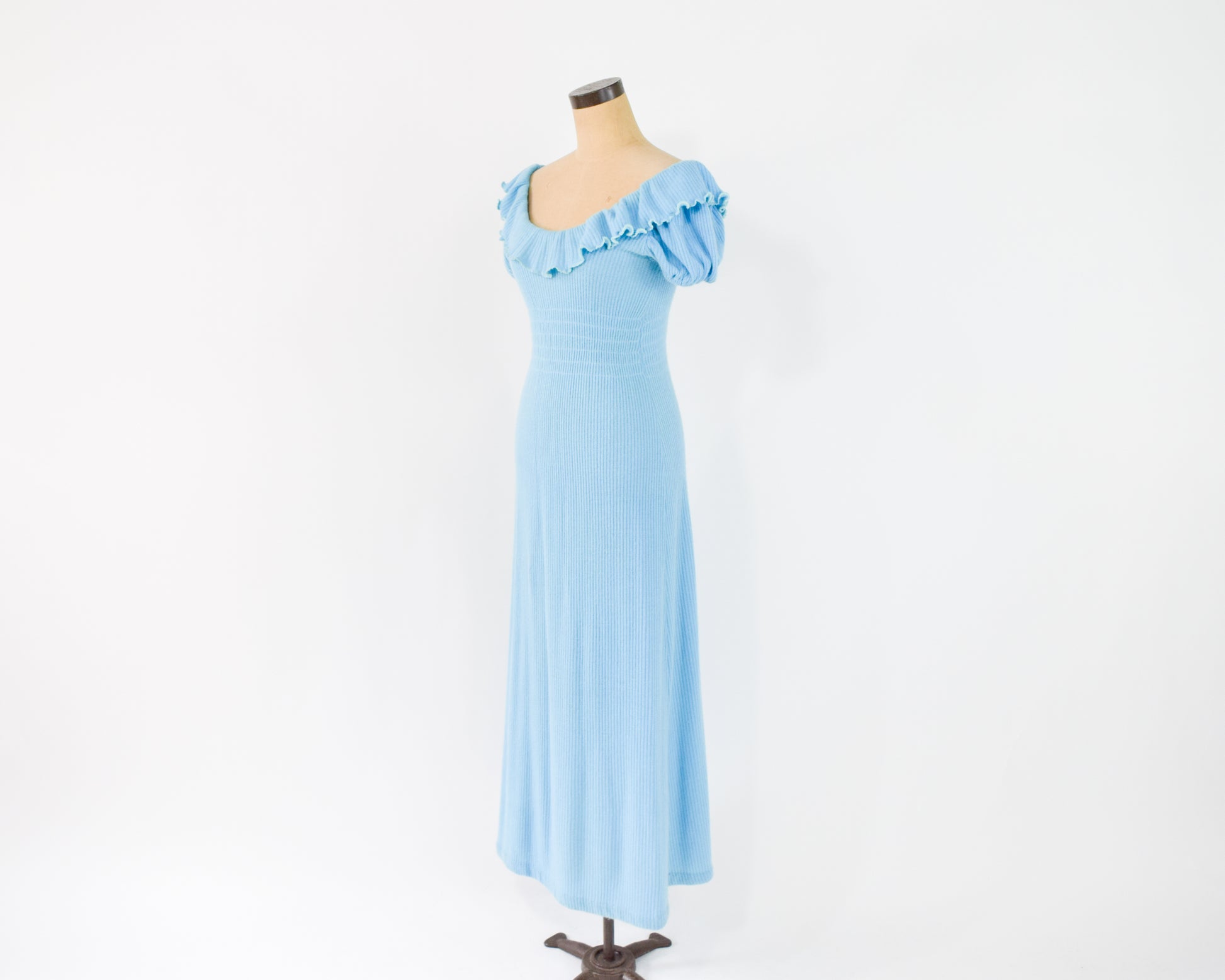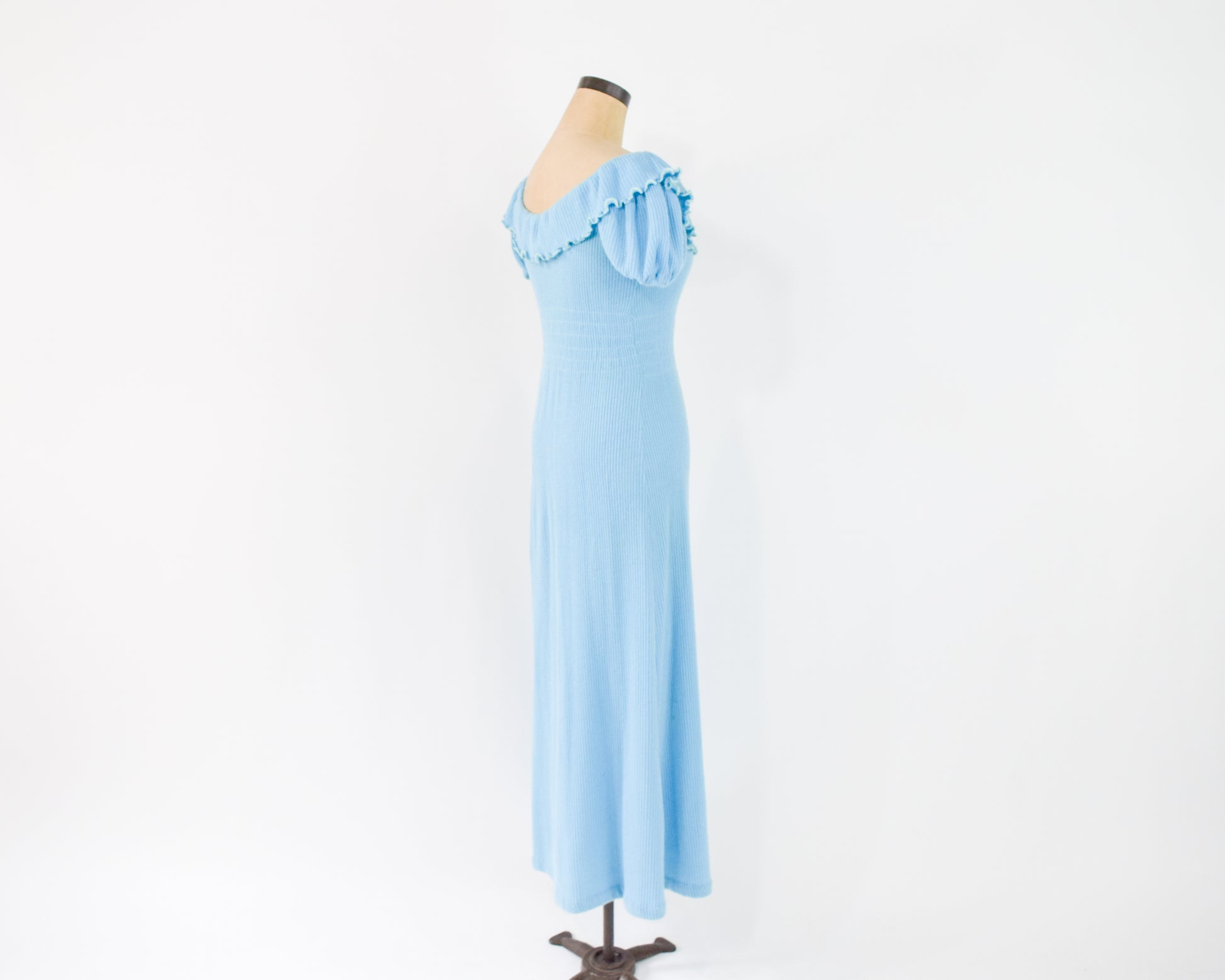 1970s baby sky blue knit prairie dress. Lovely ruffle collar and puff sleeves with elastic. Shirred waistband and ribbed knitted long skirt. Unlined knit. Excellent vintage condition. Size Medium.
