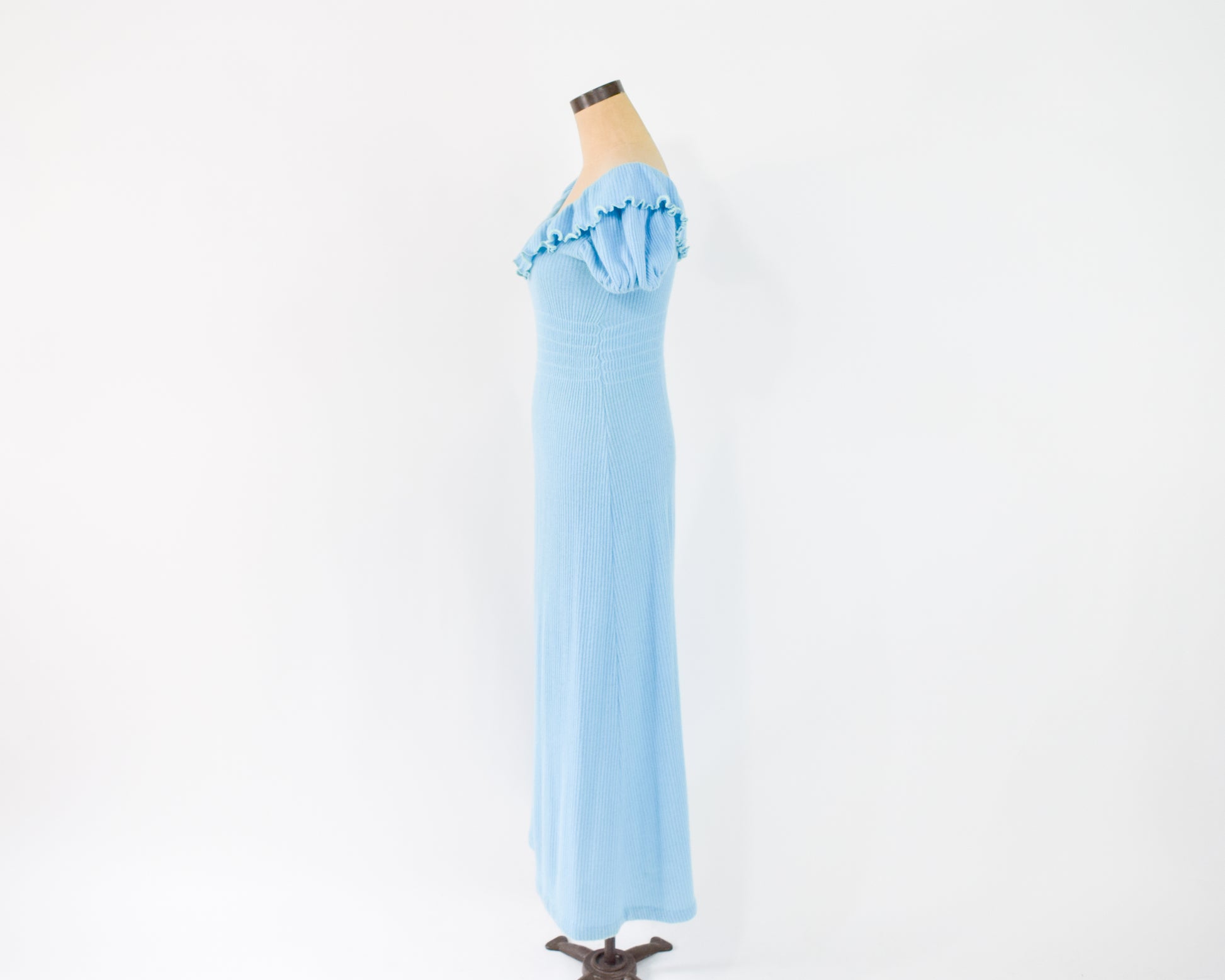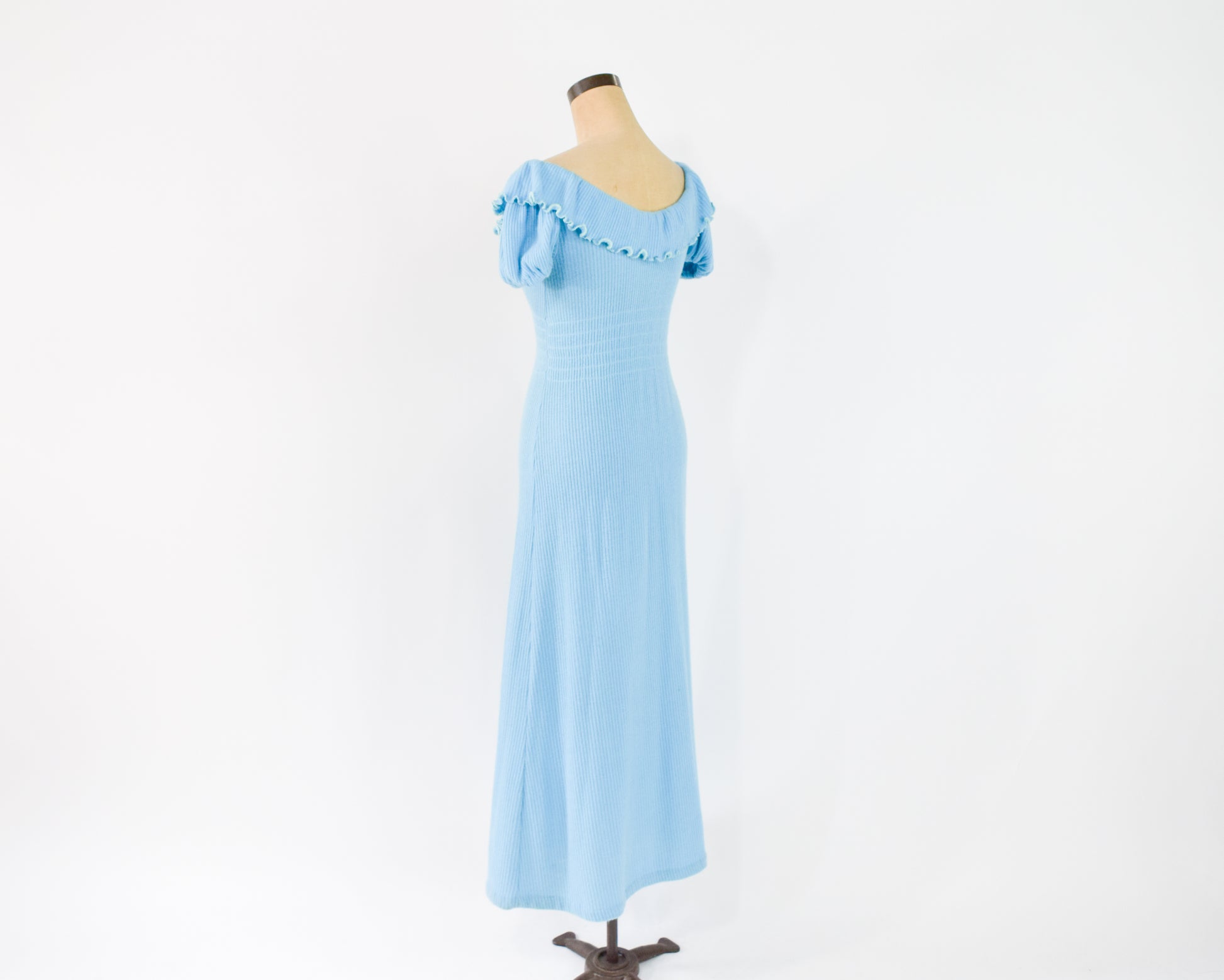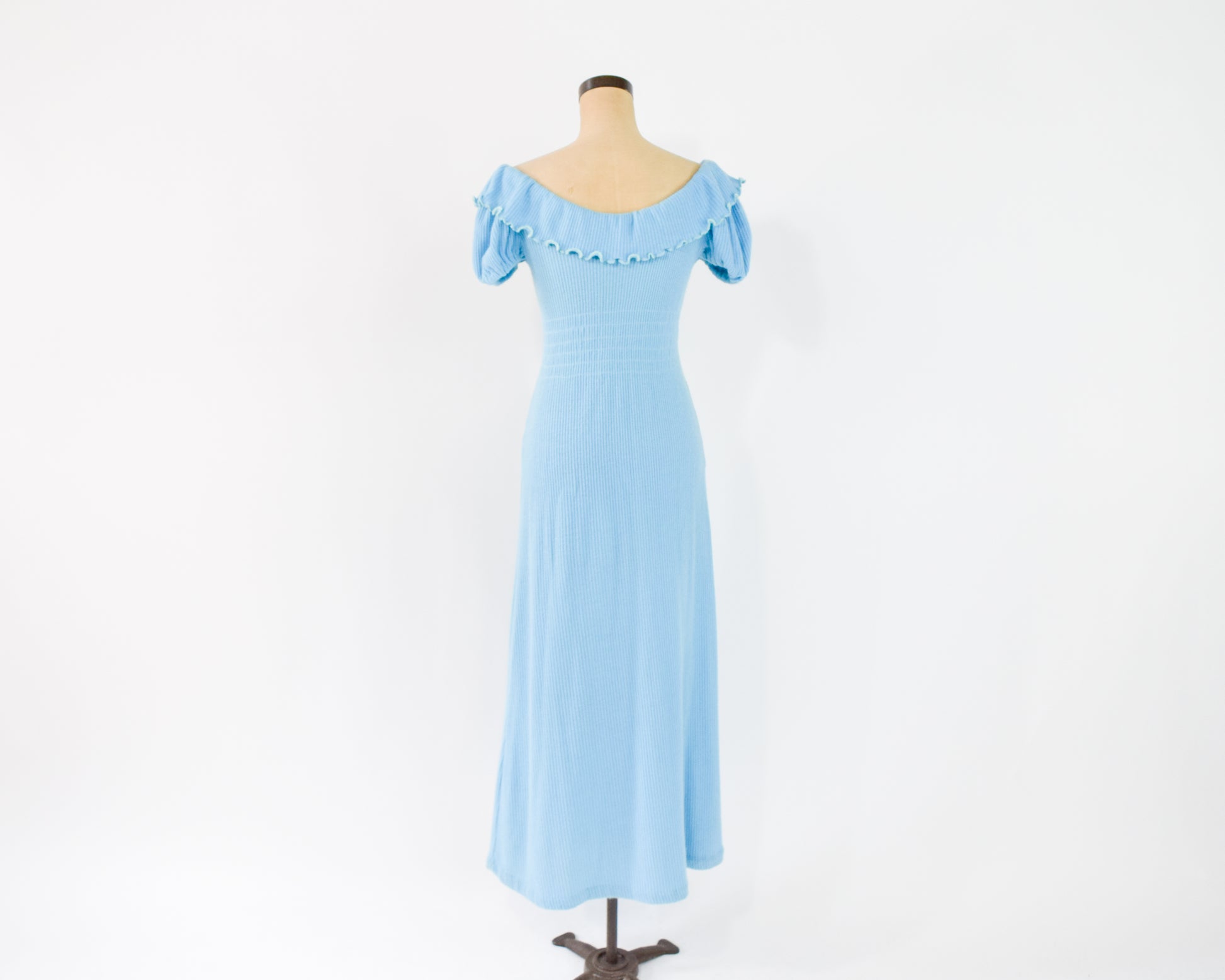 1970s baby sky blue knit prairie dress. Lovely ruffle collar and puff sleeves with elastic. Shirred waistband and ribbed knitted long skirt. Unlined knit. Excellent vintage condition. Size Medium.