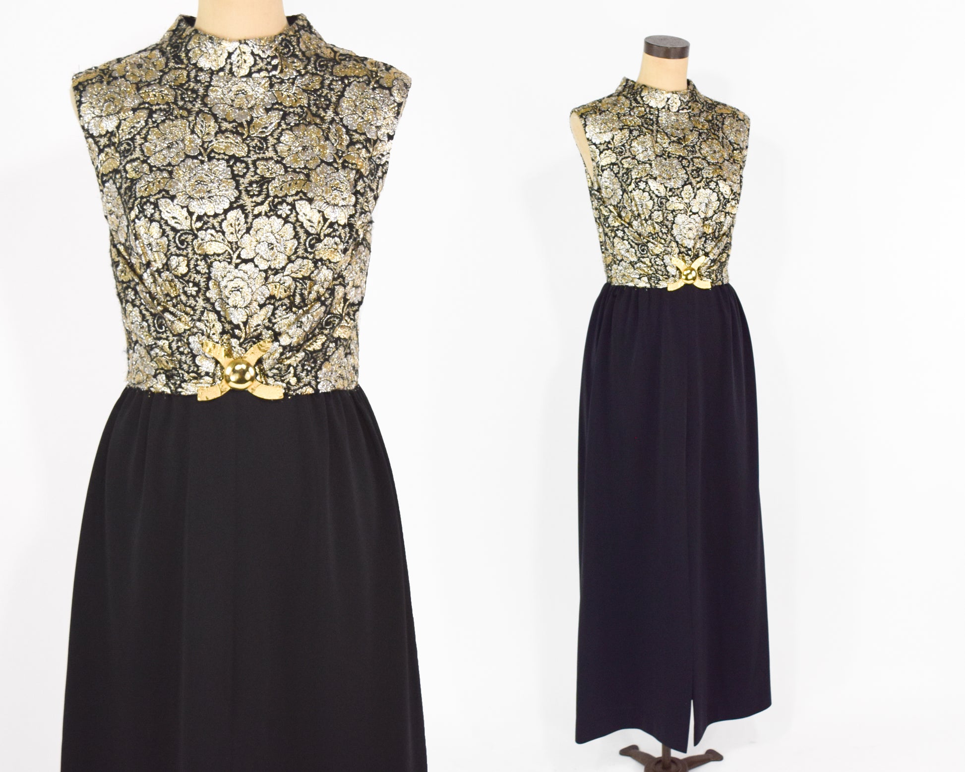 ~ Shimmering gold floral brocade and black evening dress from the 1960s
