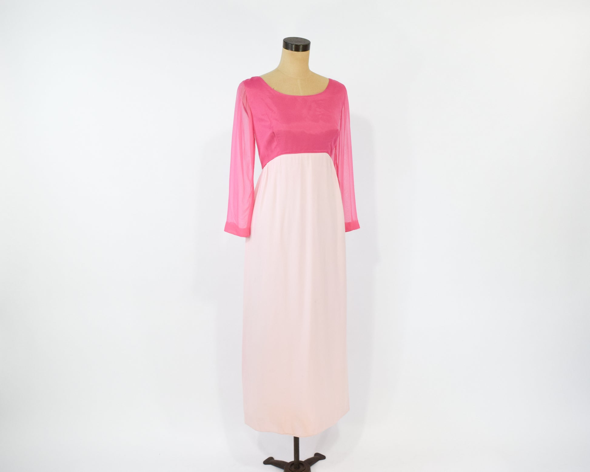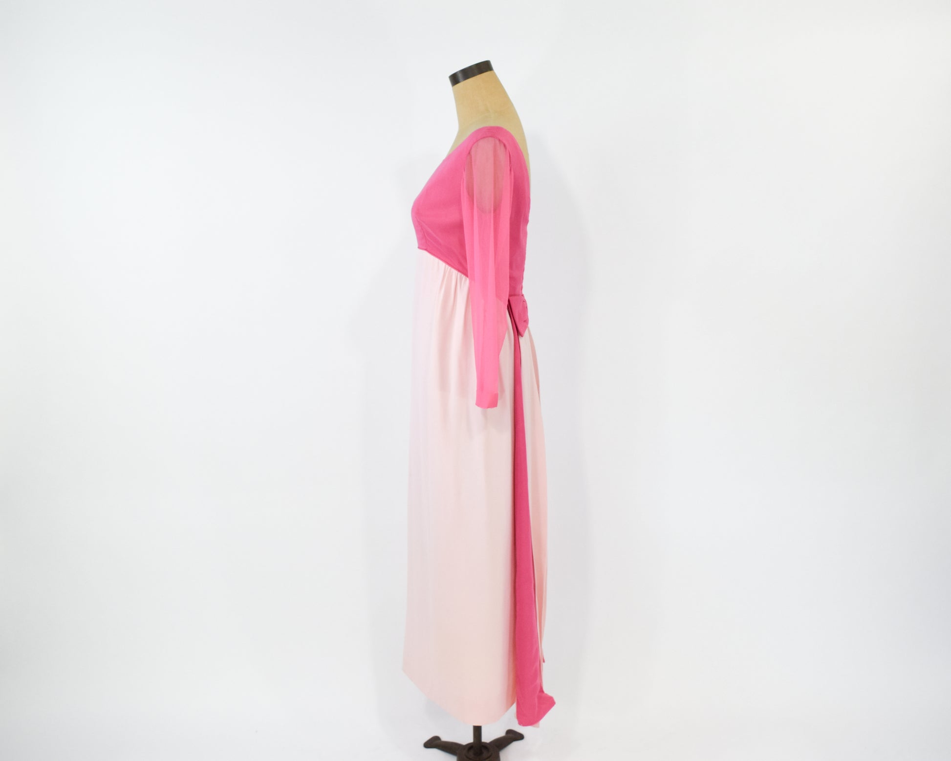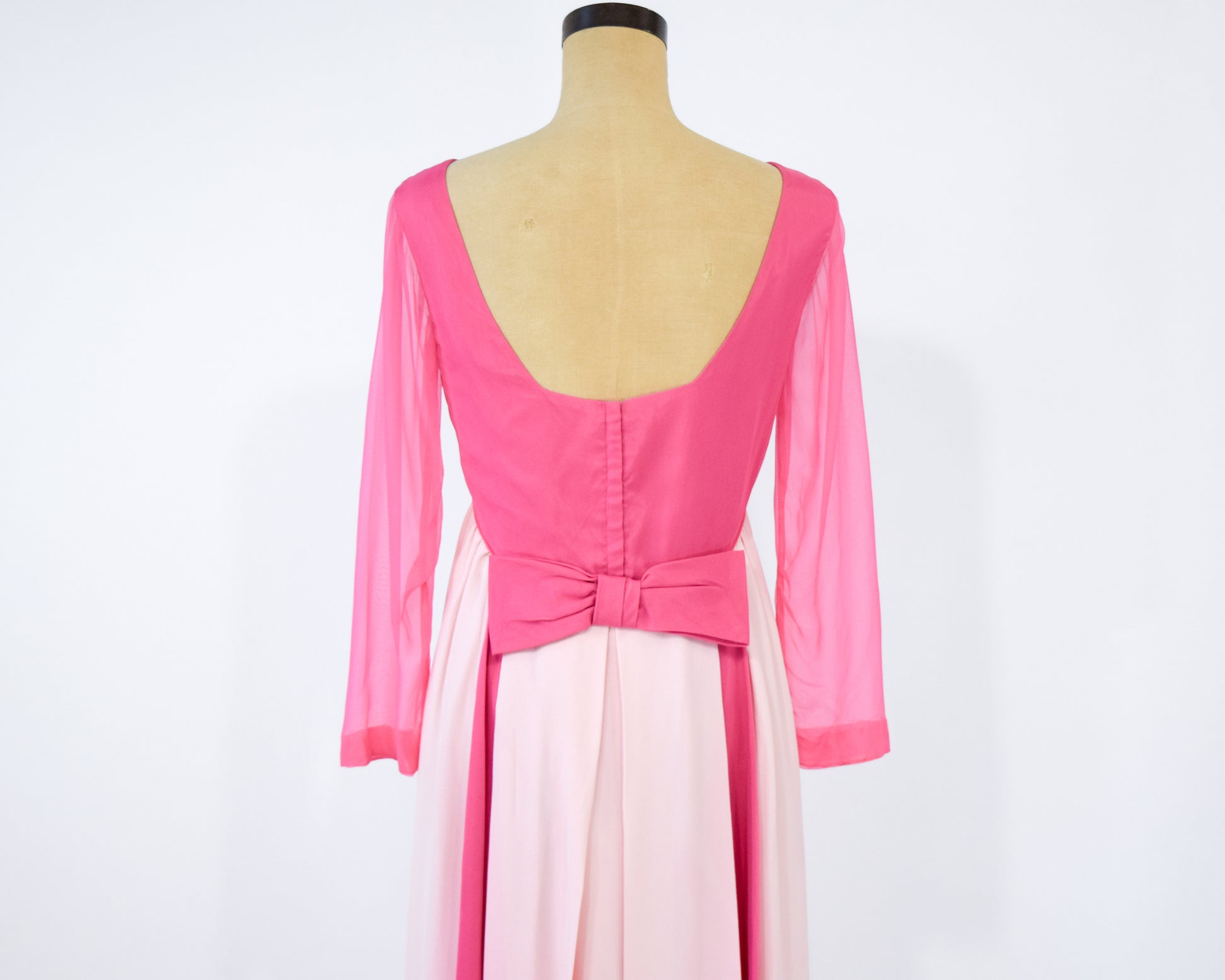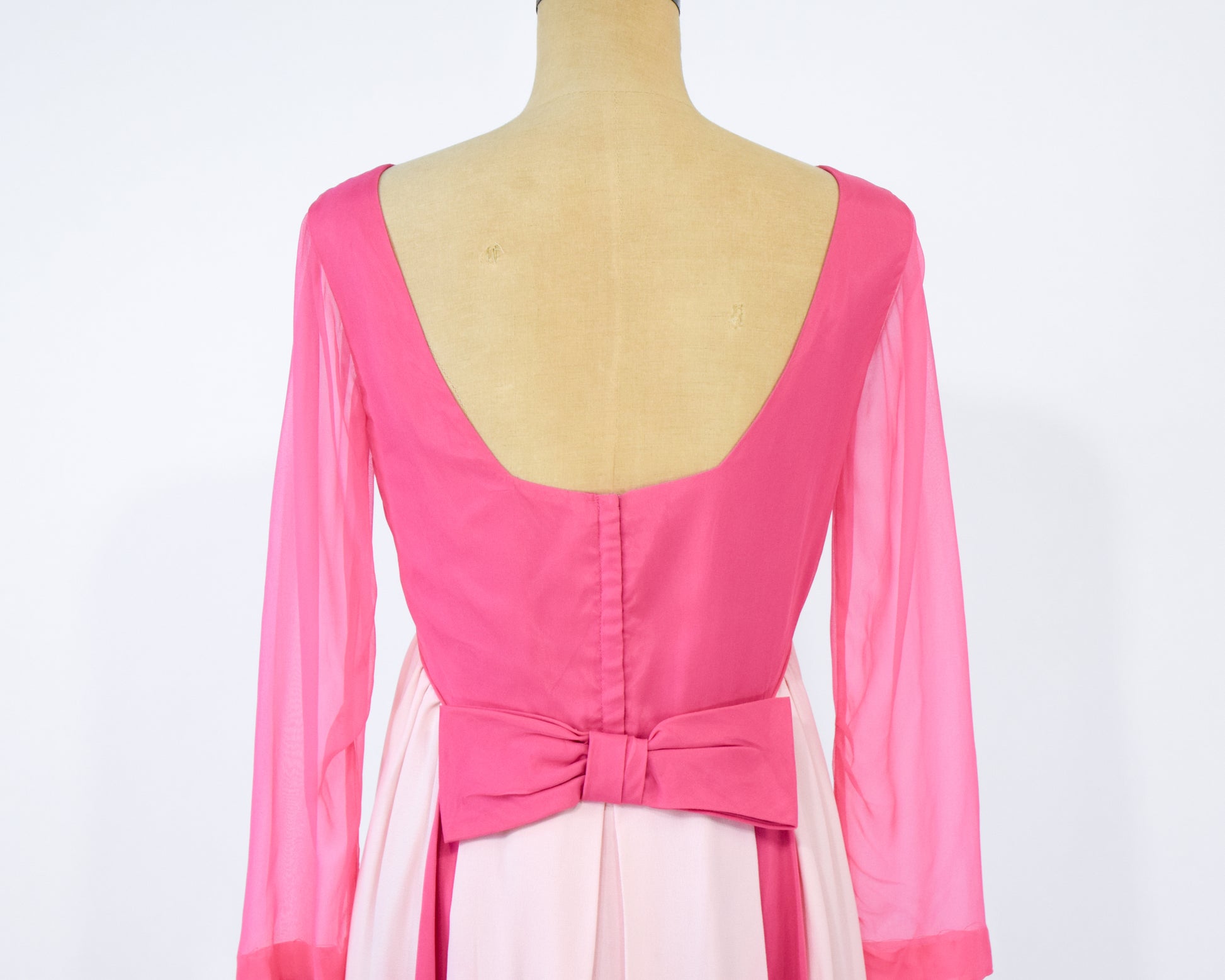 Condition: Very Good. There is some discoloration at the hem. In the skirt, the darker pink has bled onto the lighter pink. This is mostly on the long panel with the bow and is hardly noticeable when worn.