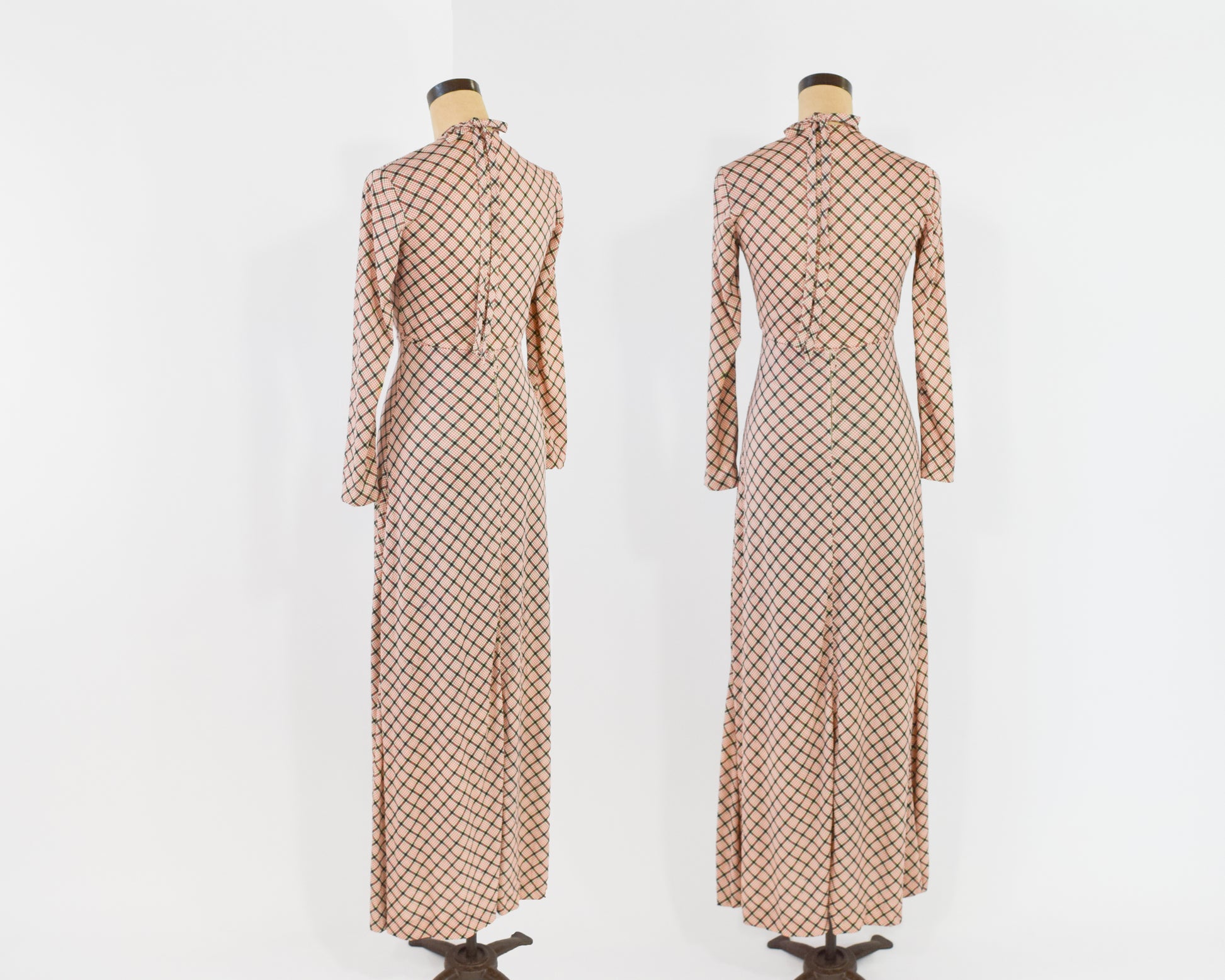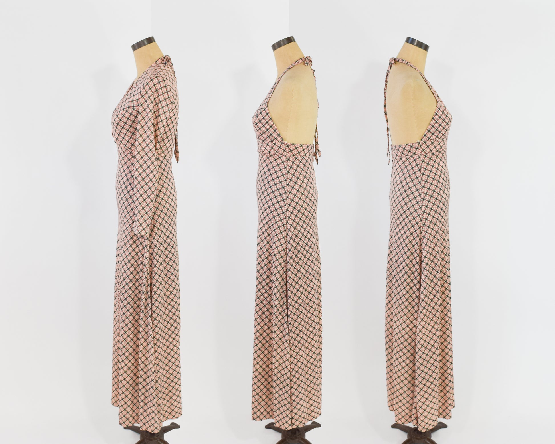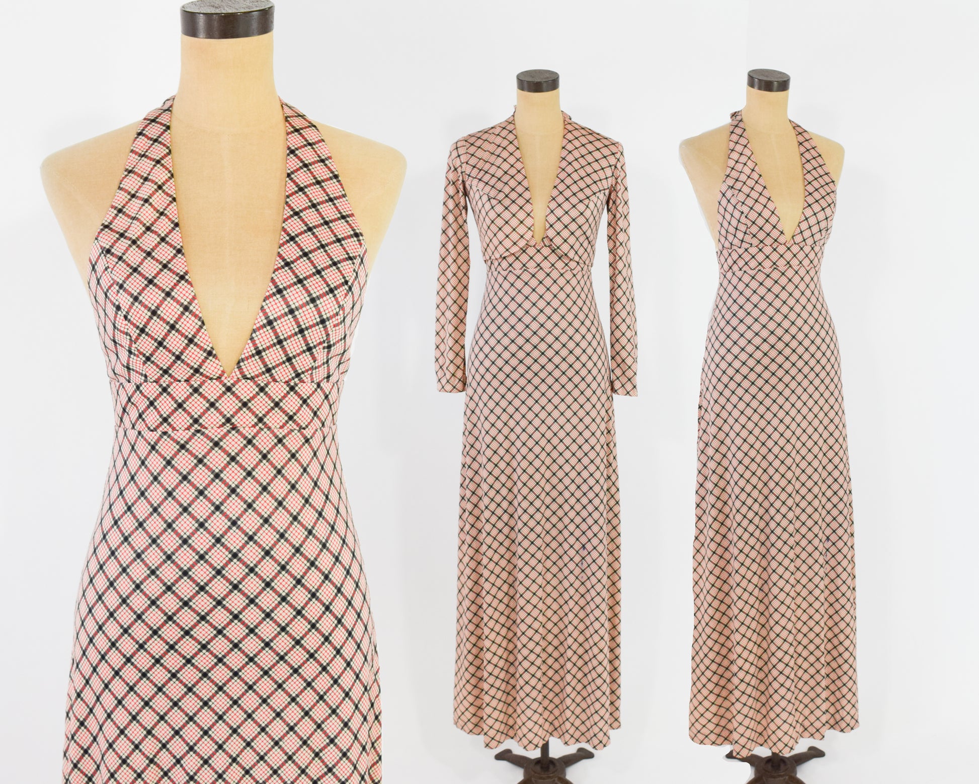 1970s Beige Plaid Halter Dress & Jacket Set | Red Geometric Print Maxi Dress Shrug Set