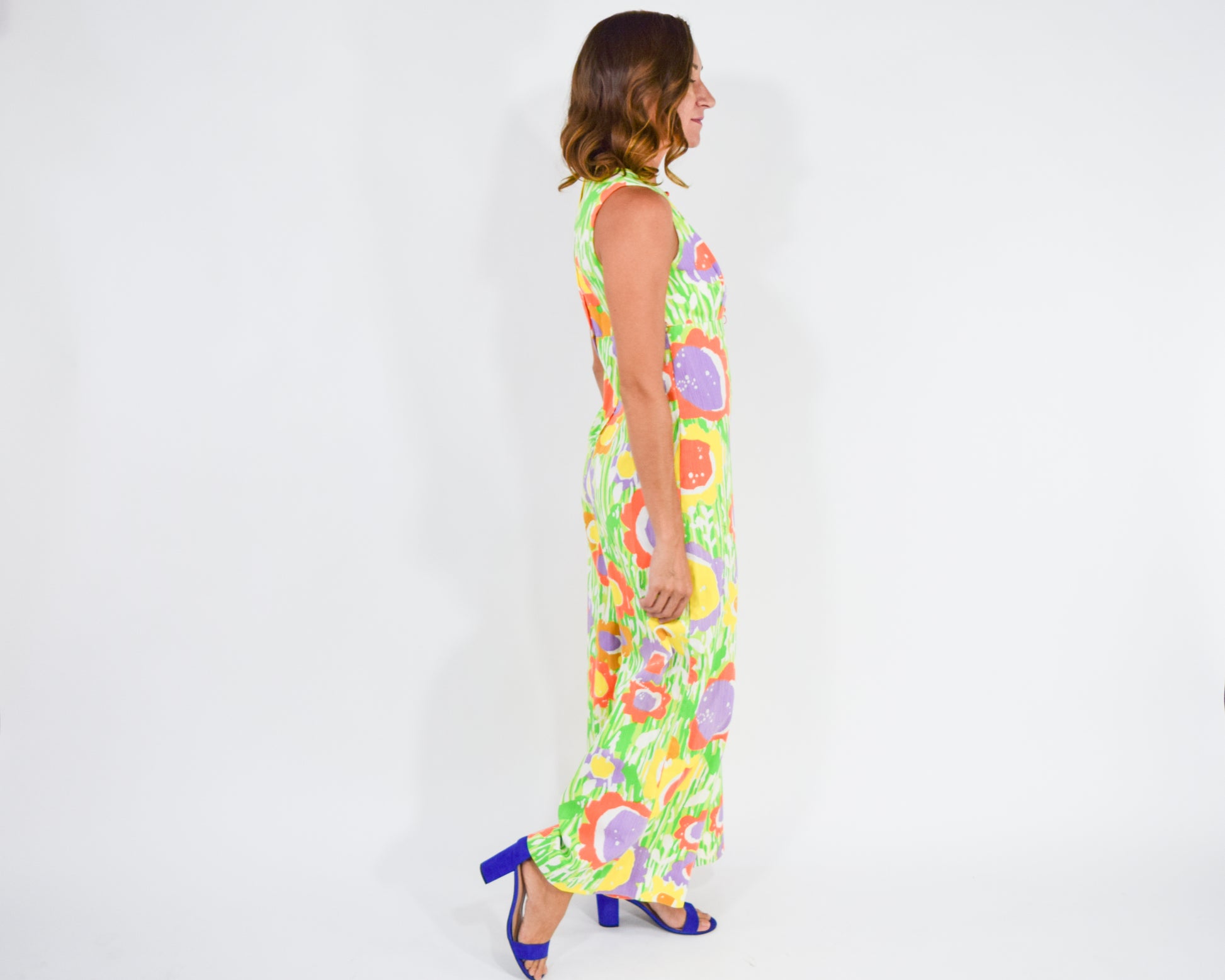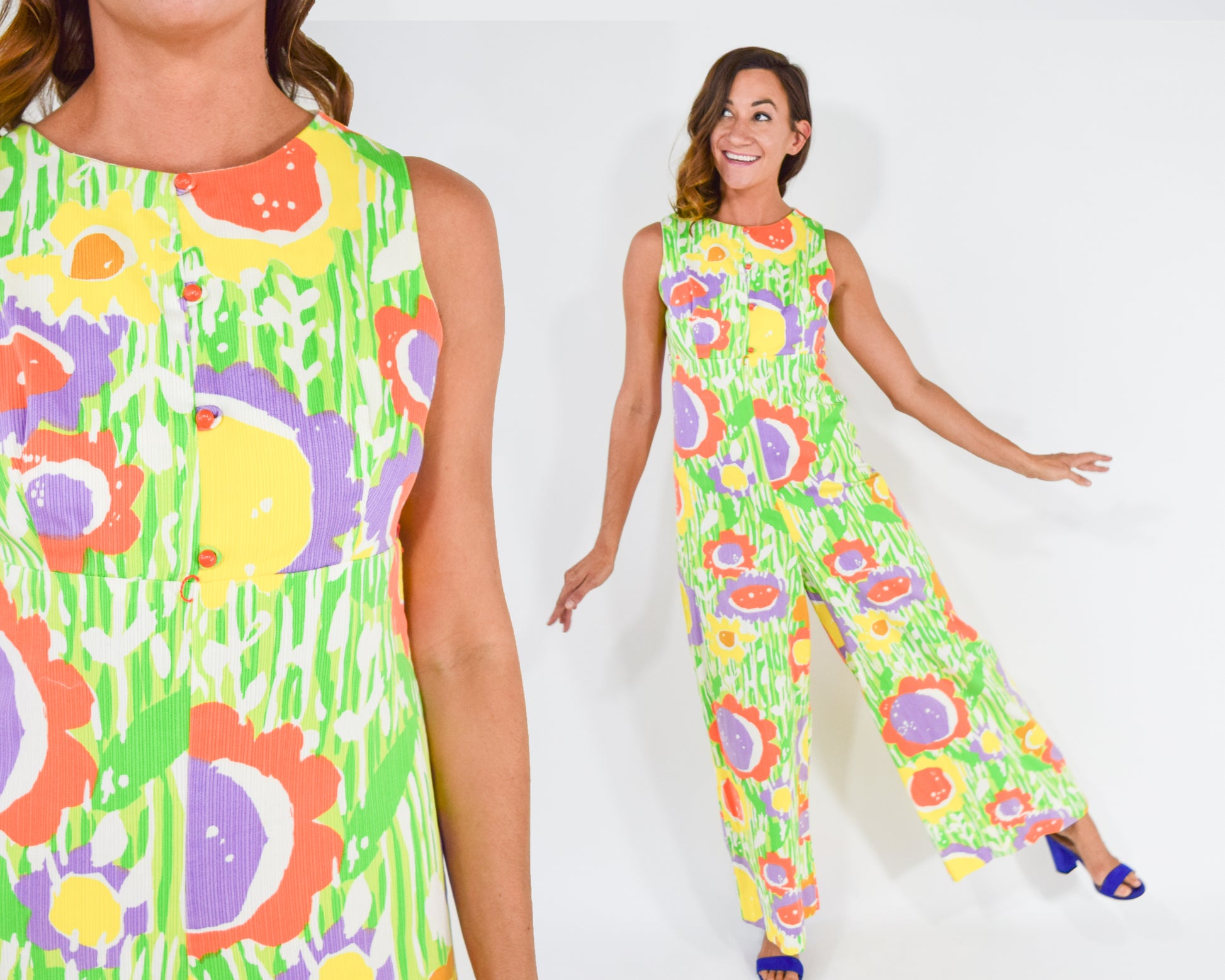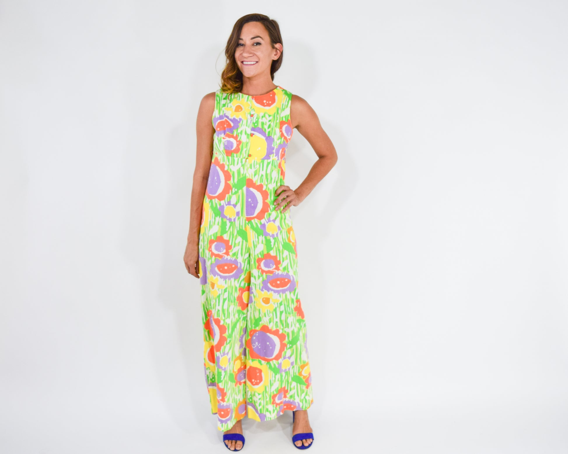 ~ Delightfully colorful green wide leg jumpsuit from the 1960s