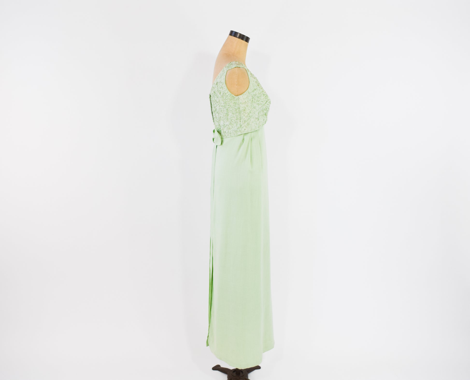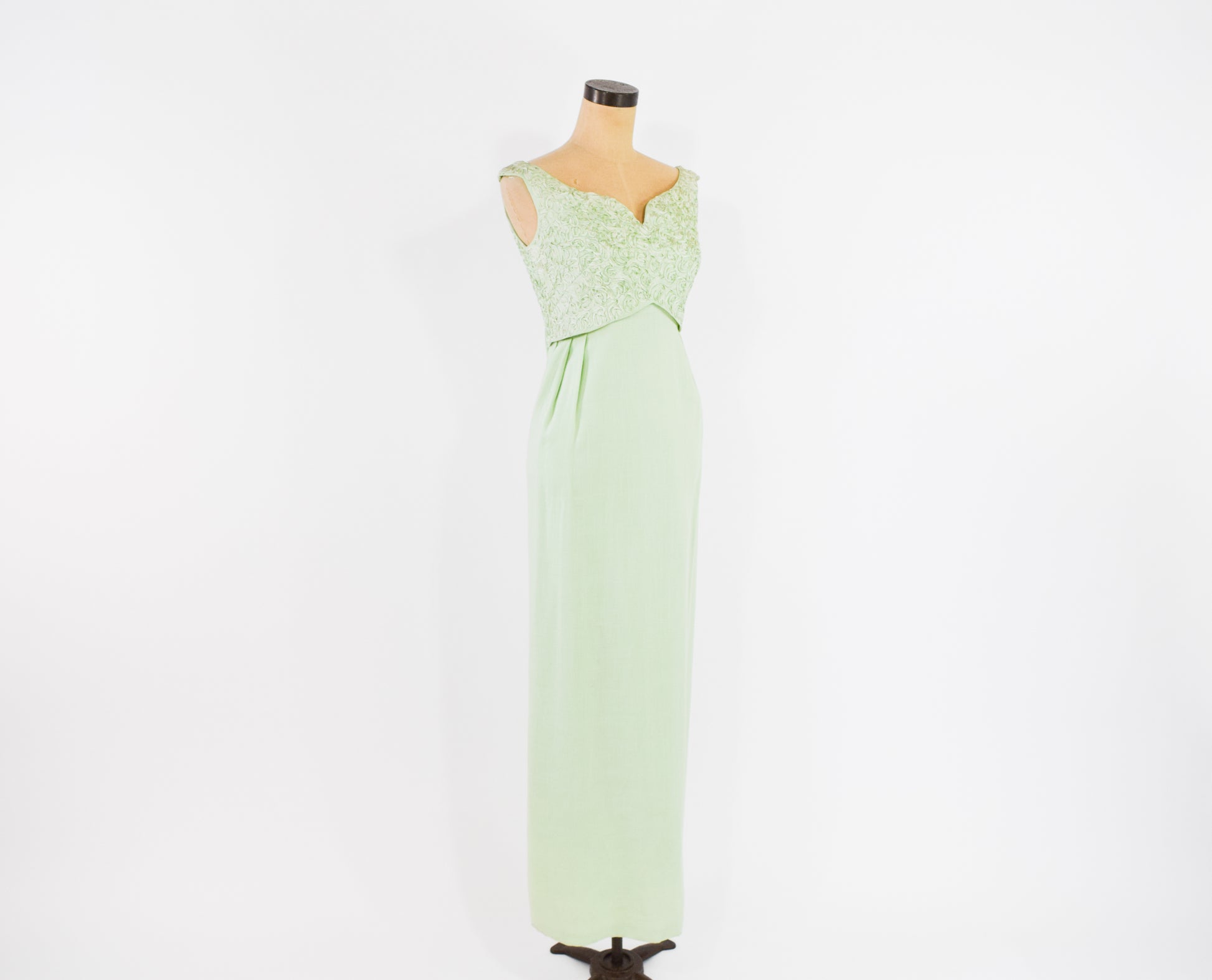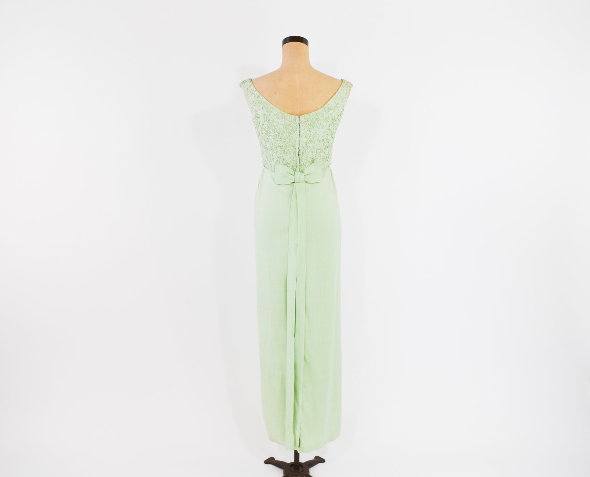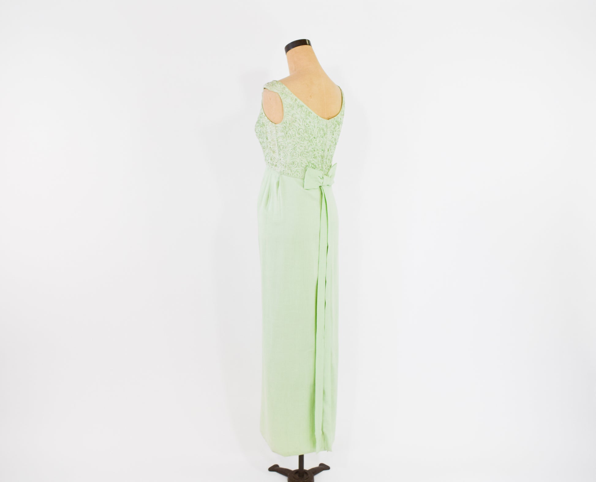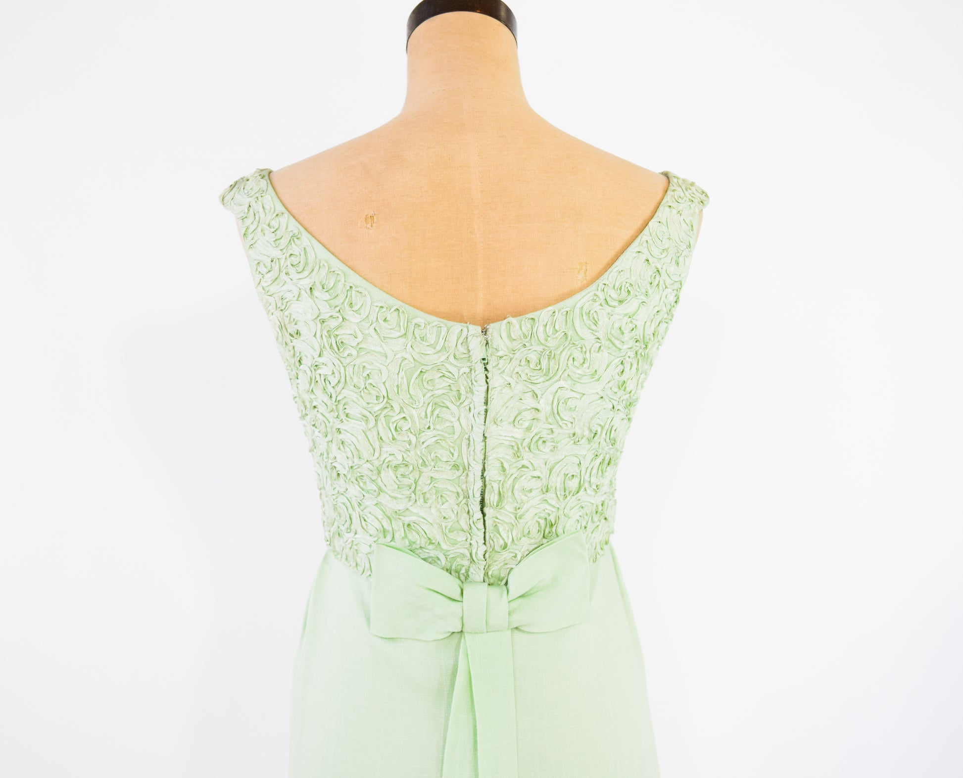 Lovely mint green lace column dress with a bow detail from the 1960s. The bodice is a beautiful soutache lace, lined in the same material as the skirt. The cotton blend skirt is unlined. Flat bow with long tails, back metal zipper.