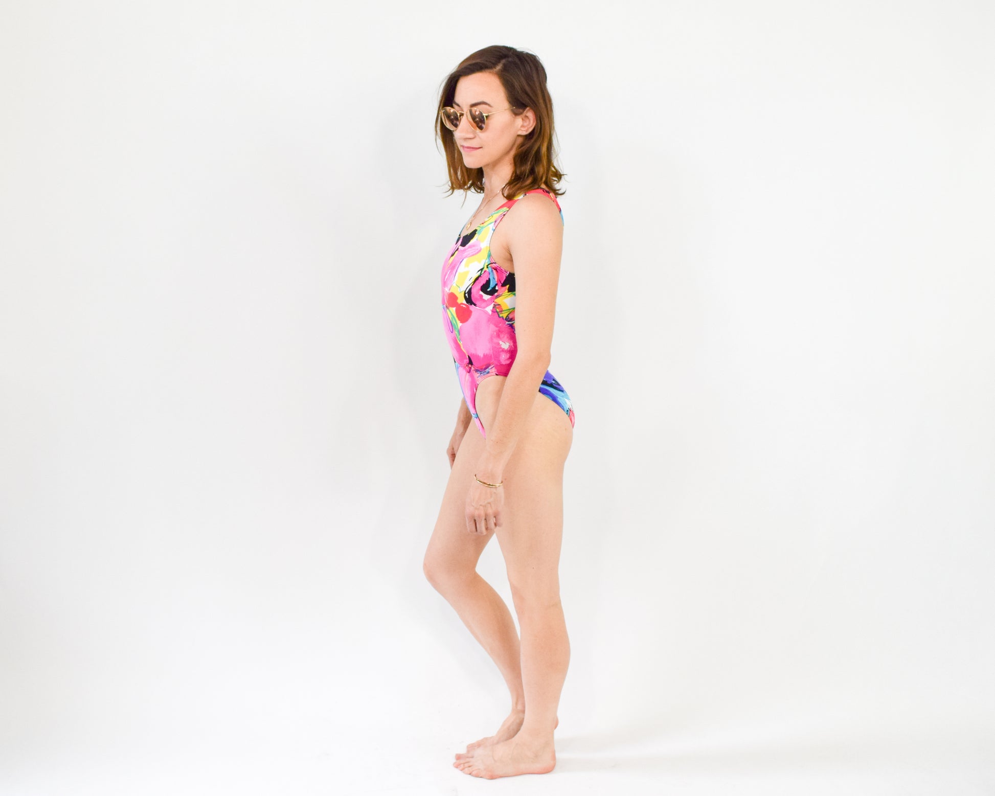 Vibrant hot pink and multicolor floral print swimsuit set from the 1980s. Features a high-cut one-piece bodysuit paired with matching shorts, designed with a playful asymmetric leg (one longer than the other). The shorts sit at a high, elastic waist. A bold and unique vintage look. Excellent vintage condition. Size Small.
