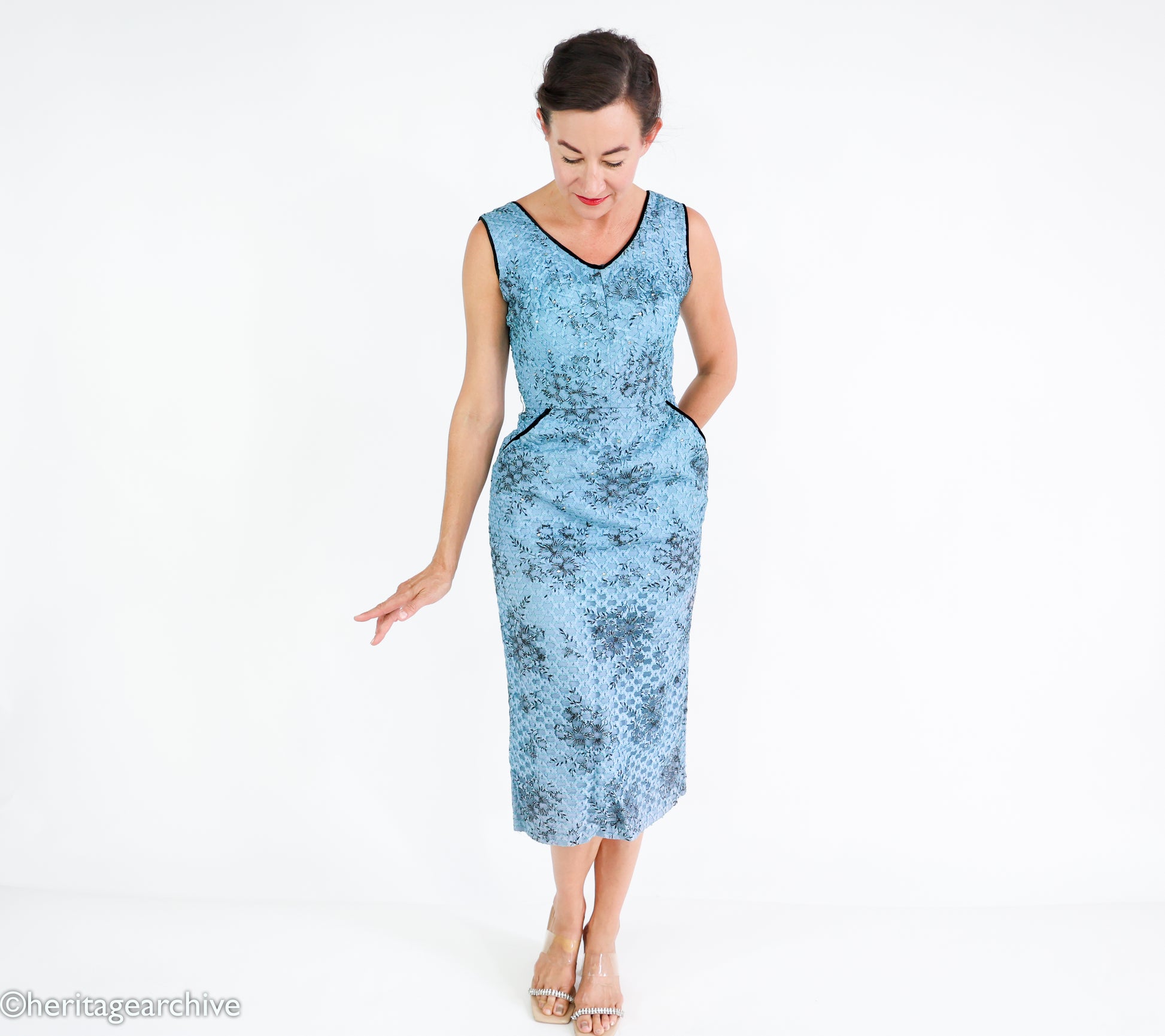 Exquisite early 1950s sky blue wiggle cocktail dress, crafted with soutache ribbon lace layered over floral printed taffeta. The design is brought to life with handset rhinestones that add a subtle sparkle, while black velvet trim at the collar, arms, and pockets gives refined contrast. Beautifully tailored hip pockets enhance the silhouette, making this a perfect example of midcentury cocktail elegance. Finished with a side metal zipper for closure.