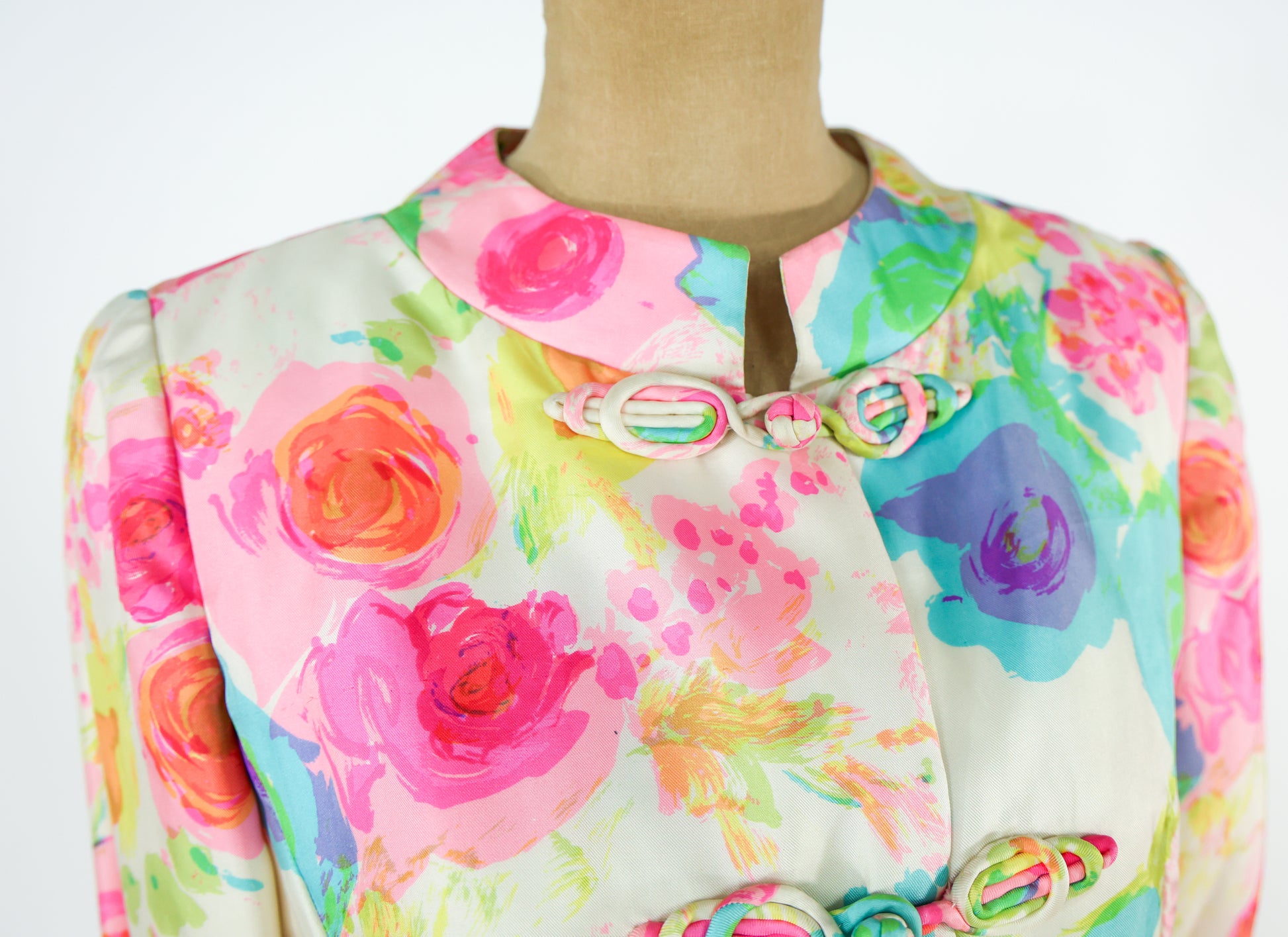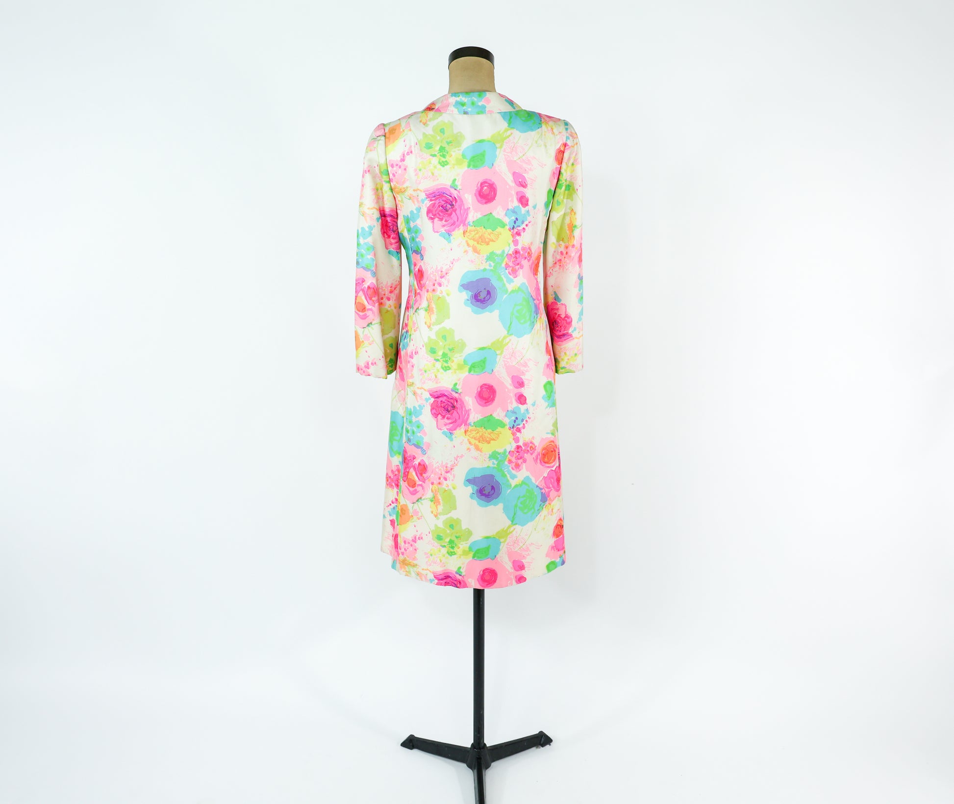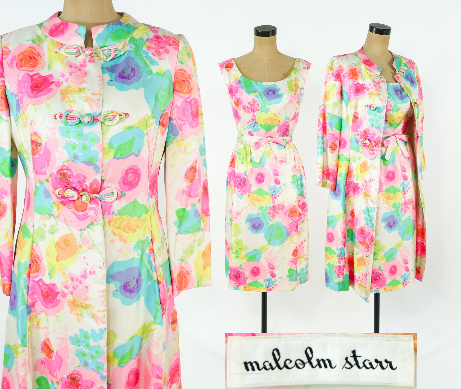 An exquisite 1960s Malcolm Starr dress and coat set in vibrant floral silk, bursting with vivid pinks, greens, yellows, and blues on a crisp white ground. The sleeveless sheath dress features a matching bow belt, back zipper closure, and lightweight cotton lining for comfort. Its coordinating coat is equally striking, finished with colorful frog closures, hidden side pockets, and a full white taffeta lining. A rare and beautiful ensemble that captures the glamour of midcentury occasion wear. Excellent vintage condition.