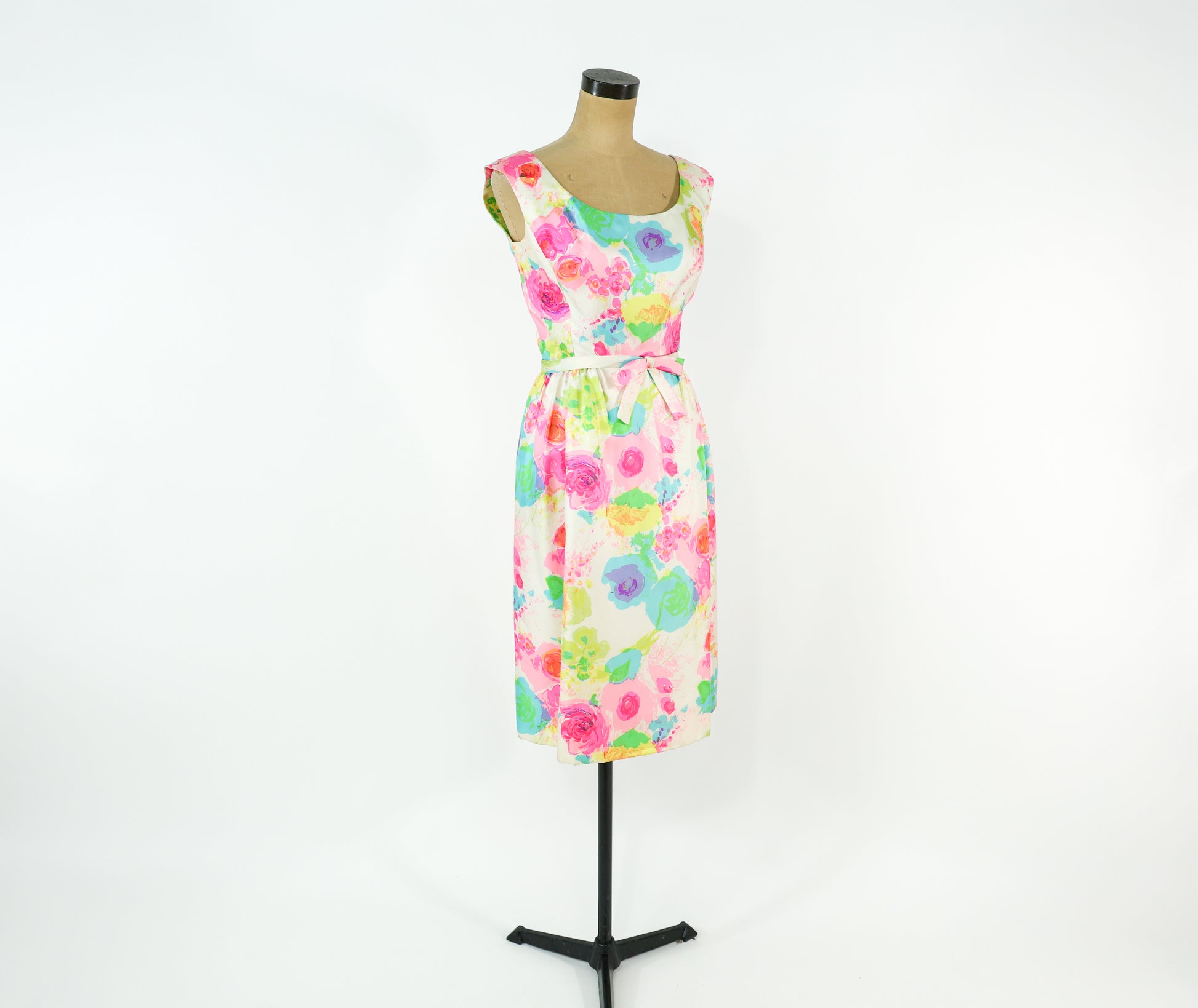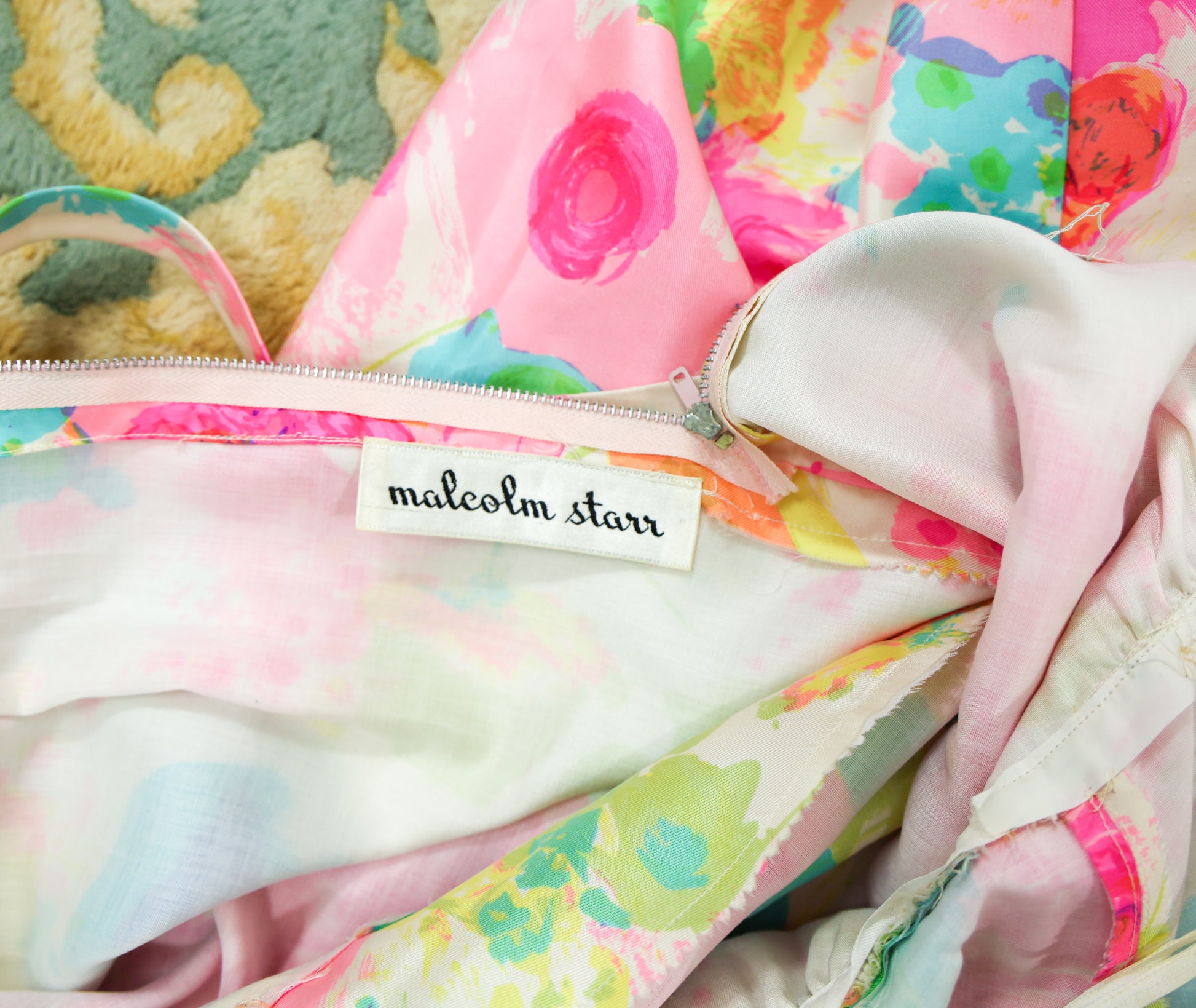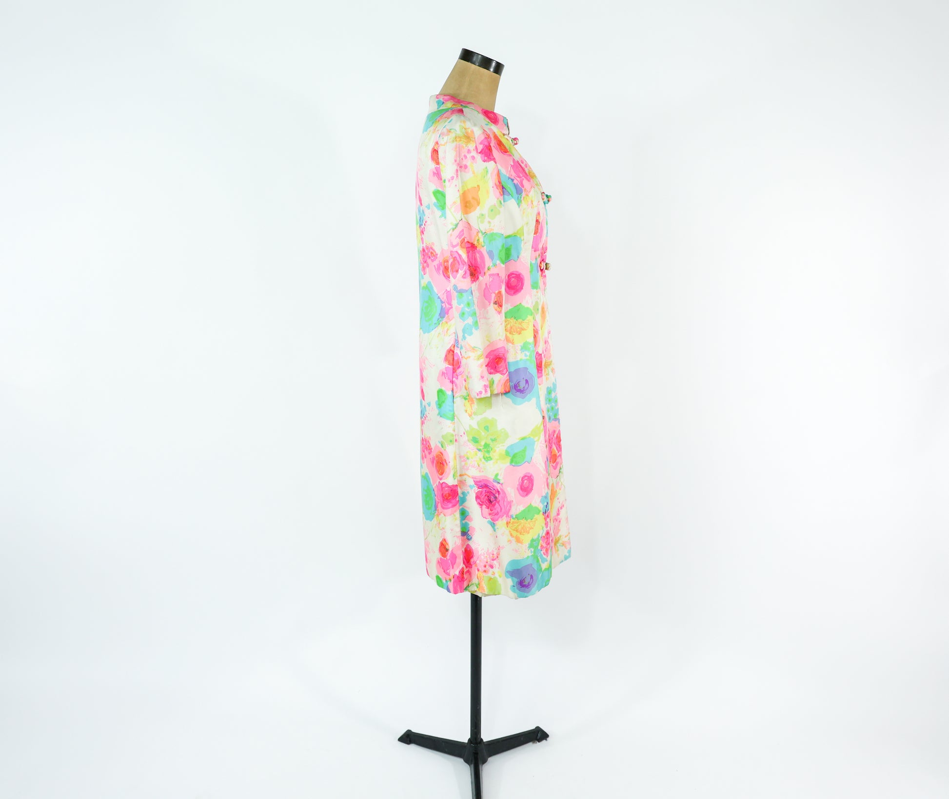 An exquisite 1960s Malcolm Starr dress and coat set in vibrant floral silk, bursting with vivid pinks, greens, yellows, and blues on a crisp white ground. The sleeveless sheath dress features a matching bow belt, back zipper closure, and lightweight cotton lining for comfort. Its coordinating coat is equally striking, finished with colorful frog closures, hidden side pockets, and a full white taffeta lining. A rare and beautiful ensemble that captures the glamour of midcentury occasion wear. Excellent vintage condition.
