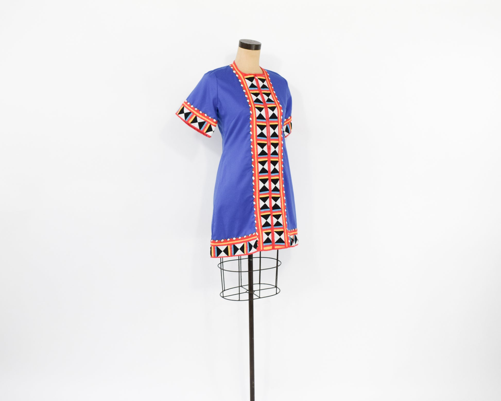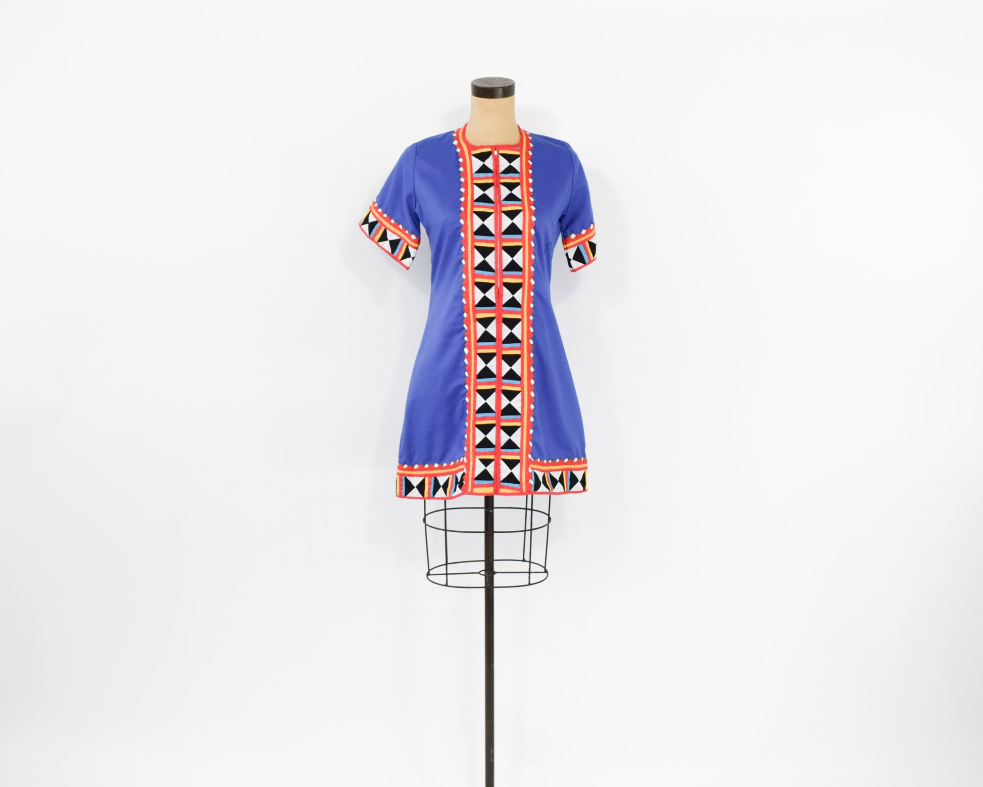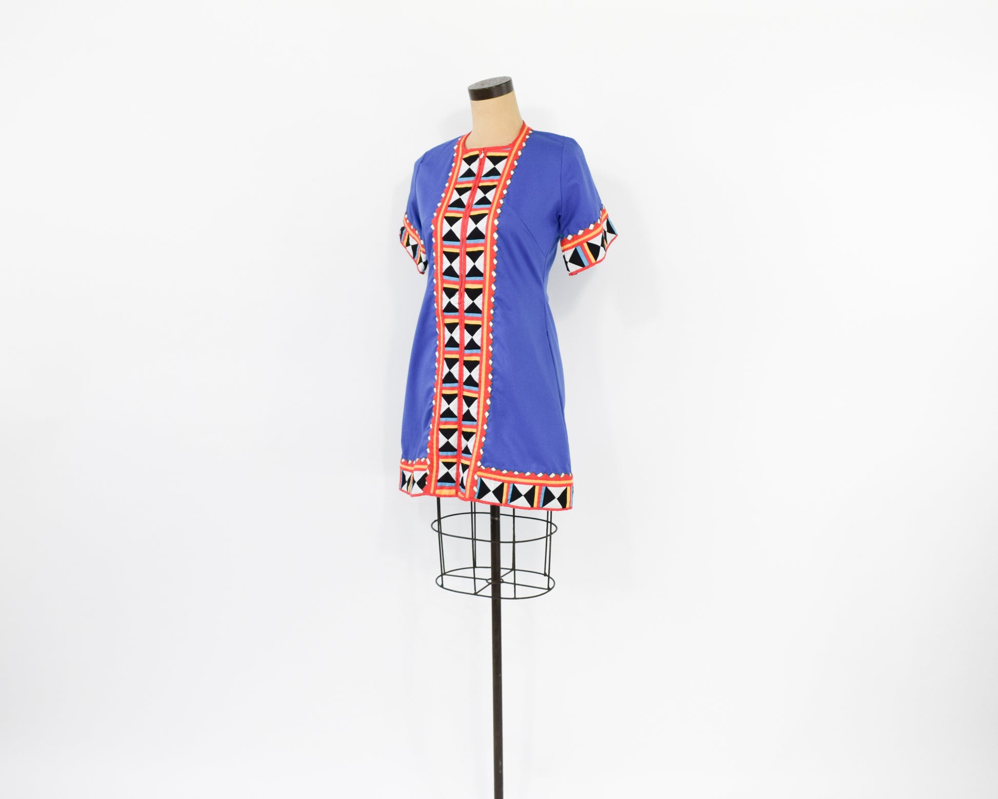 Great blue cotton embroidered day dress from the 1960s. Geometric red, black, white, yellow embroidered trim. Short sleeve with a metal zipper in the front, unlined cotton. Excellent vintage condition. Size Small.