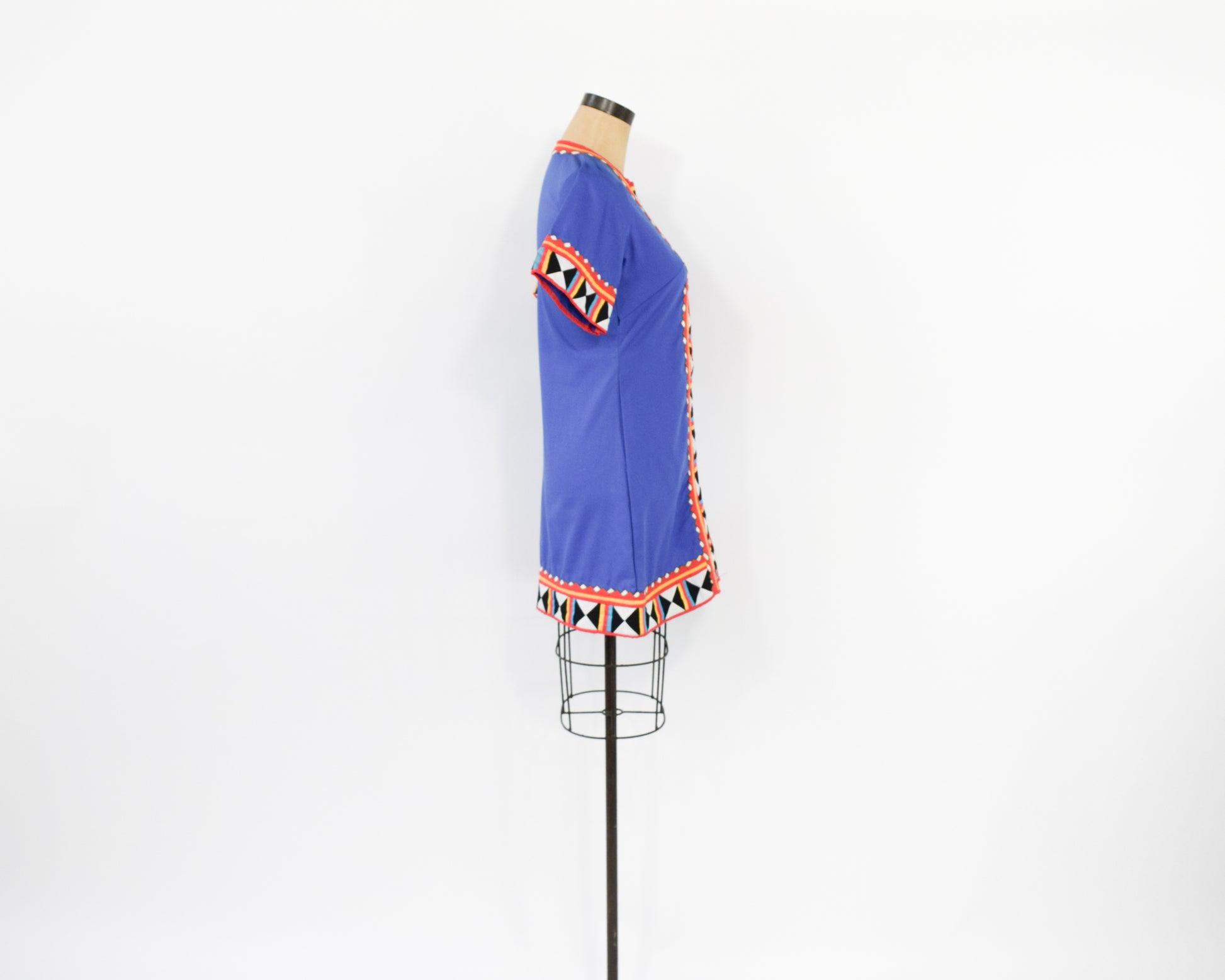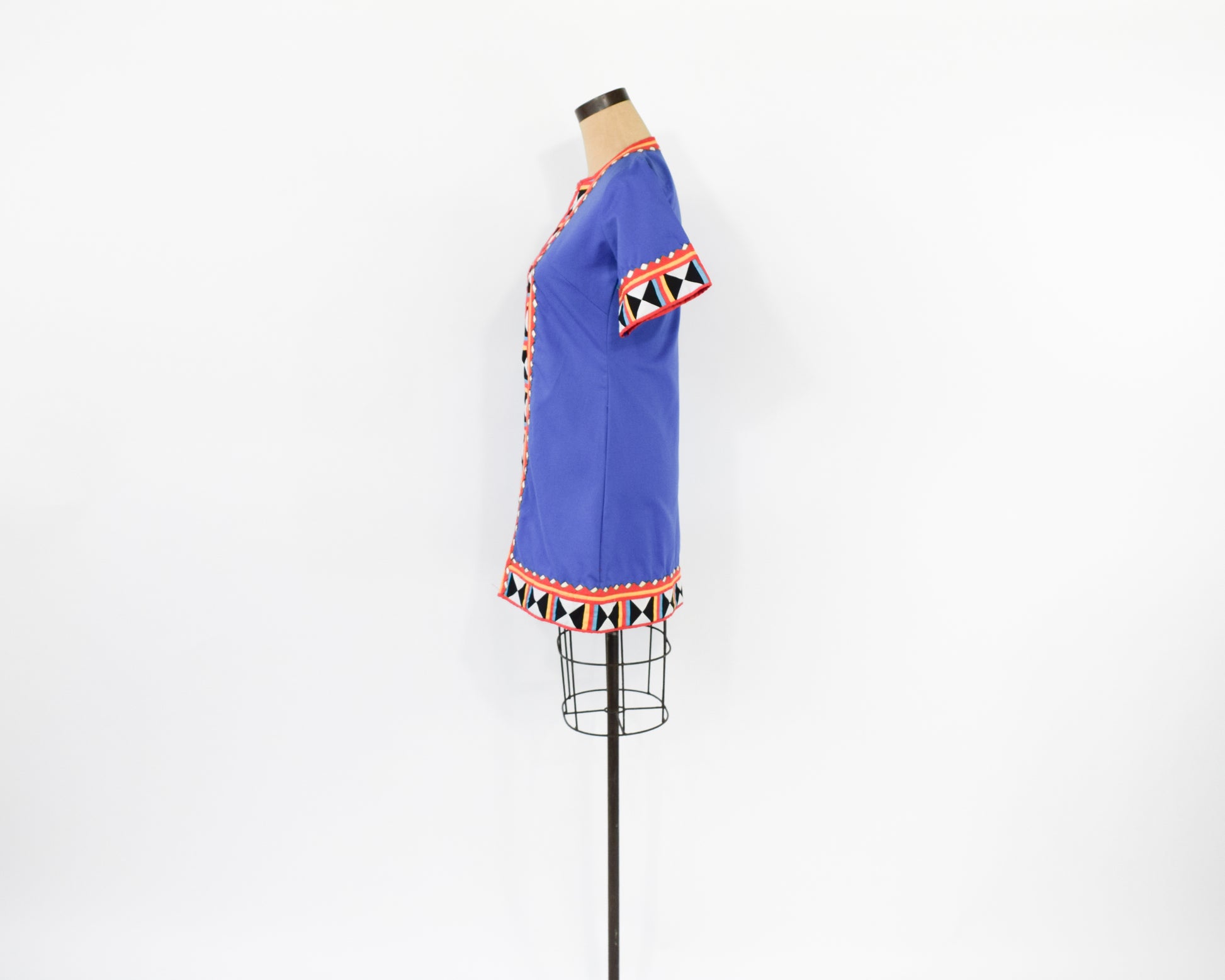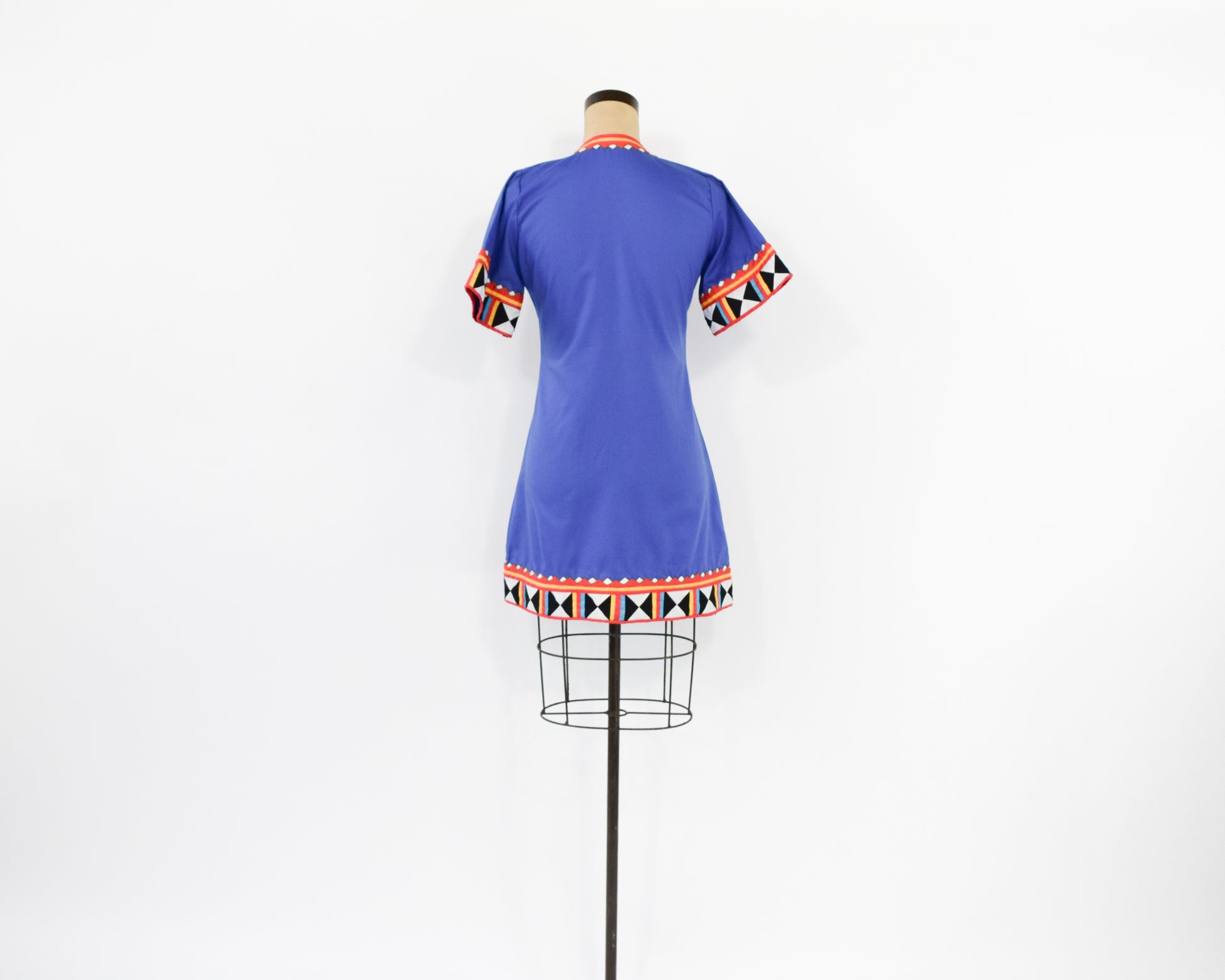 Great blue cotton embroidered day dress from the 1960s. Geometric red, black, white, yellow embroidered trim. Short sleeve with a metal zipper in the front, unlined cotton. Excellent vintage condition. Size Small.