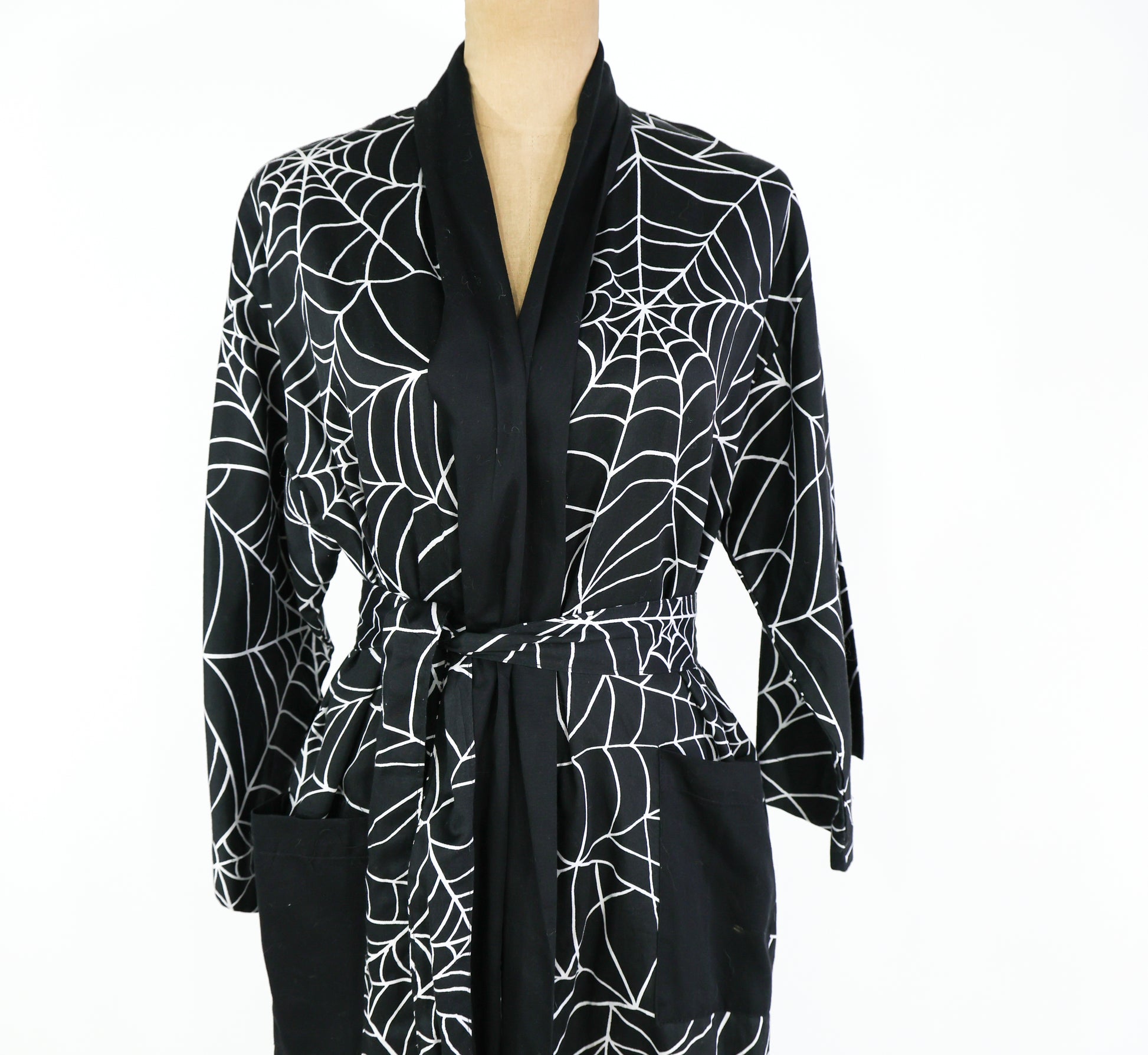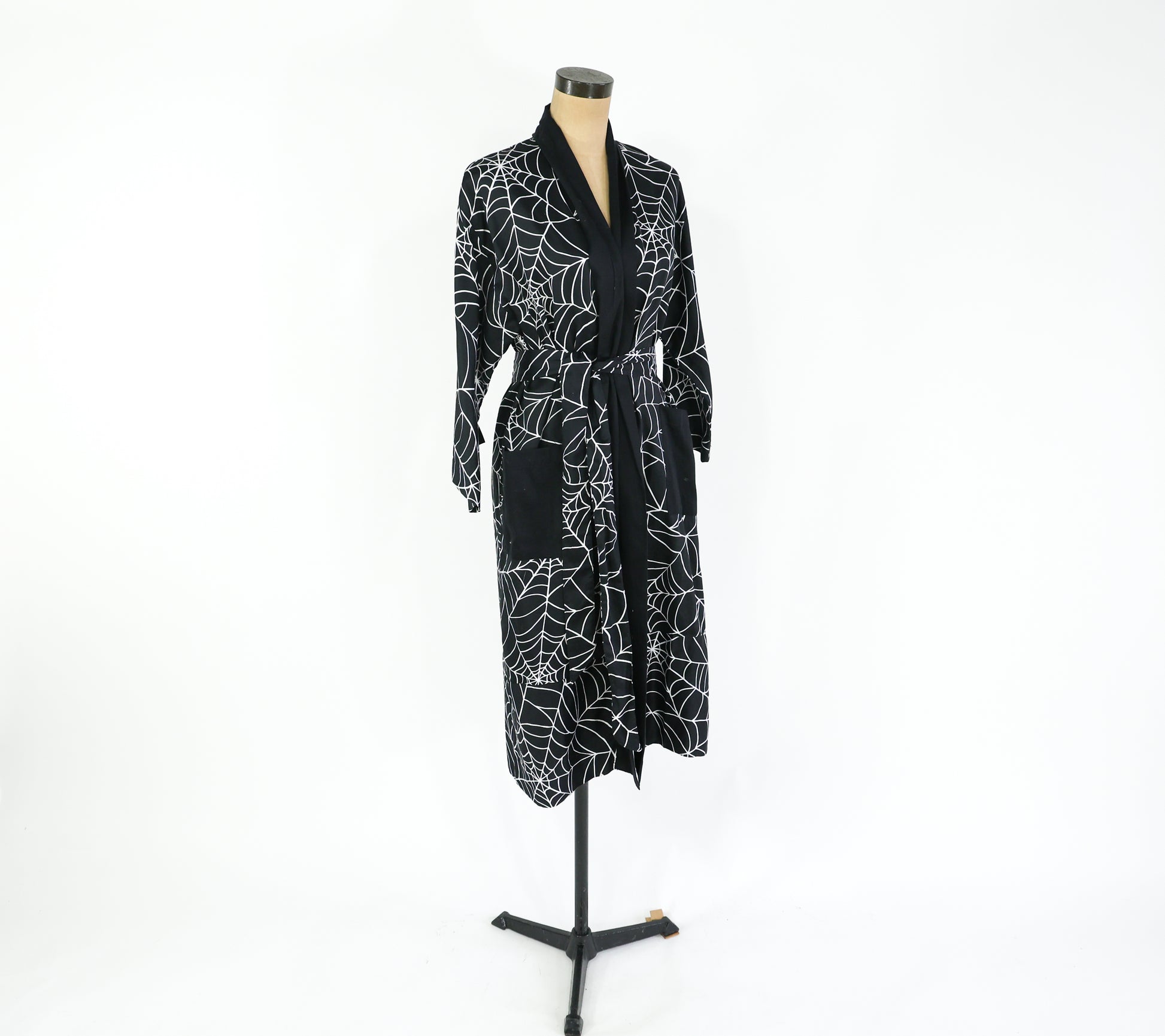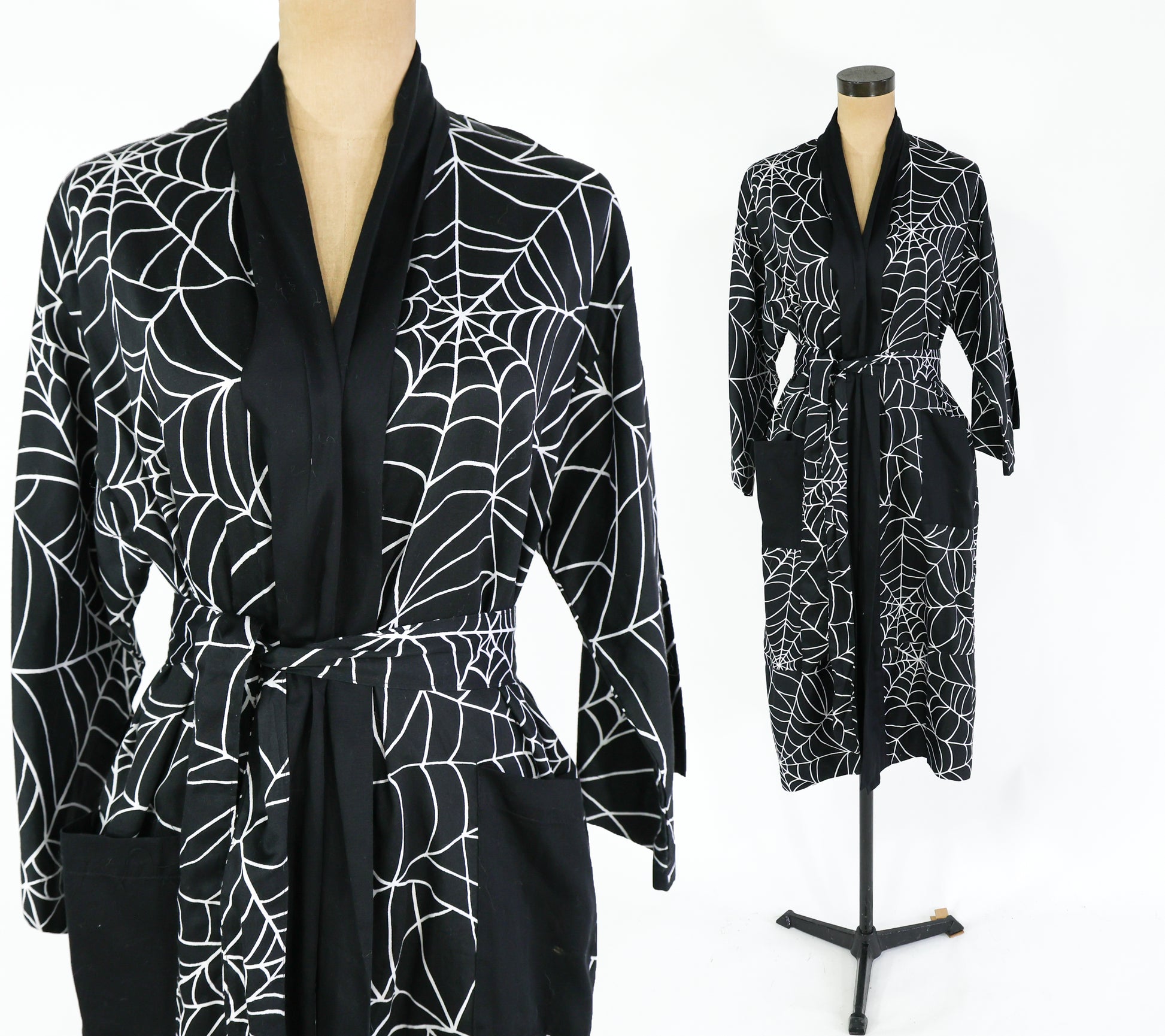 Fantastic black cotton spider web print robe from the 1990s. Wrap style dressing gown is lightweight cotton, unlined, and has 2 patch pockets at the hips. Excellent vintage condition. Size S/M.