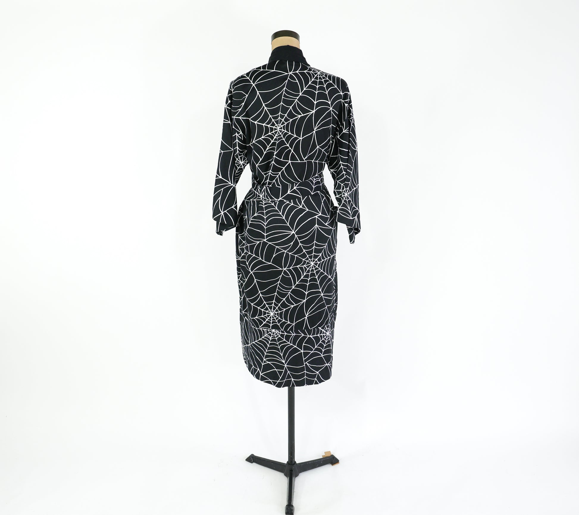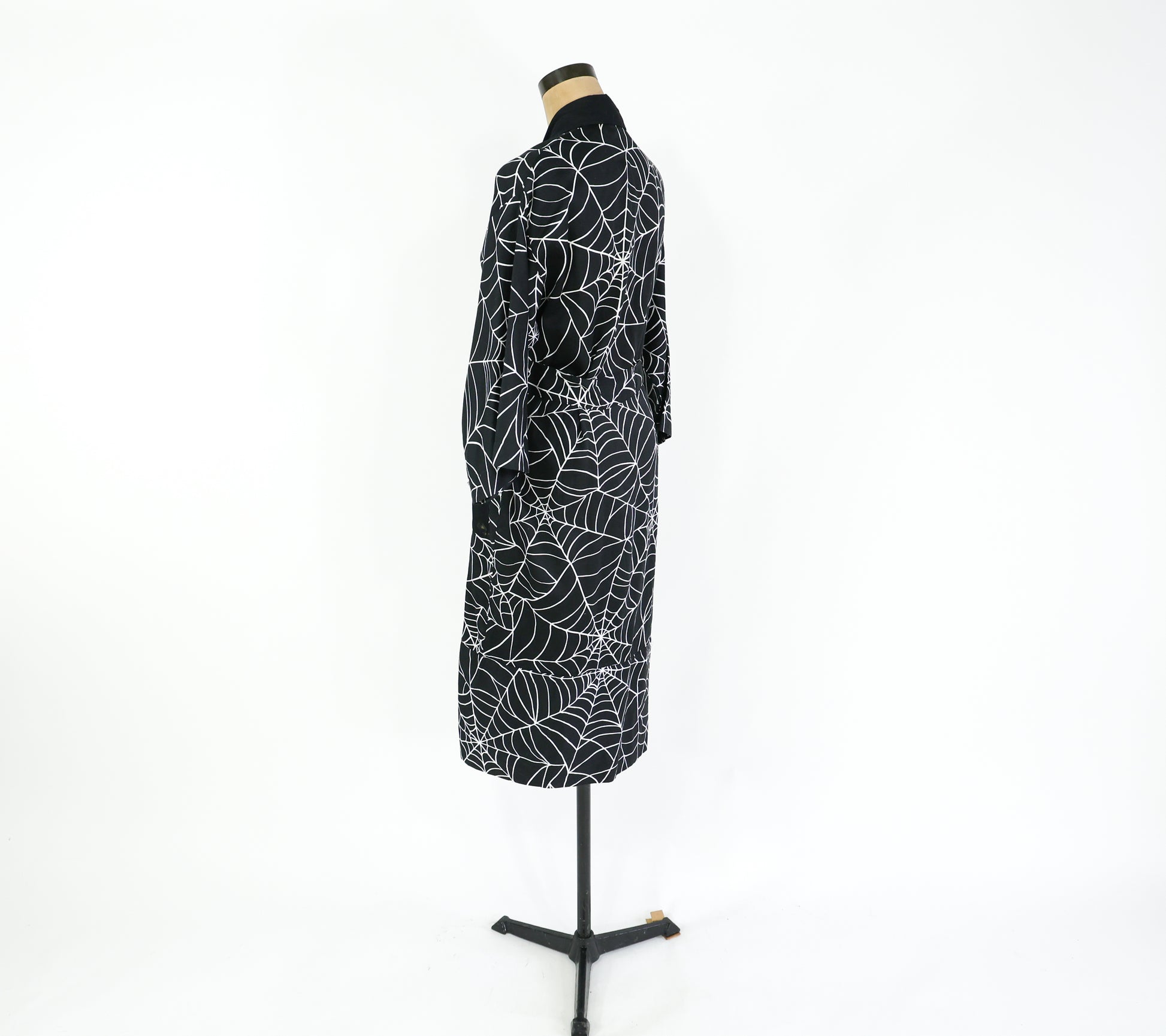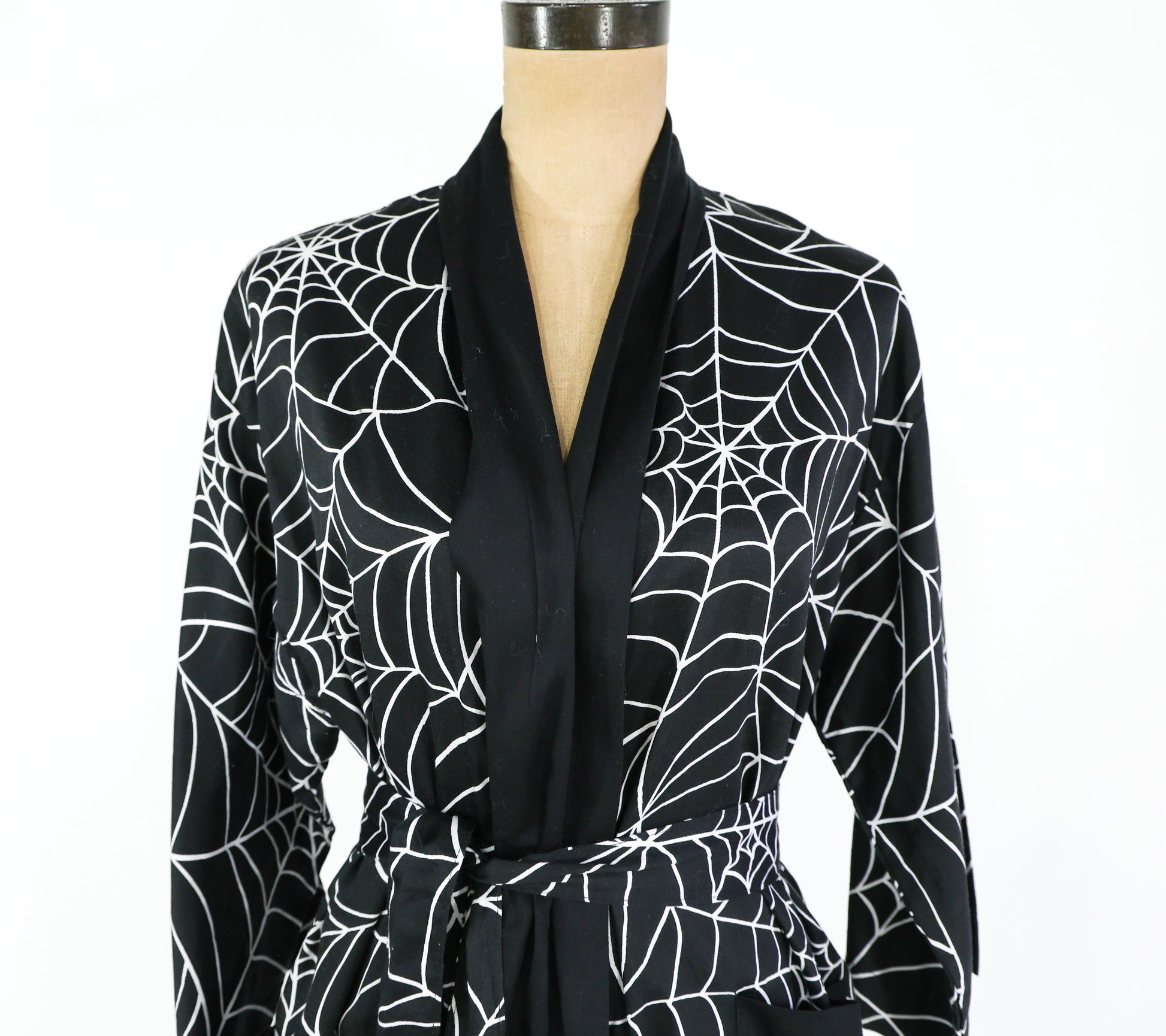 Fantastic black cotton spider web print robe from the 1990s. Wrap style dressing gown is lightweight cotton, unlined, and has 2 patch pockets at the hips. Excellent vintage condition. Size S/M.