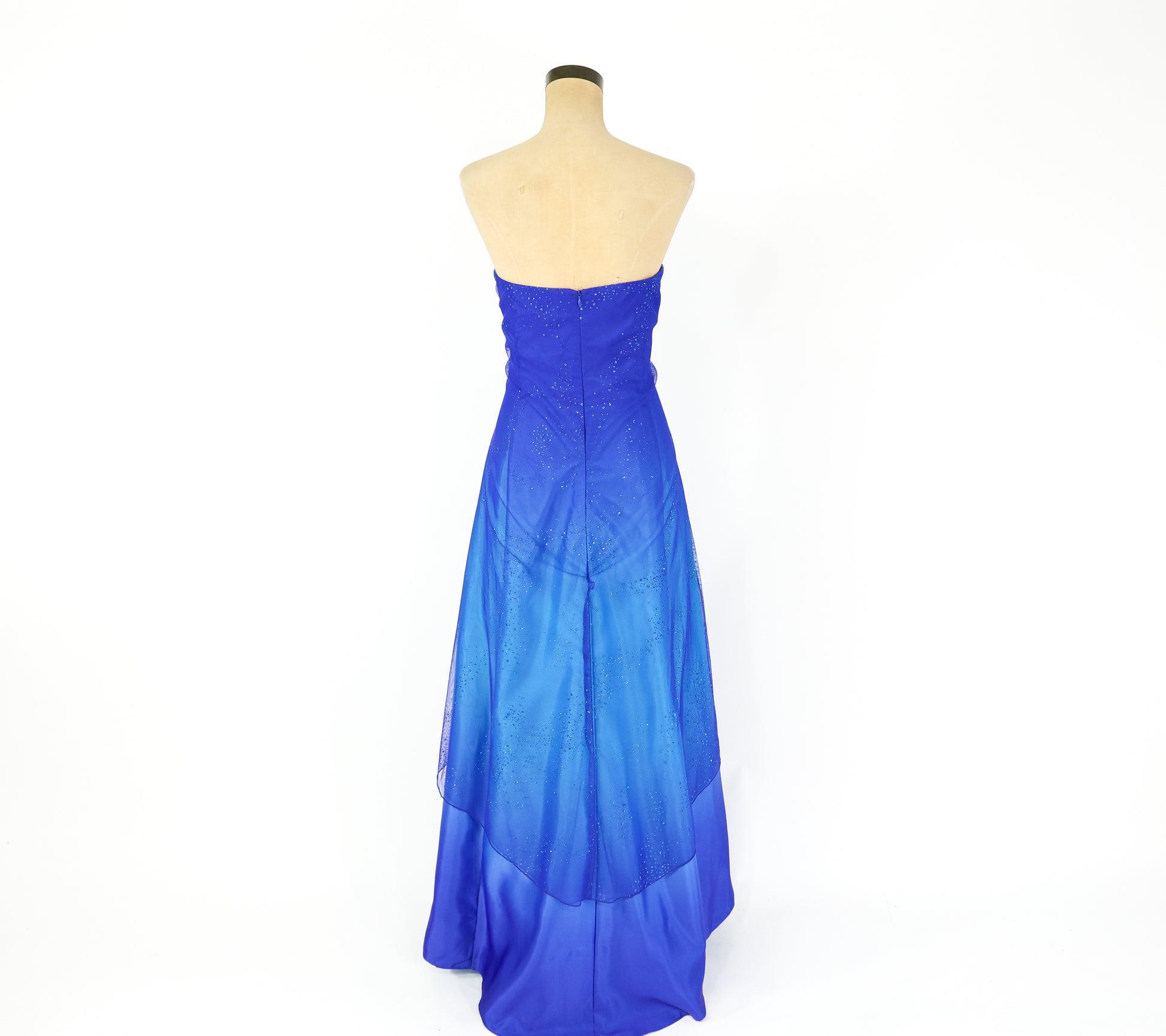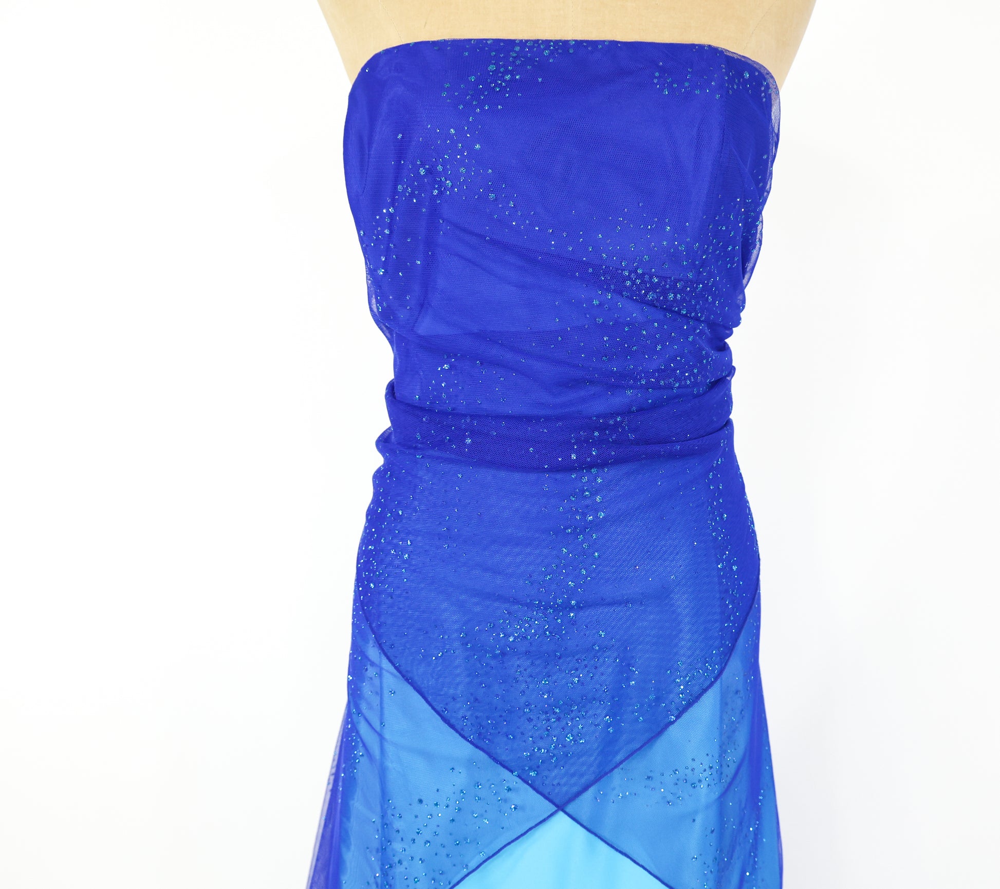 Shimmering blue glitter prom dress from the 1990s. Blue satin skirt fades from bright blue to darker royal blue. Tulle overlay sparkles with glitter. Back zipper for closure. Excellent vintage condition.