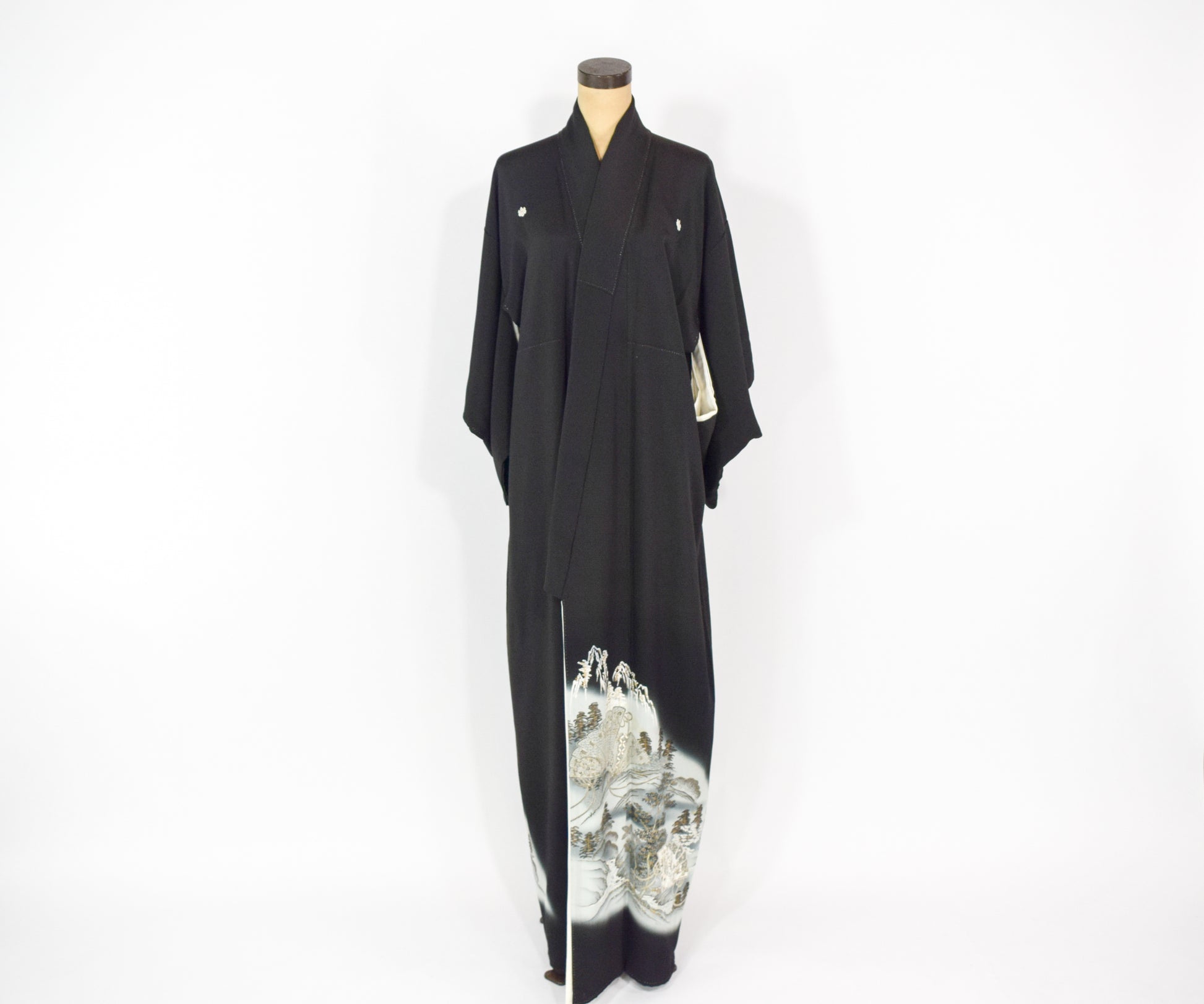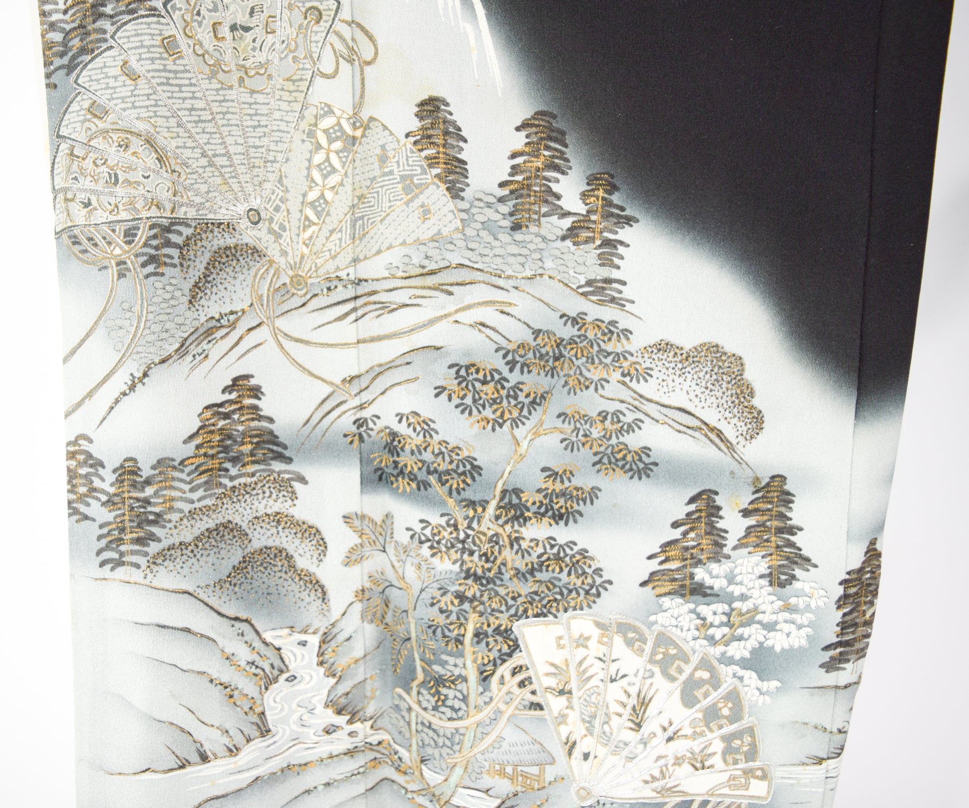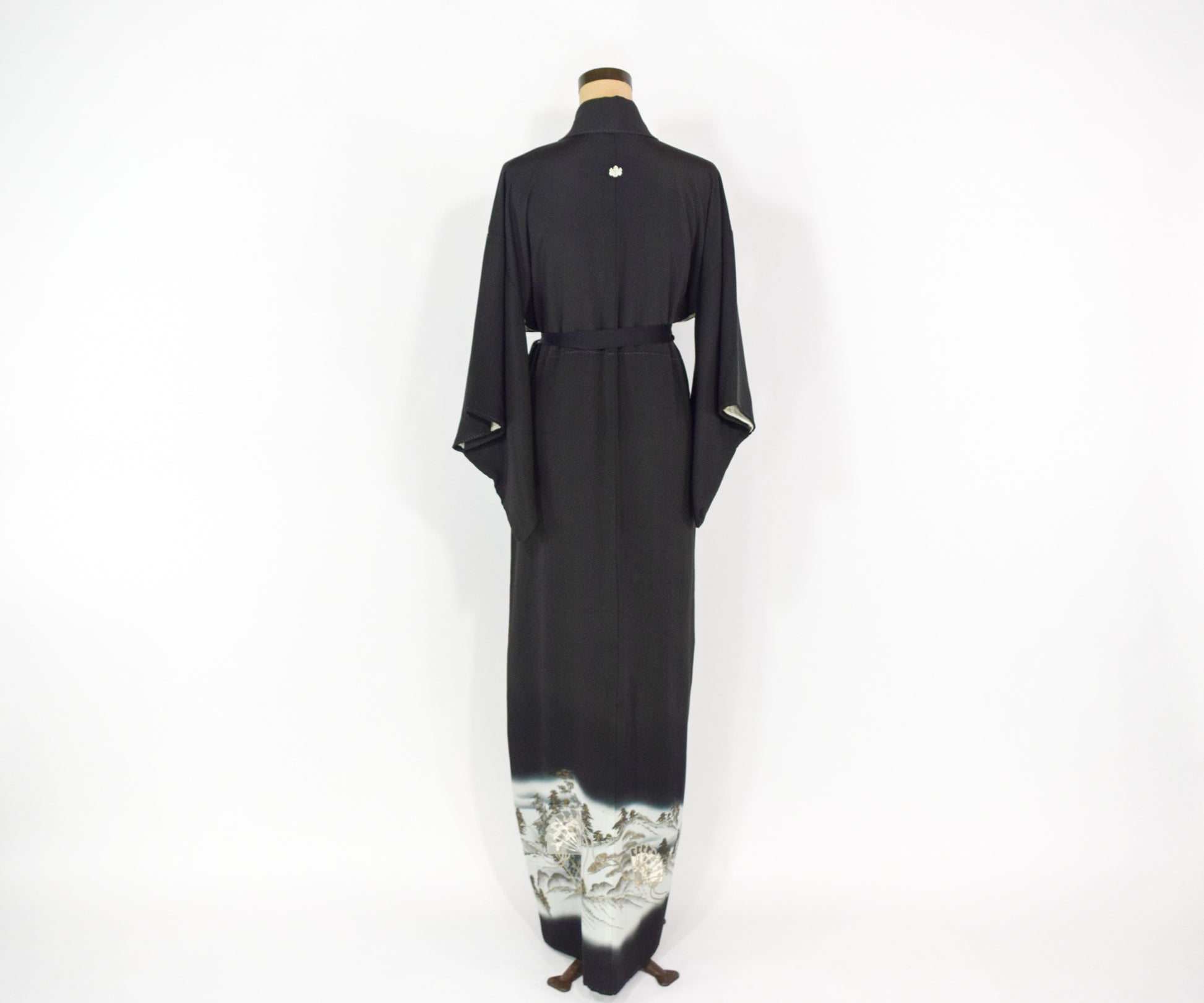 Extremely elegant black silk crepe with a stunning scenery print, metallic embroidery, and gold hand painting. Lined in white silk and crepe; there are some light spots on the white lining.