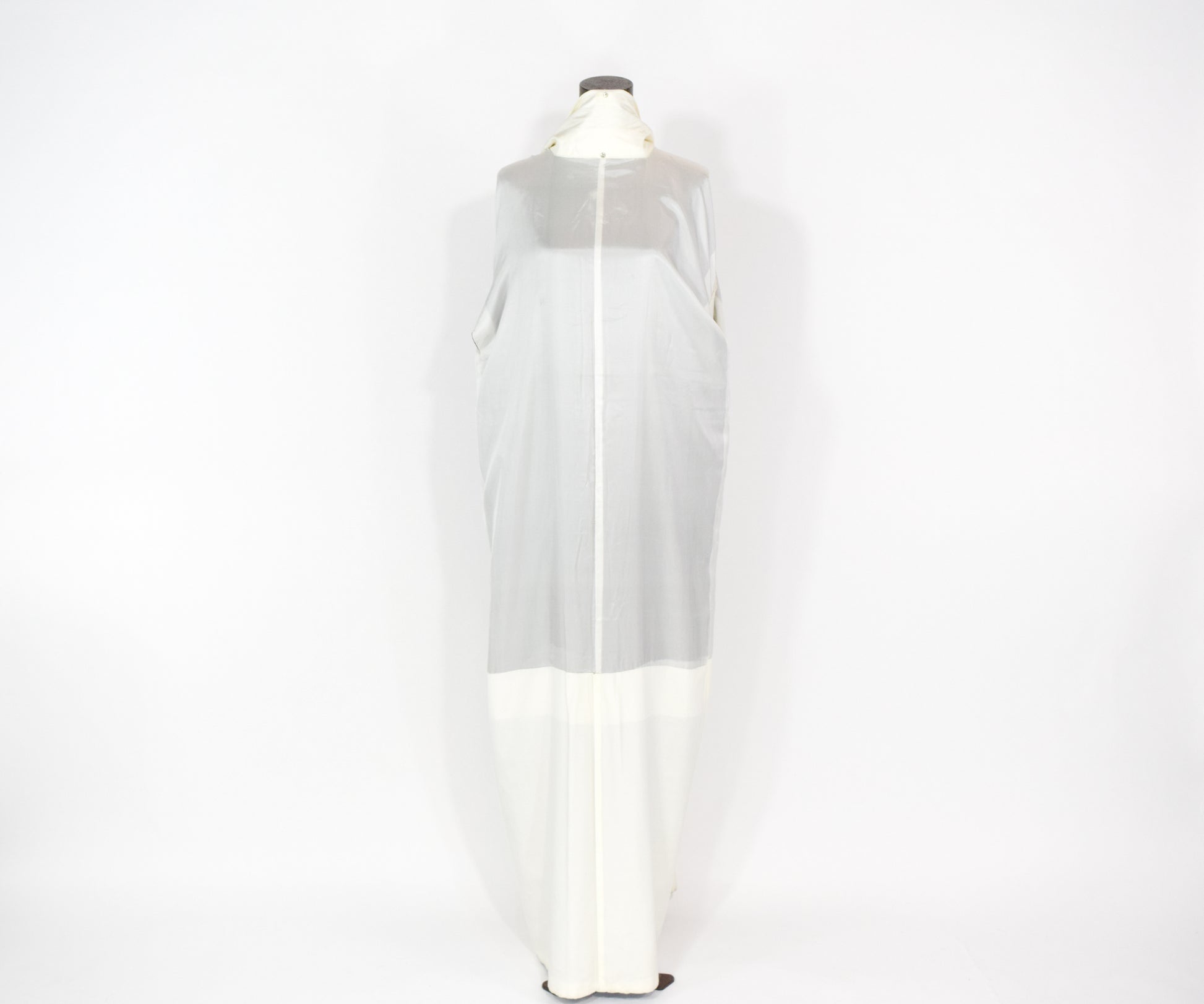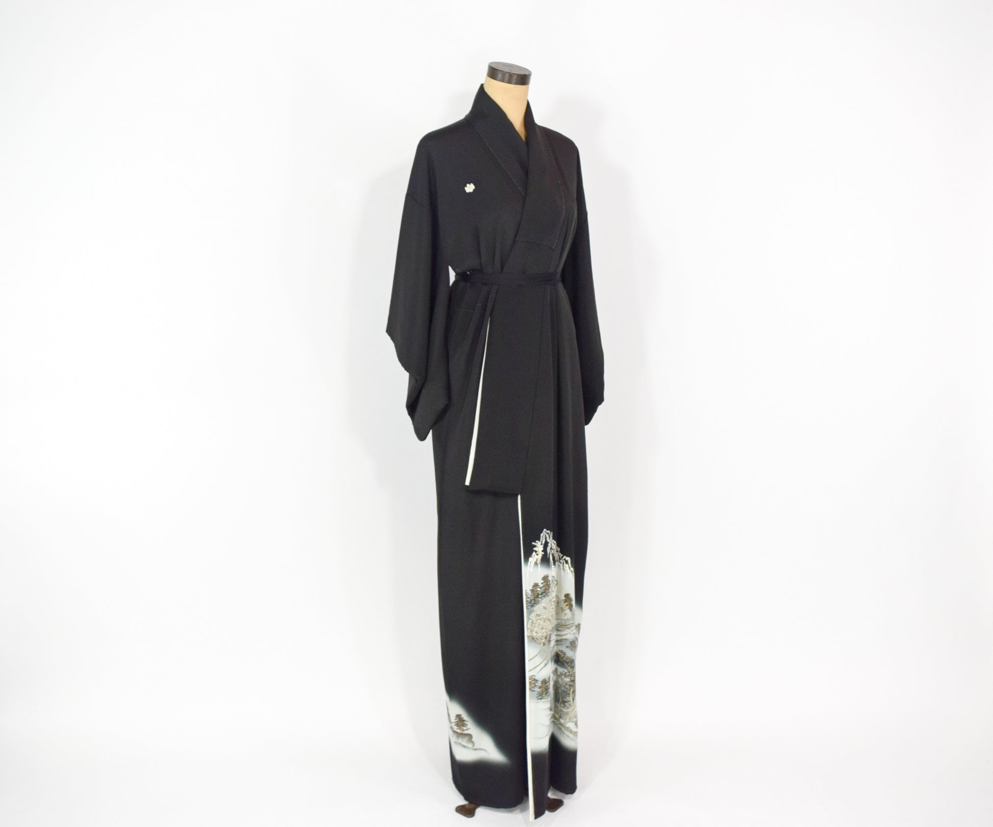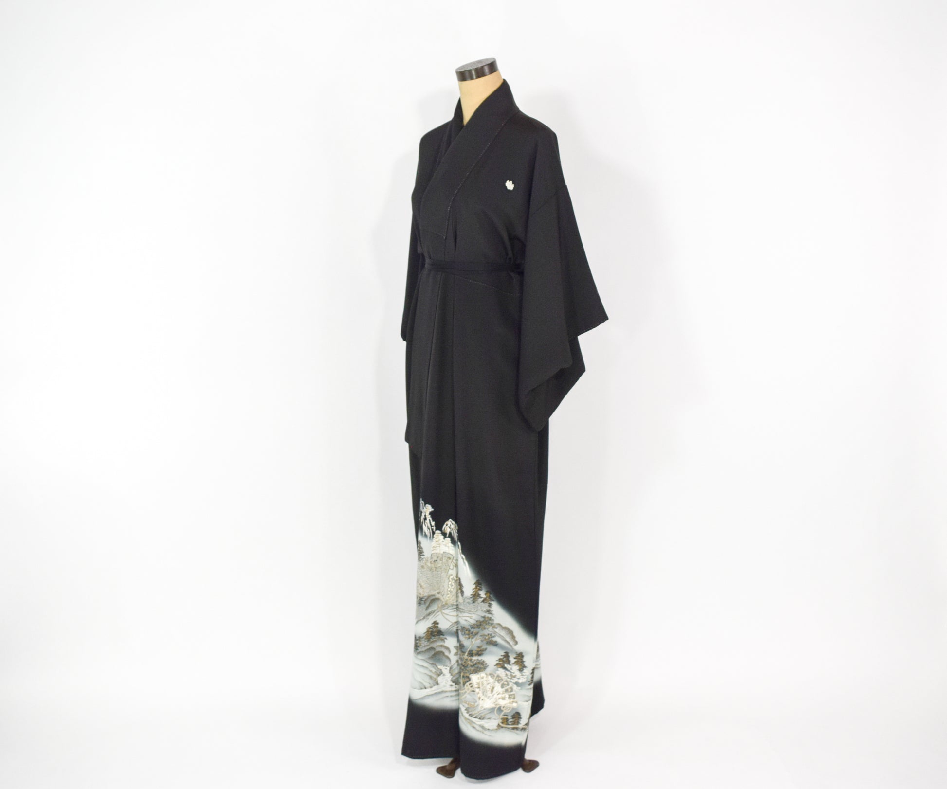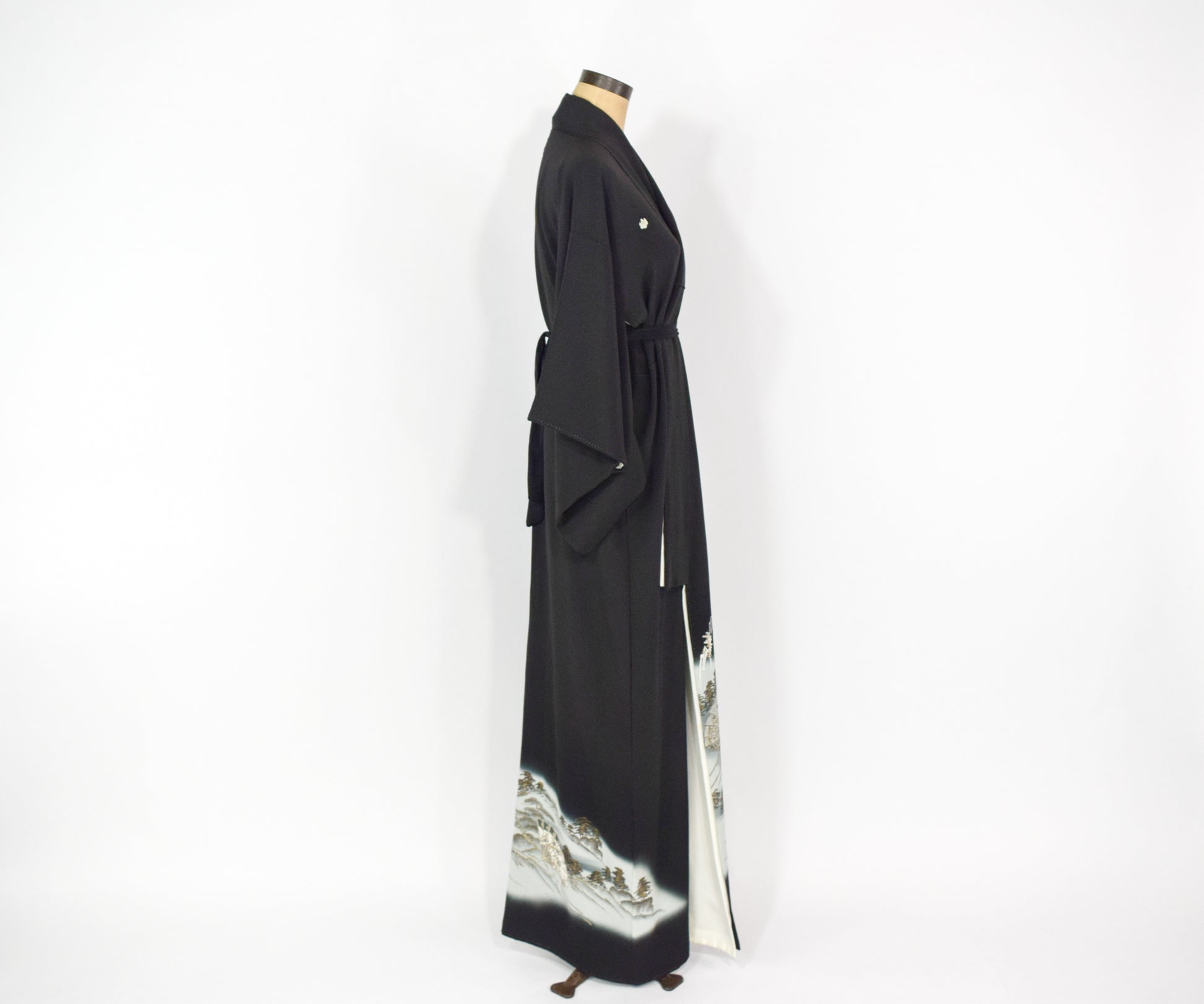 Extremely elegant black silk crepe with a stunning scenery print, metallic embroidery, and gold hand painting. Lined in white silk and crepe; there are some light spots on the white lining.