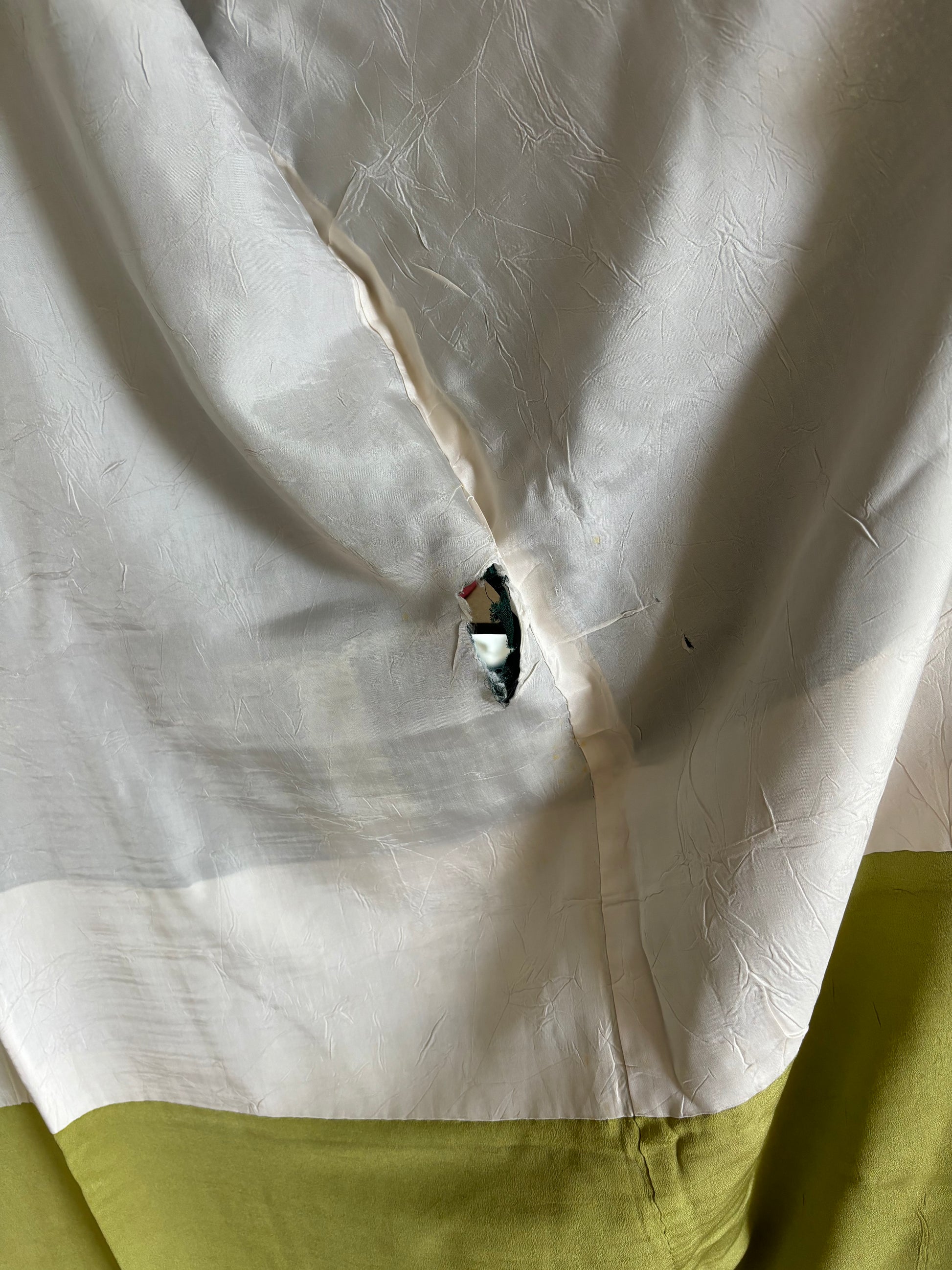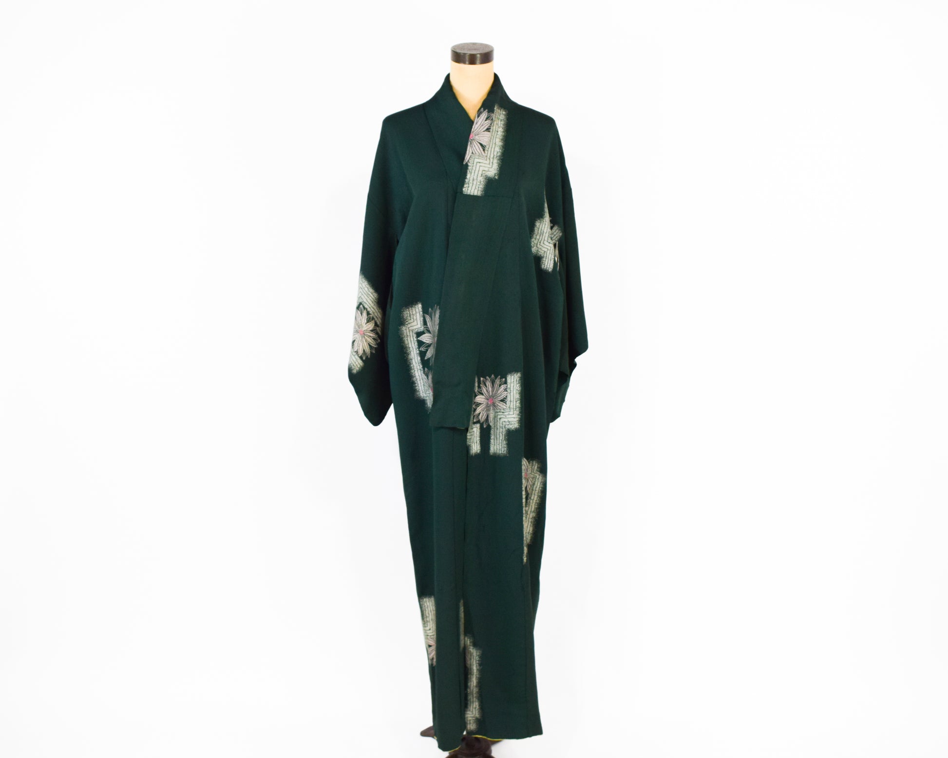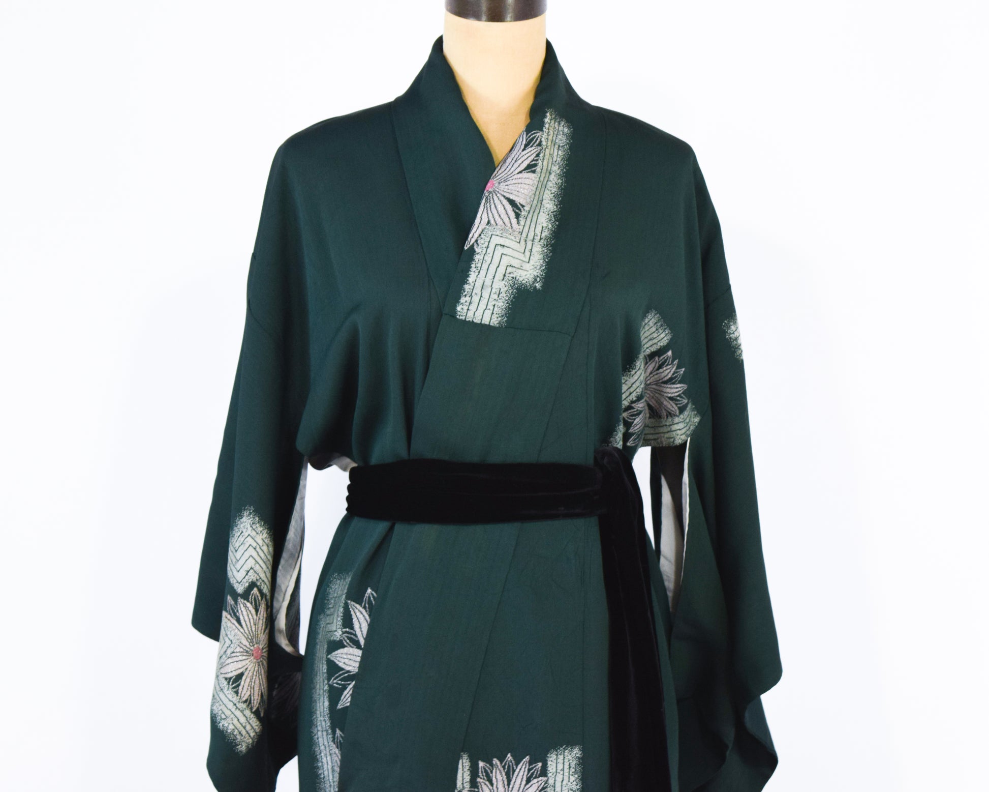 Hunter green and metallic silver floral kimono. Silk lining in chartreuse, white, pink silk. This beauty is not perfect; there is some staining on the lining and one hole in near the hem in the back.